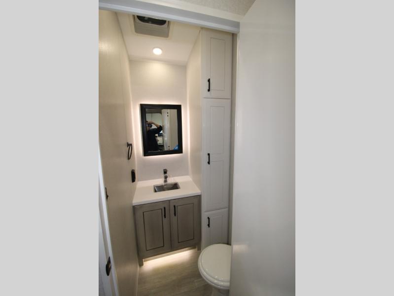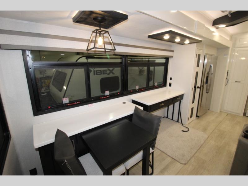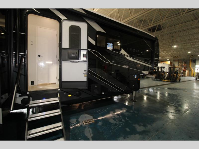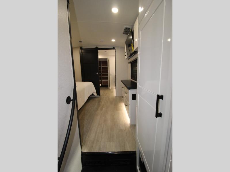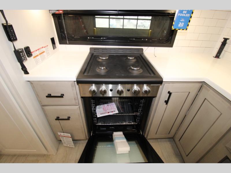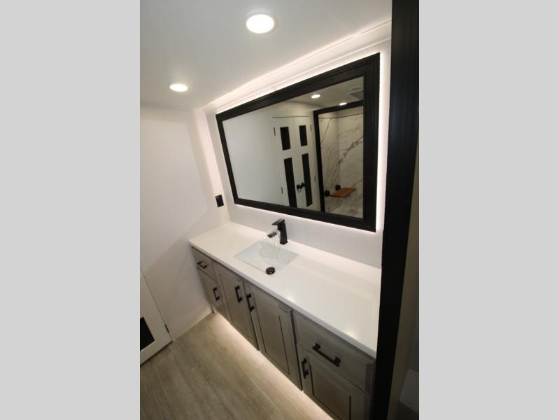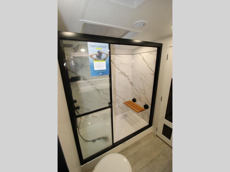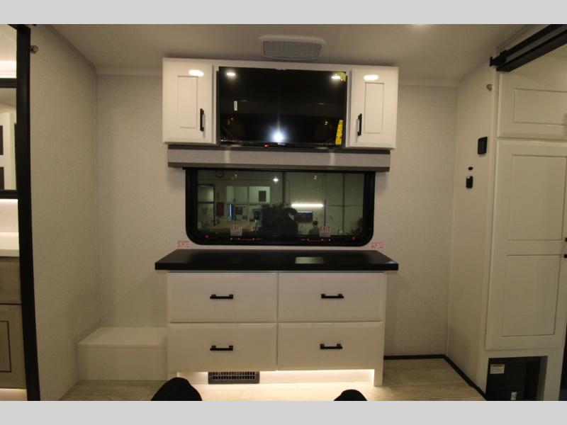 Triples slides, a desk/coffee bar, fireplace, and a huge master bath in front all indicate the kind of vacation you will experience in this Pinnacle Fifth Wheel! As you enter, a convenient half bath is located straight ahead. Slightly to your left, a nice seating area for gathering with family or friends to relax and watch TV, enjoy the fireplace while reading a book or watching a movie, and the dining table with chairs. The dinette slide also houses a 21 cu. ft. residential refrigerator and pantry. The rear kitchen features a u-shaped counter, all the appliances you need to cook like at home, even a pull-out butcher block space for chopping up your veggies. Back through and up the steps to your right in front, the master bedroom will make you feel like royalty with its king bed, plus luxurious full rear bath. A huge vanity with dual bath sinks will allow you both to get ready at the same time, plus there is a walk-in shower with a seat for added convenience. Speaking of walk-in, you will also love the spacious walk-in closet that includes washer/dryer prep.