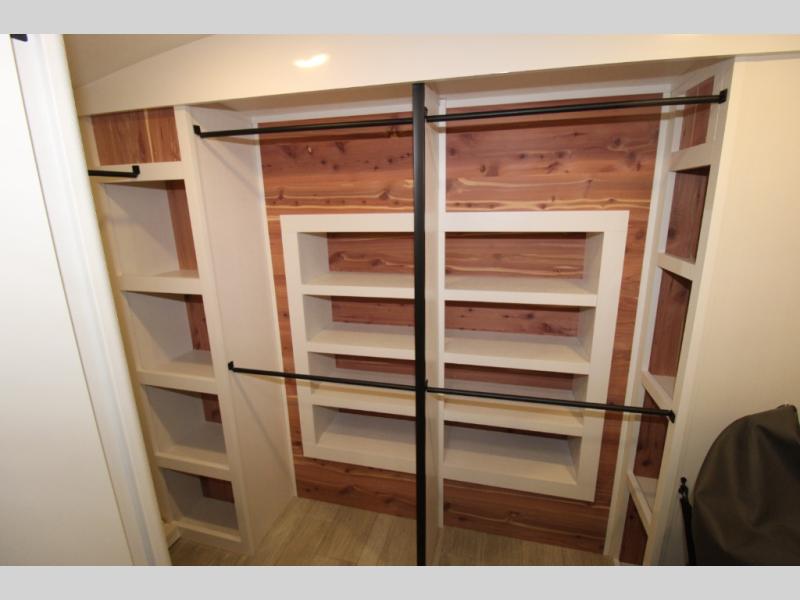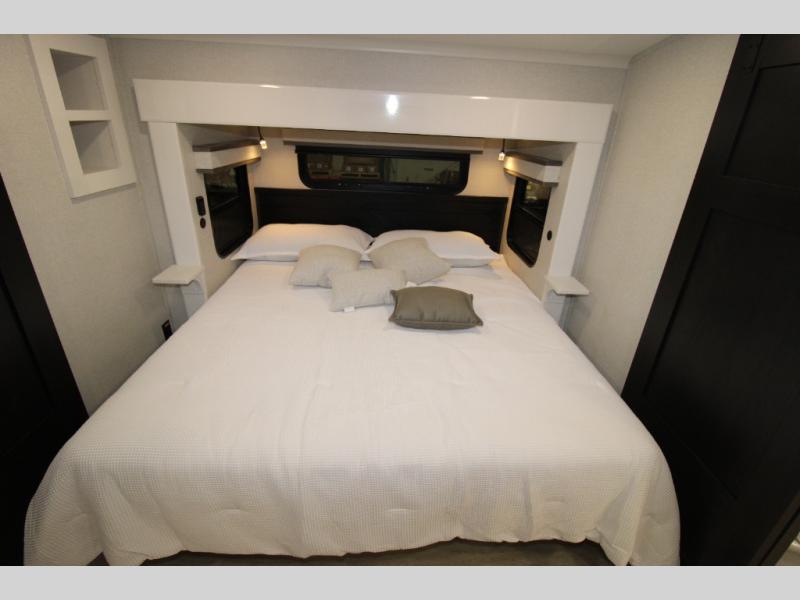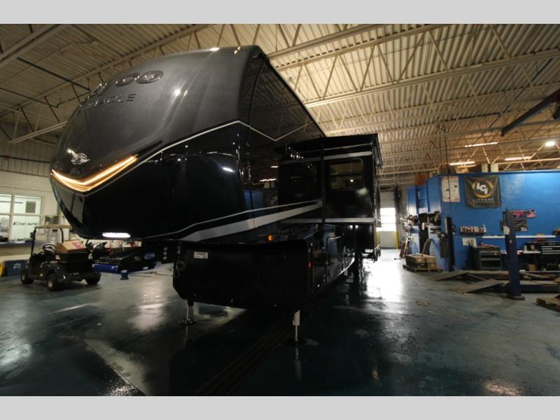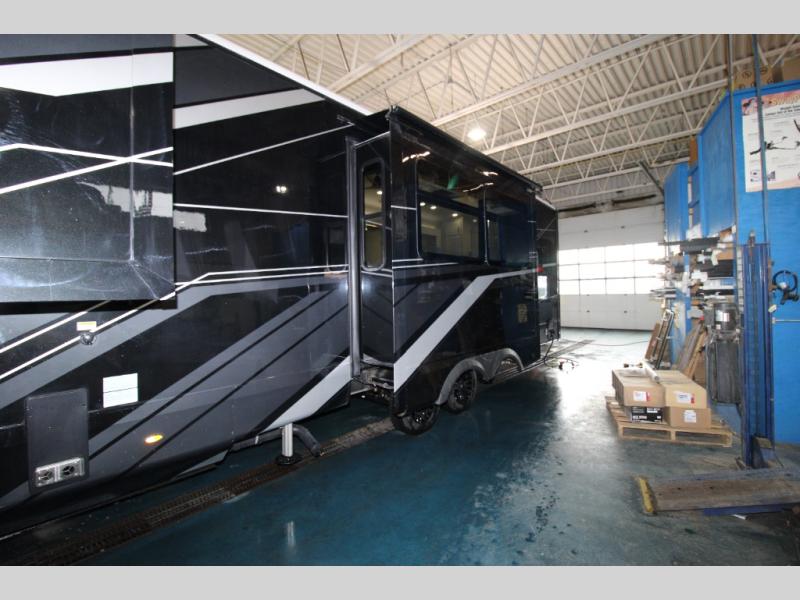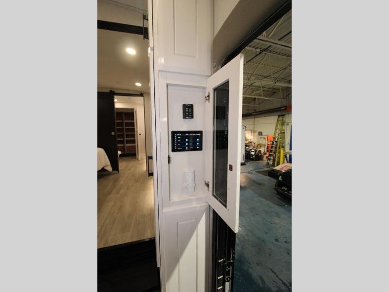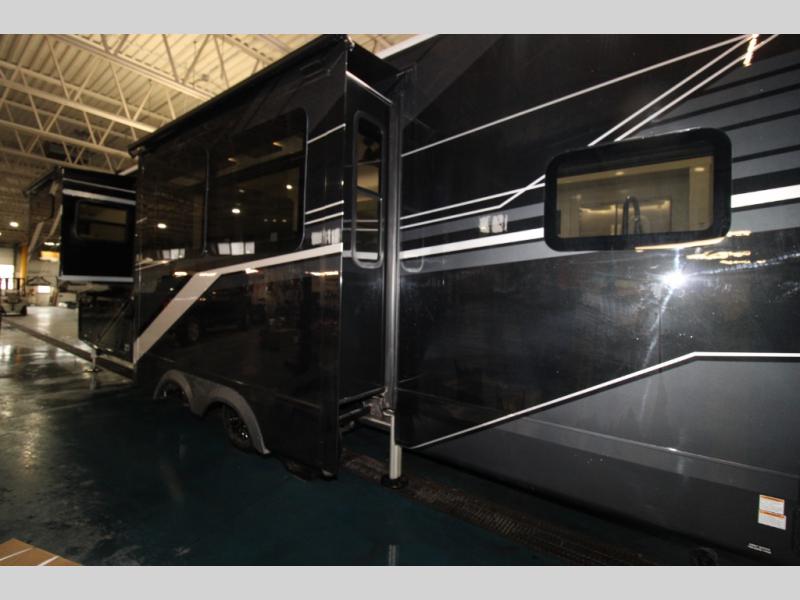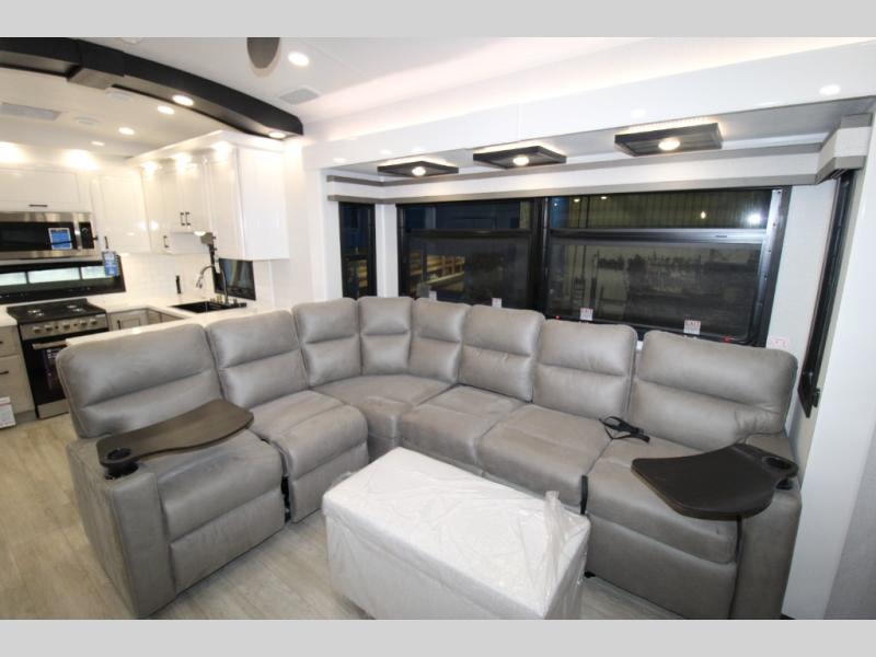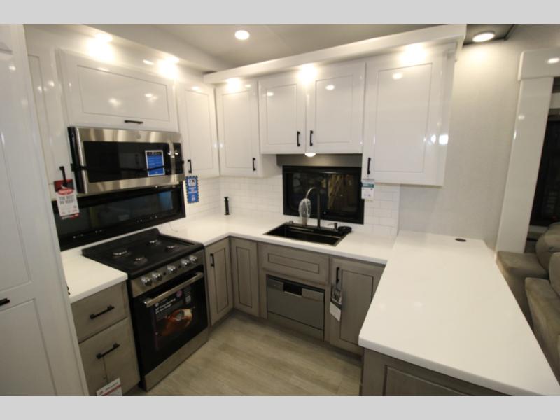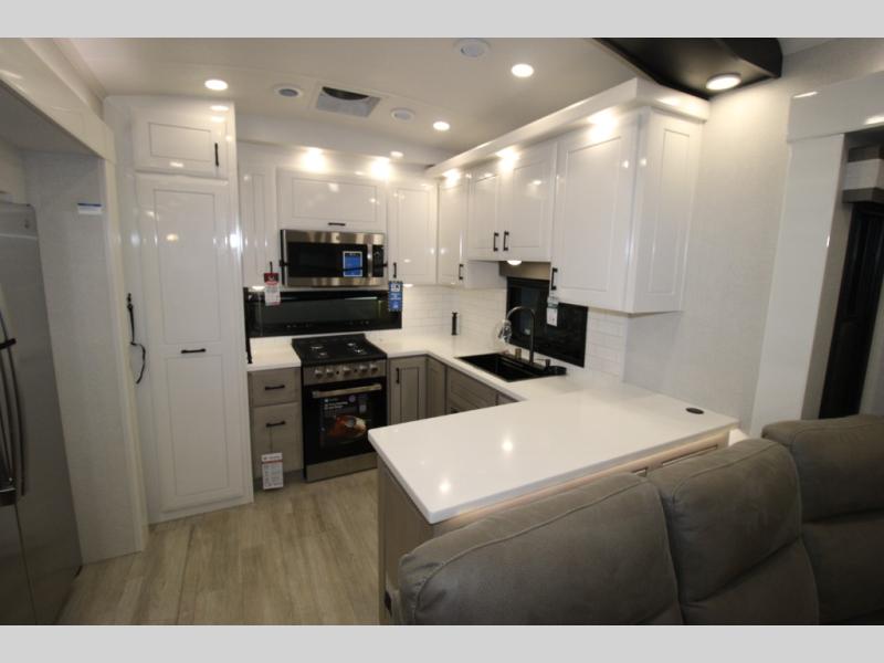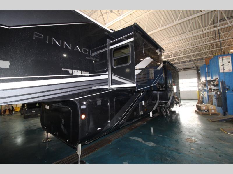Each Pinnacle fifth wheel features Stronghold VBL lamination for the lightest, yet strongest construction in the RV industry. Add that to the Magnum Truss XL6 roof system and Climate Shield zero-degree tested weather protection and you'll be enjoying your fifth wheel even in harsh weather. Some of the exterior conveniences you will appreciate are the Keyed-Alike lock system, the fully enclosed, universal docking center, and the 6-point hydraulic auto-leveling system for quick and easy set up. The 5 Star Handling Package will make towing a fifth wheel a walk in the park, and the two Whisper Quiet A/C units will keep you comfortable during the hot summer months. Inside, you'll enjoy the residential "Do it all" sink, the solid hardwood cabinet doors, stiles, and fascia, the vinyl flooring throughout, plus many more comforts. There is even a central vacuum system, a wireless remote-control system, 12V charging station, plus many more conveniences to make each trip enjoyable.