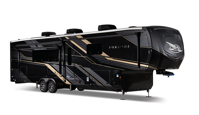 Each Pinnacle fifth wheel features Stronghold VBL lamination for the lightest, yet strongest construction in the RV industry. Add that to the Magnum Truss XL6 roof system and Climate Shield zero-degree tested weather protection and you'll be enjoying your fifth wheel for years to come. Some of the exterior conveniences you will appreciate are the Keyed-Alike lock system, the fully enclosed, universal docking center, and the 6-point hydraulic auto-leveling system for quick and easy set up. The 5 Star Handling Package will make towing a fifth wheel a walk in the park, and the two Whisper Quiet A/C units will keep you comfortable during the hot summer months. Inside, you'll enjoy the residential "Do it all" sink with pull-out kitchen faucet, glass rinse, and vegetable rinse, the handcrafted hardwood glazed cabinetry, the vinyl flooring throughout, plus many more comforts. There is even a central vacuum system, a wireless remote control system, USB ports throughout, plus many more conveniences to make each trip enjoyable.