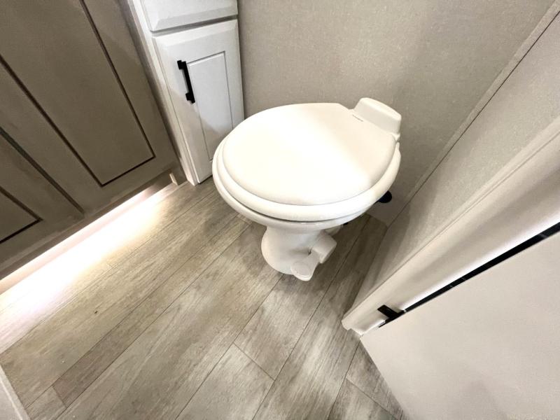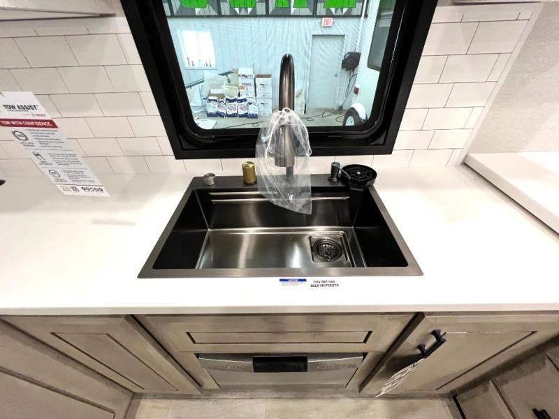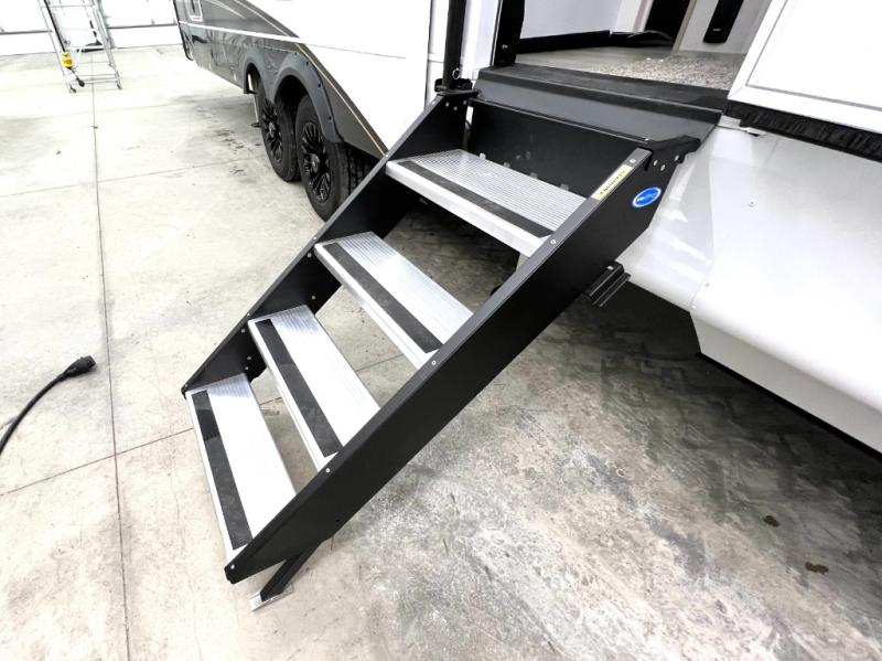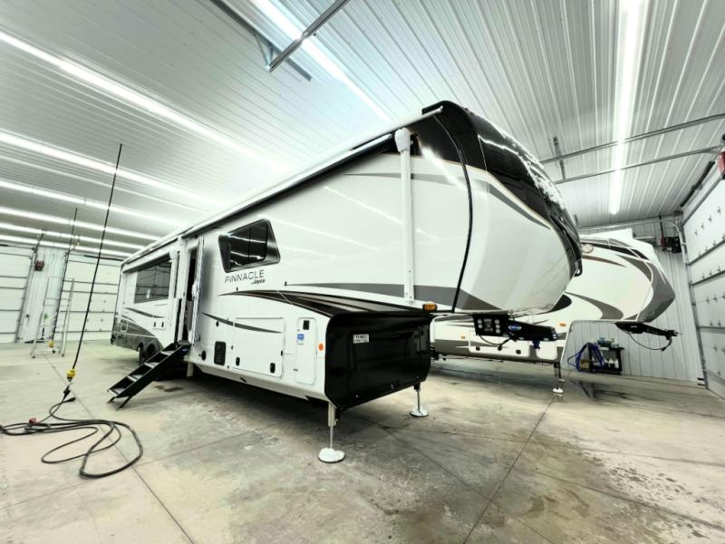 Each Pinnacle fifth wheel features Stronghold VBL lamination for the lightest, yet strongest construction in the RV industry. Add that to the Magnum Truss XL6 roof system and Climate Shield zero-degree tested weather protection and you'll be enjoying your fifth wheel even in harsh weather. Some of the exterior conveniences you will appreciate are the Keyed-Alike lock system, the fully enclosed, universal docking center, and the 6-point hydraulic auto-leveling system for quick and easy set up. The 5 Star Handling Package will make towing a fifth wheel a walk in the park, and the two Whisper Quiet A/C units will keep you comfortable during the hot summer months. Inside, you'll enjoy the residential "Do it all" sink, the solid hardwood cabinet doors, stiles, and fascia, the vinyl flooring throughout, plus many more comforts. There is even a central vacuum system, a wireless remote-control system, 12V charging station, plus many more conveniences to make each trip enjoyable.