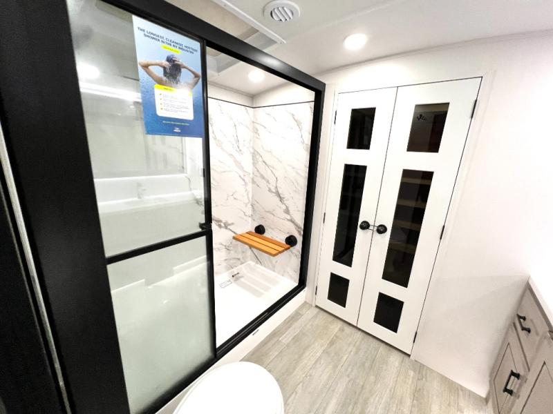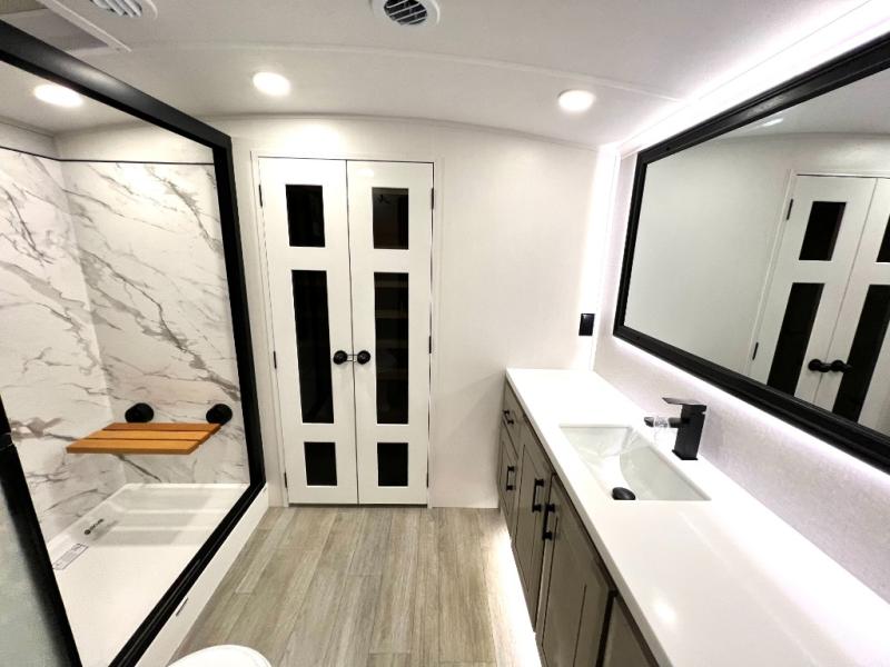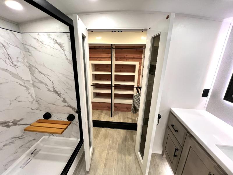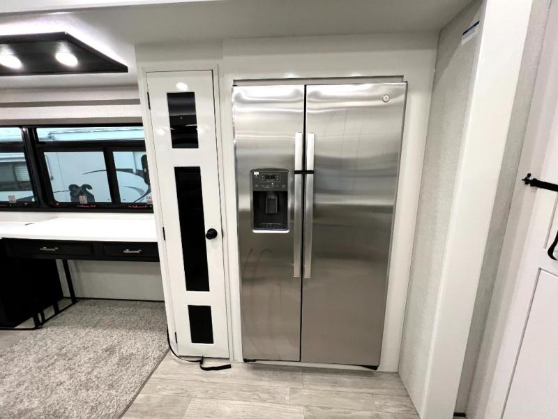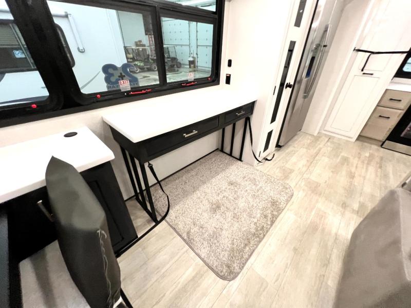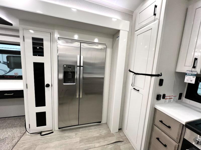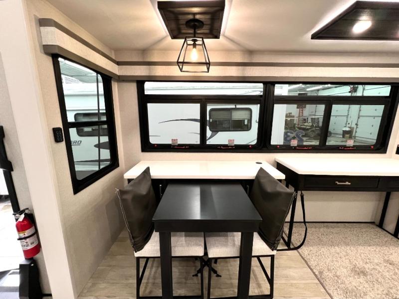 Triples slides, a desk/coffee bar, fireplace, and a huge master bath in front all indicate the kind of vacation you will experience in this Pinnacle Fifth Wheel! As you enter, a convenient half bath is located straight ahead. Slightly to your left, a nice seating area for gathering with family or friends to relax and watch TV, enjoy the fireplace while reading a book or watching a movie, and the dining table with chairs. The dinette slide also houses a 21 cu. ft. residential refrigerator and pantry. The rear kitchen features a u-shaped counter, all the appliances you need to cook like at home, even a pull-out butcher block space for chopping up your veggies. Back through and up the steps to your right in front, the master bedroom will make you feel like royalty with its king bed, plus luxurious full rear bath. A huge vanity with dual bath sinks will allow you both to get ready at the same time, plus there is a walk-in shower with a seat for added convenience. Speaking of walk-in, you will also love the spacious walk-in closet that includes washer/dryer prep.