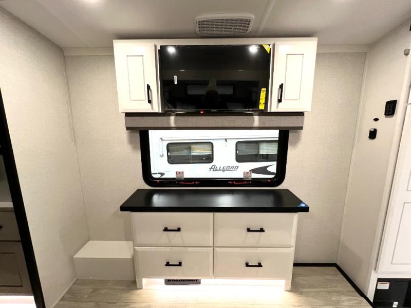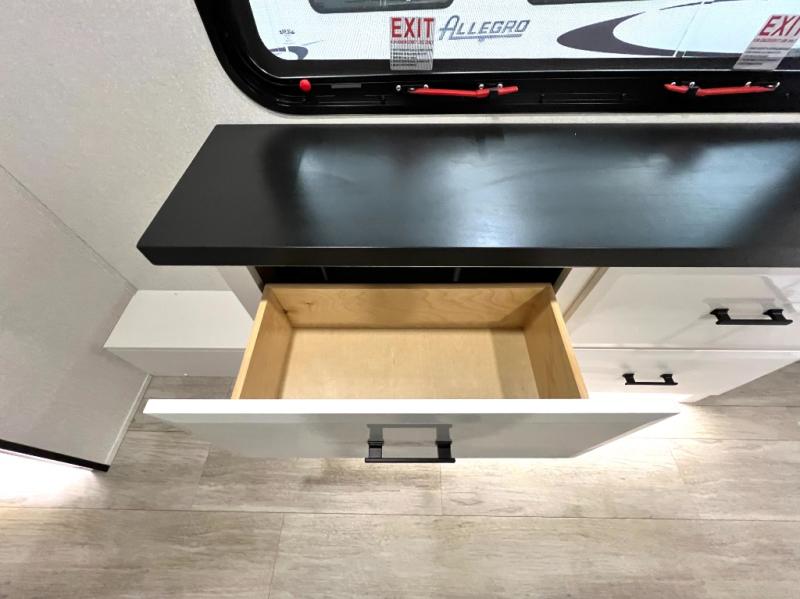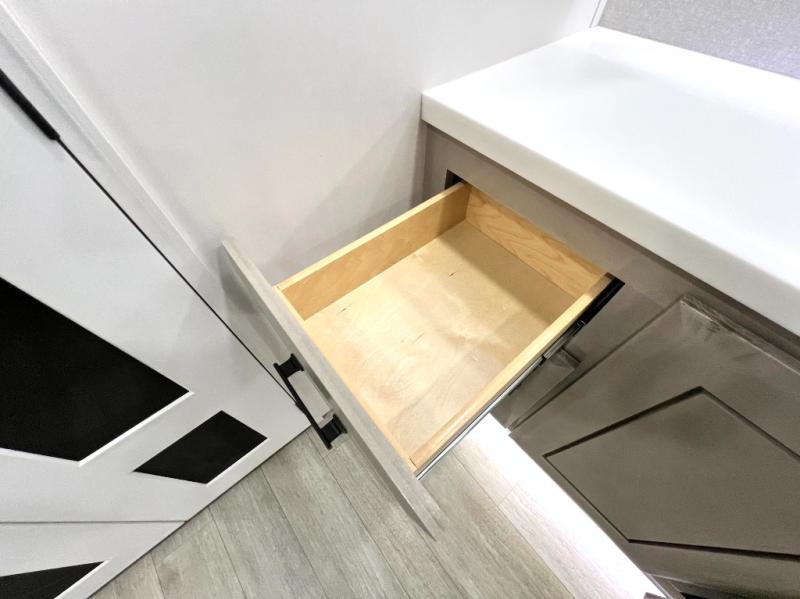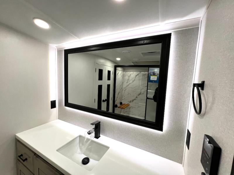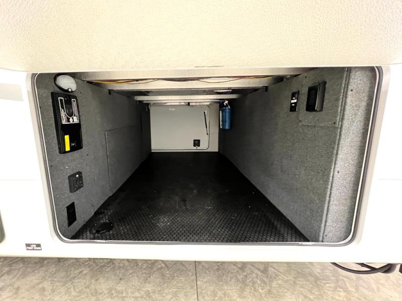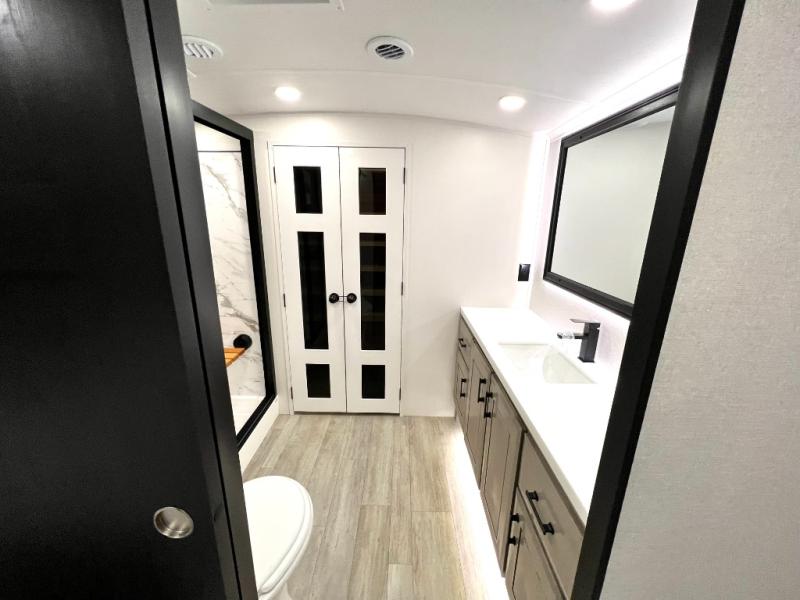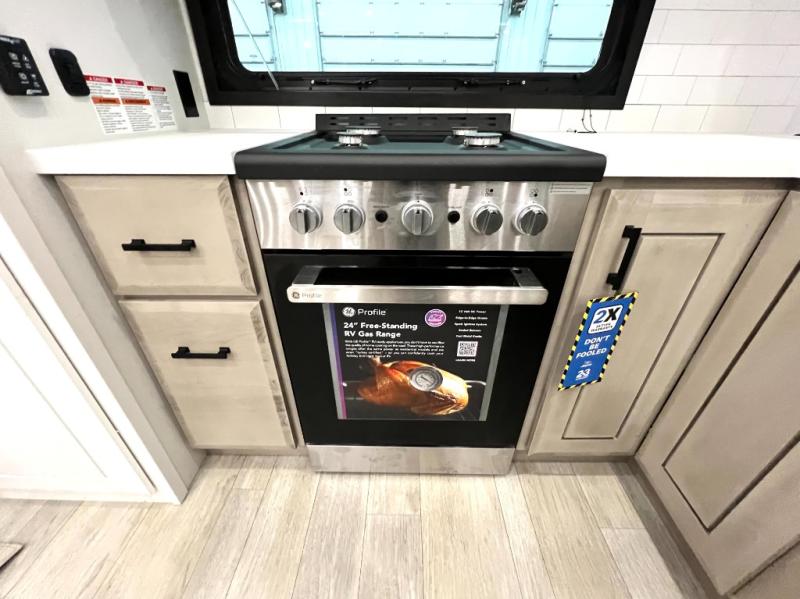 Triples slides, a desk/coffee bar, fireplace, and a huge master bath in front all indicate the kind of vacation you will experience in this Pinnacle Fifth Wheel! As you enter, a convenient half bath is located straight ahead. Slightly to your left, a nice seating area for gathering with family or friends to relax and watch TV, enjoy the fireplace while reading a book or watching a movie, and the dining table with chairs. The dinette slide also houses a 21 cu. ft. residential refrigerator and pantry. The rear kitchen features a u-shaped counter, all the appliances you need to cook like at home, even a pull-out butcher block space for chopping up your veggies. Back through and up the steps to your right in front, the master bedroom will make you feel like royalty with its king bed, plus luxurious full rear bath. A huge vanity with dual bath sinks will allow you both to get ready at the same time, plus there is a walk-in shower with a seat for added convenience. Speaking of walk-in, you will also love the spacious walk-in closet that includes washer/dryer prep.