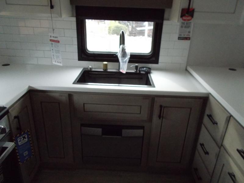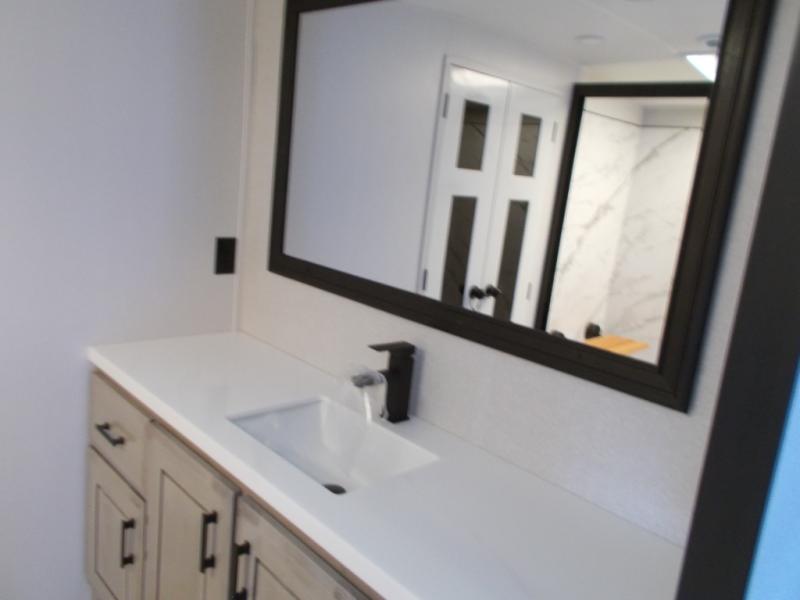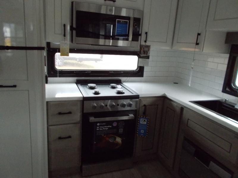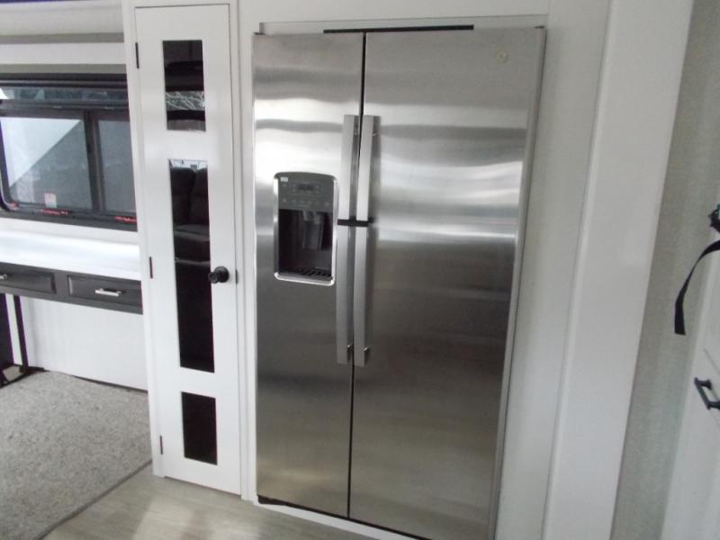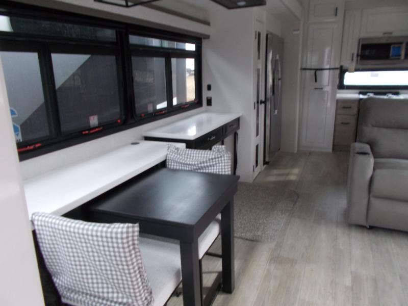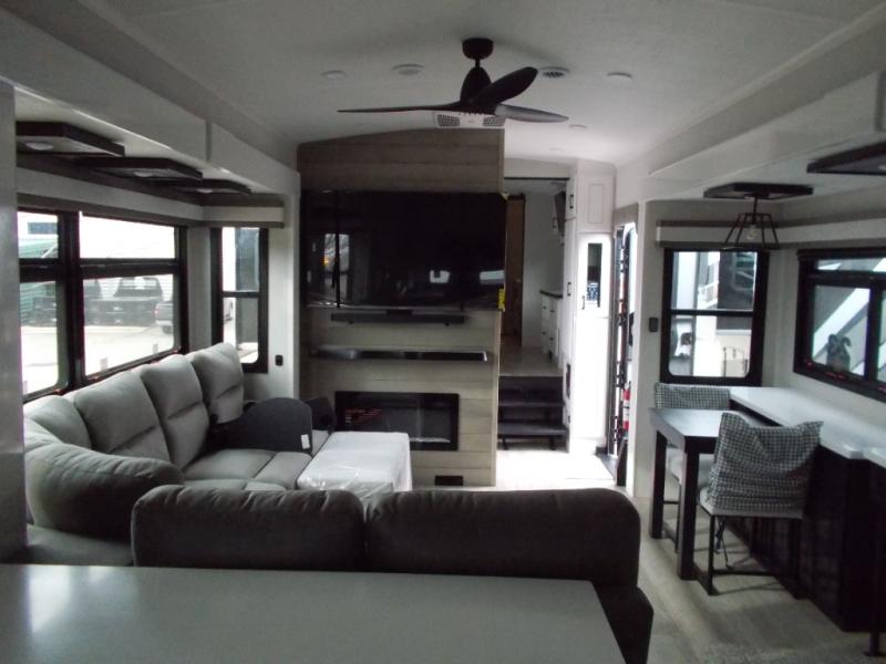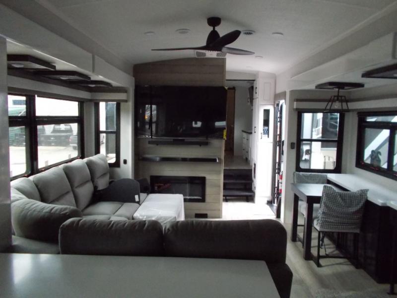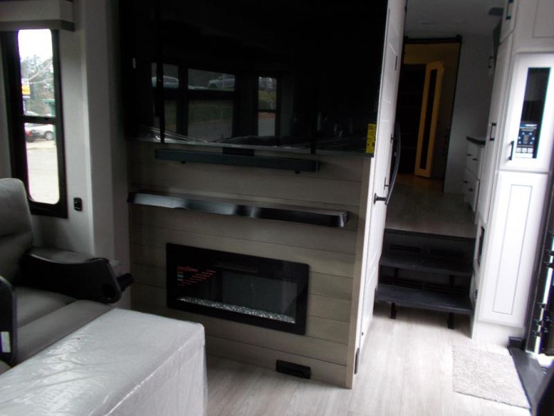 Triples slides, a desk/coffee bar, fireplace, and a huge master bath in front all indicate the kind of vacation you will experience in this Pinnacle Fifth Wheel! As you enter, a convenient half bath is located straight ahead. Slightly to your left, a nice seating area for gathering with family or friends to relax and watch TV, enjoy the fireplace while reading a book or watching a movie, and the dining table with chairs. The dinette slide also houses a 21 cu. ft. residential refrigerator and pantry. The rear kitchen features a u-shaped counter, all the appliances you need to cook like at home, even a pull-out butcher block space for chopping up your veggies. Back through and up the steps to your right in front, the master bedroom will make you feel like royalty with its king bed, plus luxurious full rear bath. A huge vanity with dual bath sinks will allow you both to get ready at the same time, plus there is a walk-in shower with a seat for added convenience. Speaking of walk-in, you will also love the spacious walk-in closet that includes washer/dryer prep.