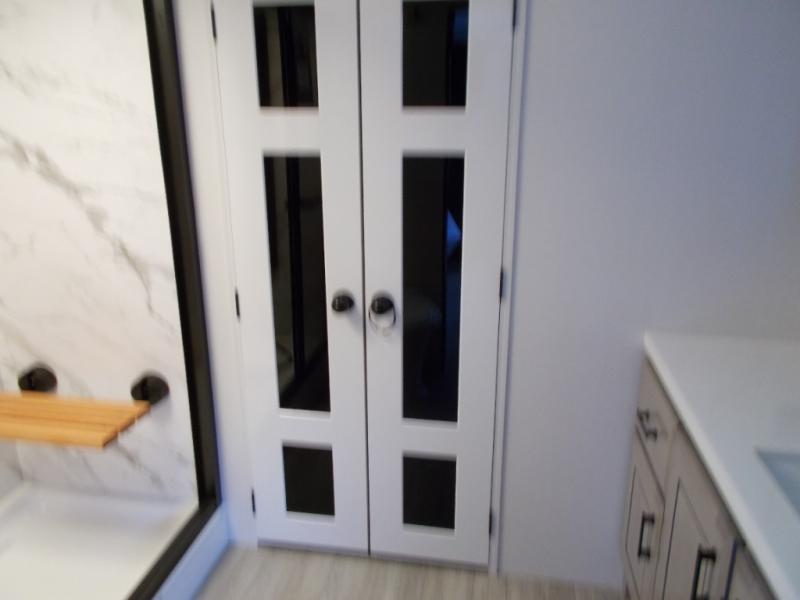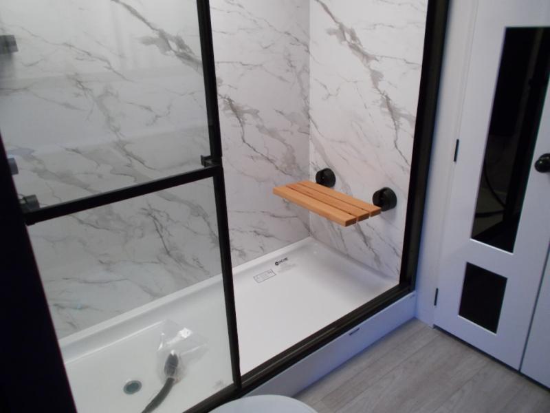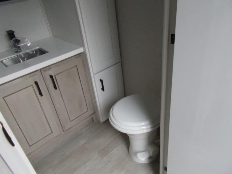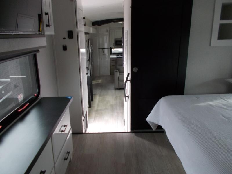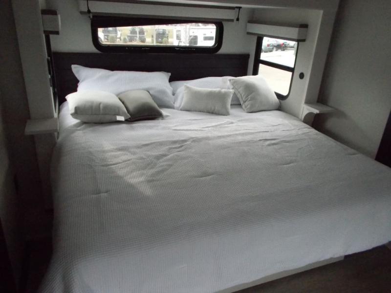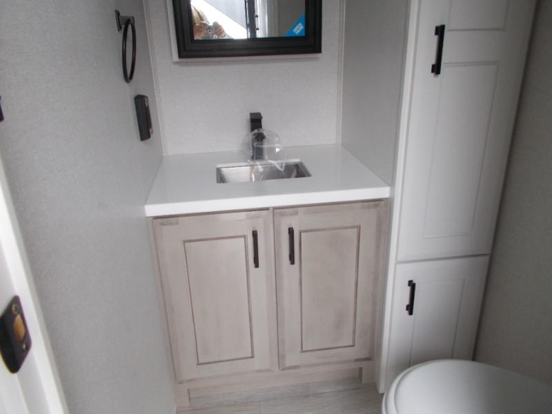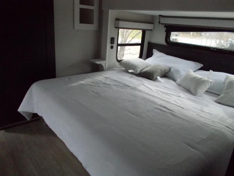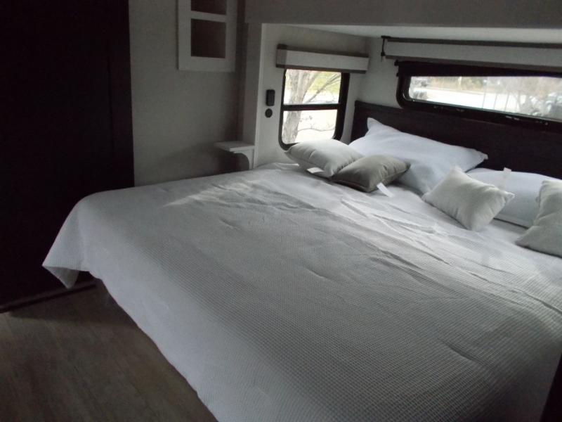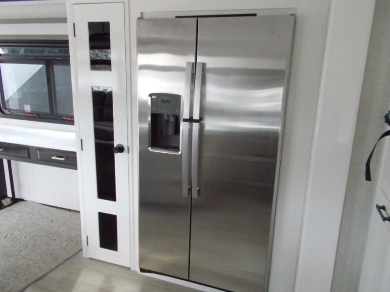 Triples slides, a desk/coffee bar, fireplace, and a huge master bath in front all indicate the kind of vacation you will experience in this Pinnacle Fifth Wheel! As you enter, a convenient half bath is located straight ahead. Slightly to your left, a nice seating area for gathering with family or friends to relax and watch TV, enjoy the fireplace while reading a book or watching a movie, and the dining table with chairs. The dinette slide also houses a 21 cu. ft. residential refrigerator and pantry. The rear kitchen features a u-shaped counter, all the appliances you need to cook like at home, even a pull-out butcher block space for chopping up your veggies. Back through and up the steps to your right in front, the master bedroom will make you feel like royalty with its king bed, plus luxurious full rear bath. A huge vanity with dual bath sinks will allow you both to get ready at the same time, plus there is a walk-in shower with a seat for added convenience. Speaking of walk-in, you will also love the spacious walk-in closet that includes washer/dryer prep.