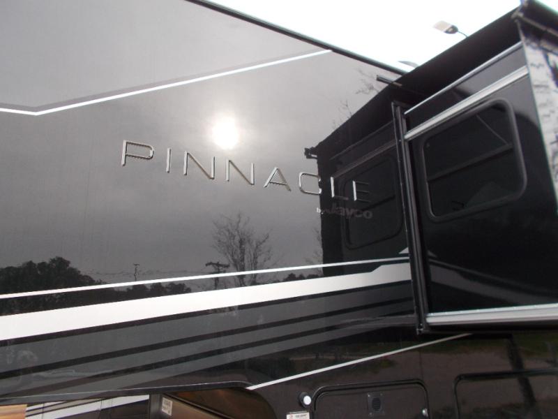 Each Pinnacle fifth wheel features Stronghold VBL lamination for the lightest, yet strongest construction in the RV industry. Add that to the Magnum Truss XL6 roof system and Climate Shield zero-degree tested weather protection and you'll be enjoying your fifth wheel for years to come. Some of the exterior conveniences you will appreciate are the Keyed-Alike lock system, the fully enclosed, universal docking center, and the 6-point hydraulic auto-leveling system for quick and easy set up. The 5 Star Handling Package will make towing a fifth wheel a walk in the park, and the two Whisper Quiet A/C units will keep you comfortable during the hot summer months. Inside, you'll enjoy the residential "Do it all" sink with pull-out kitchen faucet, glass rinse, and vegetable rinse, the handcrafted hardwood glazed cabinetry, the vinyl flooring throughout, plus many more comforts. There is even a central vacuum system, a wireless remote control system, USB ports throughout, plus many more conveniences to make each trip enjoyable.