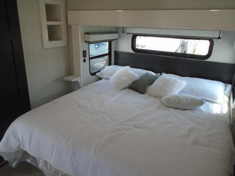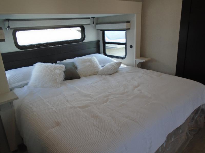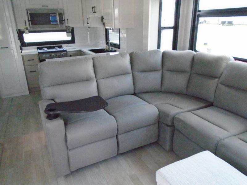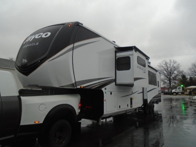 Each Pinnacle fifth wheel features Stronghold VBL lamination for the lightest, yet strongest construction in the RV industry. Add that to the Magnum Truss XL6 roof system and Climate Shield zero-degree tested weather protection and you'll be enjoying your fifth wheel even in harsh weather. Some of the exterior conveniences you will appreciate are the Keyed-Alike lock system, the fully enclosed, universal docking center, and the 6-point hydraulic auto-leveling system for quick and easy set up. The 5 Star Handling Package will make towing a fifth wheel a walk in the park, and the two Whisper Quiet A/C units will keep you comfortable during the hot summer months. Inside, you'll enjoy the residential "Do it all" sink, the solid hardwood cabinet doors, stiles, and fascia, the vinyl flooring throughout, plus many more comforts. There is even a central vacuum system, a wireless remote-control system, 12V charging station, plus many more conveniences to make each trip enjoyable.