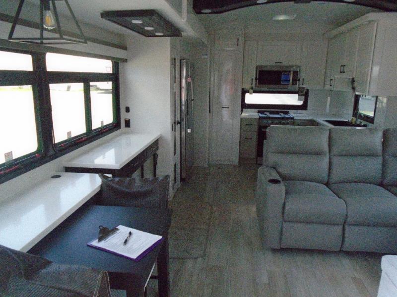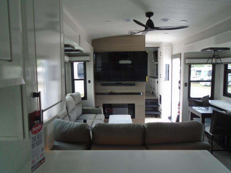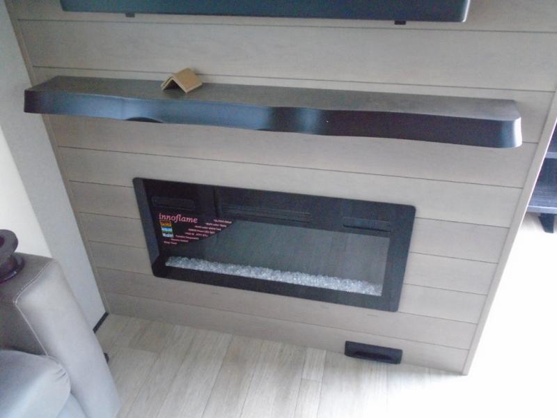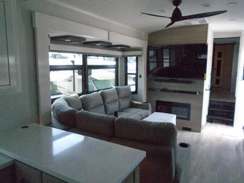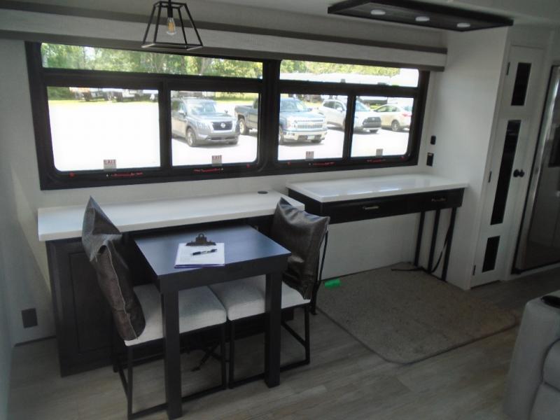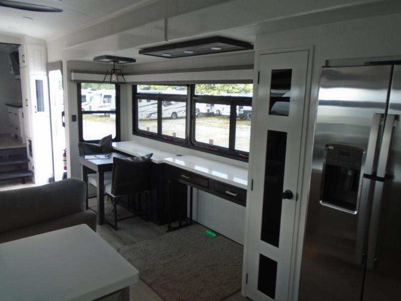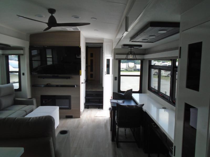 Triples slides, a desk/coffee bar, fireplace, and a huge master bath in front all indicate the kind of vacation you will experience in this Pinnacle Fifth Wheel! As you enter, a convenient half bath is located straight ahead. Slightly to your left, a nice seating area for gathering with family or friends to relax and watch TV, enjoy the fireplace while reading a book or watching a movie, and the dining table with chairs. The dinette slide also houses a 21 cu. ft. residential refrigerator and pantry. The rear kitchen features a u-shaped counter, all the appliances you need to cook like at home, even a pull-out butcher block space for chopping up your veggies. Back through and up the steps to your right in front, the master bedroom will make you feel like royalty with its king bed, plus luxurious full rear bath. A huge vanity with dual bath sinks will allow you both to get ready at the same time, plus there is a walk-in shower with a seat for added convenience. Speaking of walk-in, you will also love the spacious walk-in closet that includes washer/dryer prep.