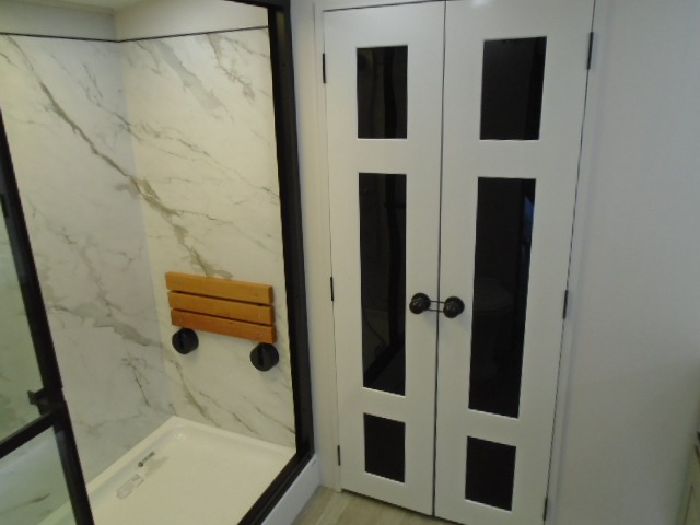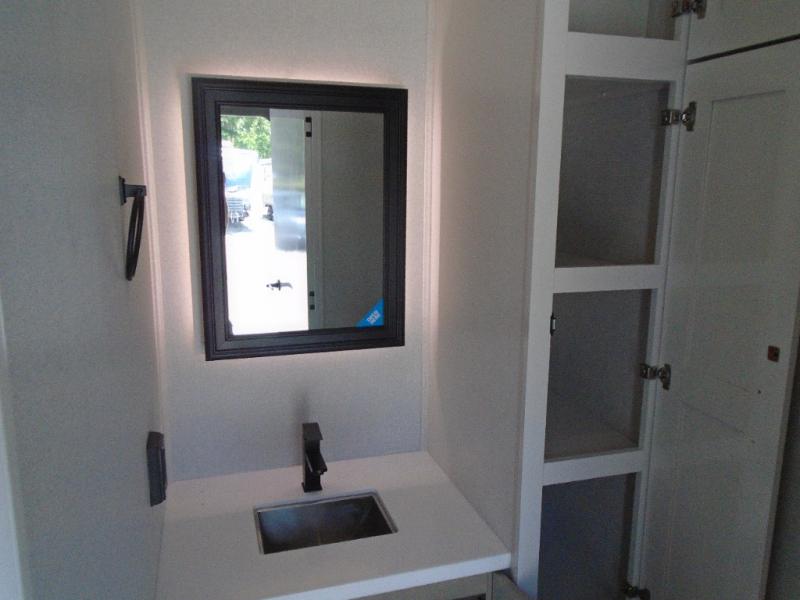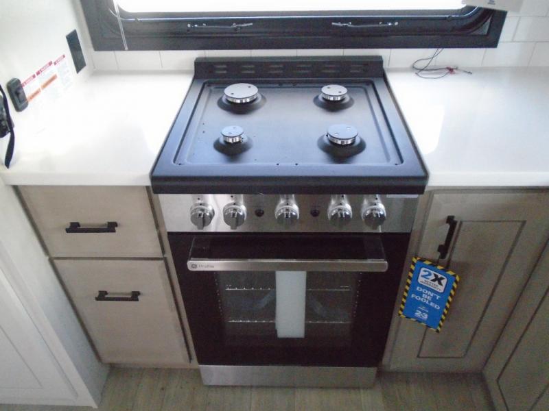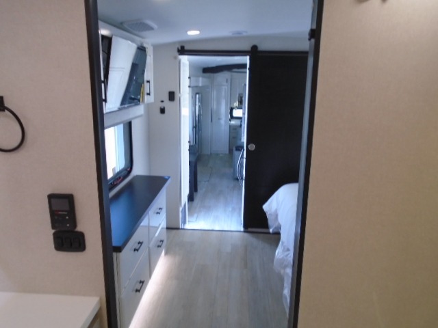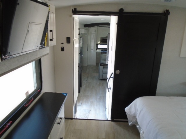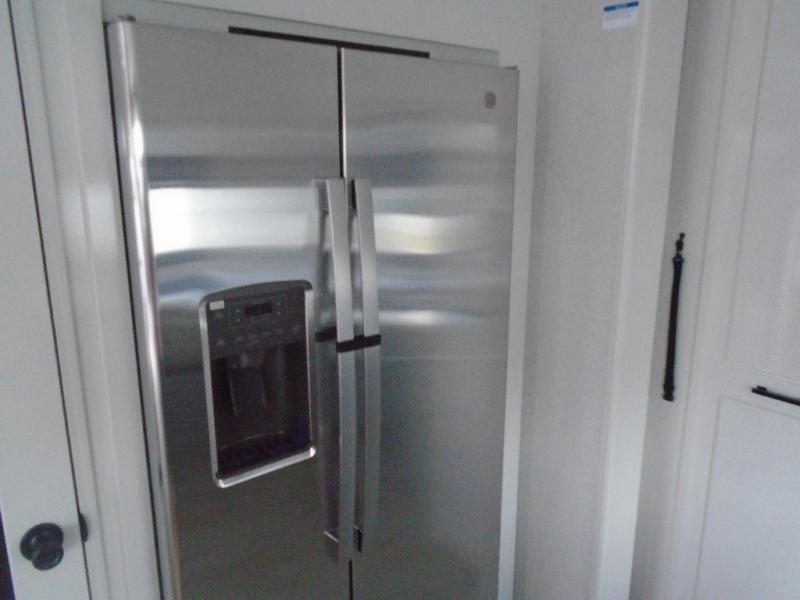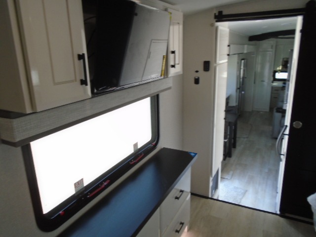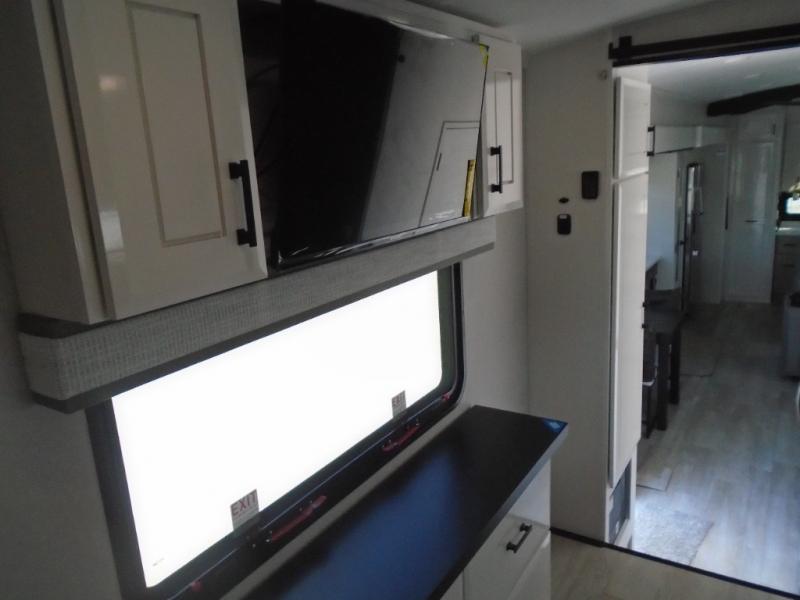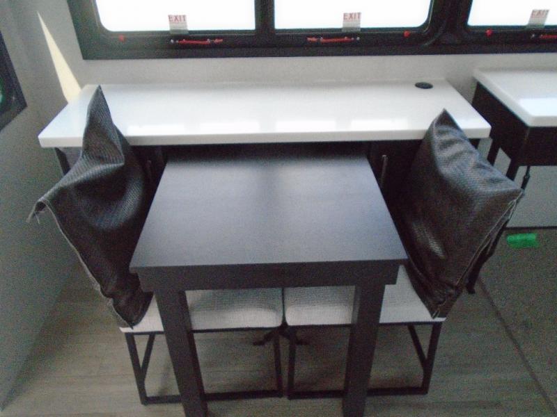 Triples slides, a desk/coffee bar, fireplace, and a huge master bath in front all indicate the kind of vacation you will experience in this Pinnacle Fifth Wheel! As you enter, a convenient half bath is located straight ahead. Slightly to your left, a nice seating area for gathering with family or friends to relax and watch TV, enjoy the fireplace while reading a book or watching a movie, and the dining table with chairs. The dinette slide also houses a 21 cu. ft. residential refrigerator and pantry. The rear kitchen features a u-shaped counter, all the appliances you need to cook like at home, even a pull-out butcher block space for chopping up your veggies. Back through and up the steps to your right in front, the master bedroom will make you feel like royalty with its king bed, plus luxurious full rear bath. A huge vanity with dual bath sinks will allow you both to get ready at the same time, plus there is a walk-in shower with a seat for added convenience. Speaking of walk-in, you will also love the spacious walk-in closet that includes washer/dryer prep.
