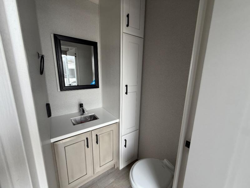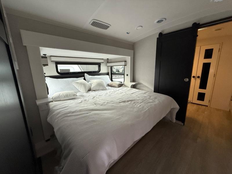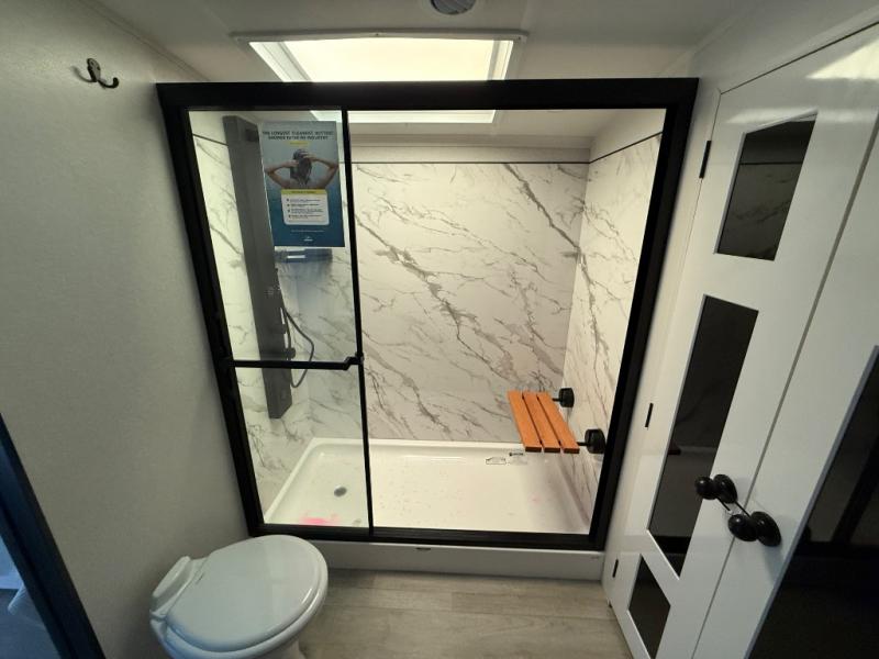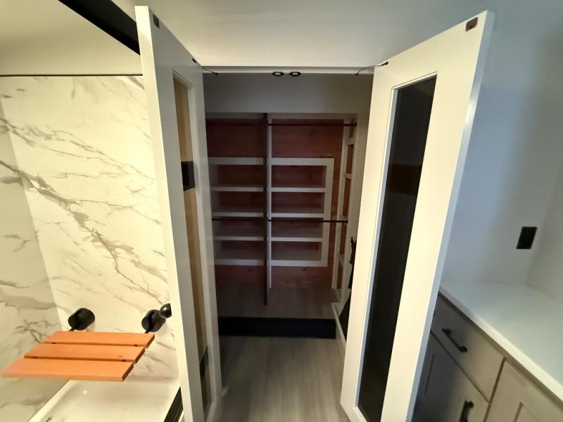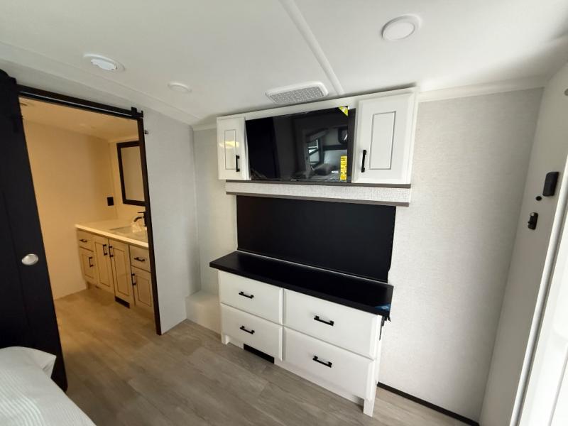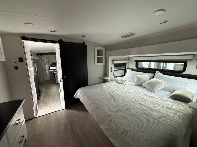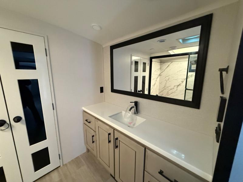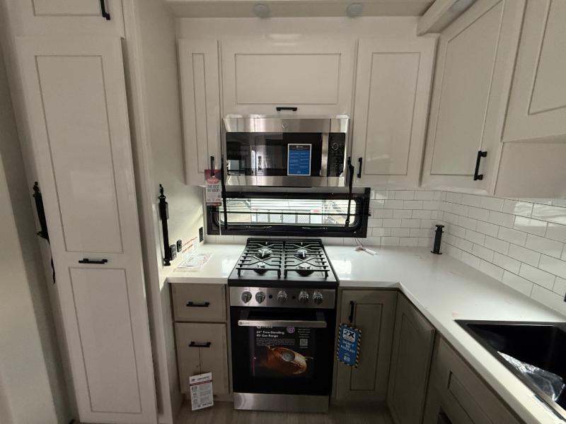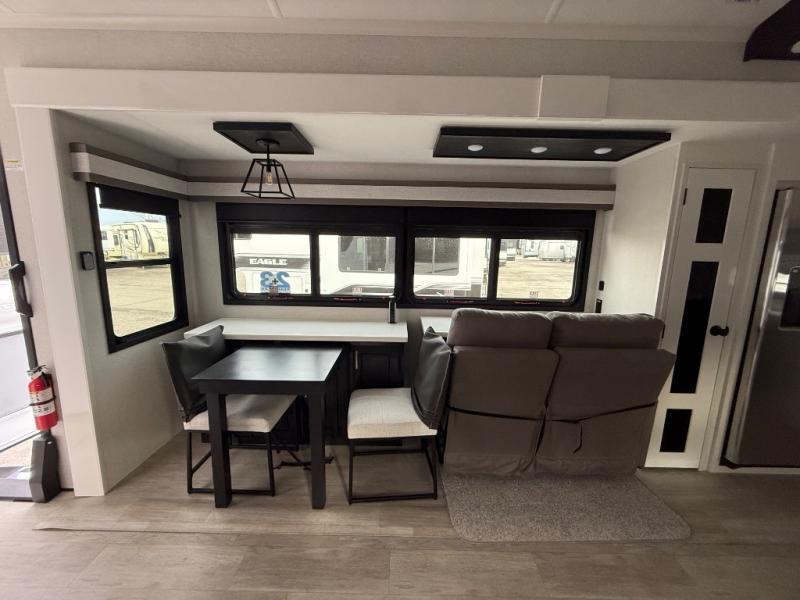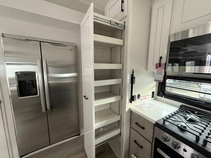 Triples slides, a desk/coffee bar, fireplace, and a huge master bath in front all indicate the kind of vacation you will experience in this Pinnacle Fifth Wheel! As you enter, a convenient half bath is located straight ahead. Slightly to your left, a nice seating area for gathering with family or friends to relax and watch TV, enjoy the fireplace while reading a book or watching a movie, and the dining table with chairs. The dinette slide also houses a 21 cu. ft. residential refrigerator and pantry. The rear kitchen features a u-shaped counter, all the appliances you need to cook like at home, even a pull-out butcher block space for chopping up your veggies. Back through and up the steps to your right in front, the master bedroom will make you feel like royalty with its king bed, plus luxurious full rear bath. A huge vanity with dual bath sinks will allow you both to get ready at the same time, plus there is a walk-in shower with a seat for added convenience. Speaking of walk-in, you will also love the spacious walk-in closet that includes washer/dryer prep.
