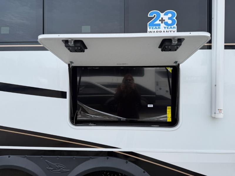 Each Pinnacle fifth wheel features Stronghold VBL lamination for the lightest, yet strongest construction in the RV industry. Add that to the Magnum Truss XL6 roof system and Climate Shield zero-degree tested weather protection and you'll be enjoying your fifth wheel even in harsh weather. Some of the exterior conveniences you will appreciate are the Keyed-Alike lock system, the fully enclosed, universal docking center, and the 6-point hydraulic auto-leveling system for quick and easy set up. The 5 Star Handling Package will make towing a fifth wheel a walk in the park, and the two Whisper Quiet A/C units will keep you comfortable during the hot summer months. Inside, you'll enjoy the residential "Do it all" sink, the solid hardwood cabinet doors, stiles, and fascia, the vinyl flooring throughout, plus many more comforts. There is even a central vacuum system, a wireless remote-control system, 12V charging station, plus many more conveniences to make each trip enjoyable.