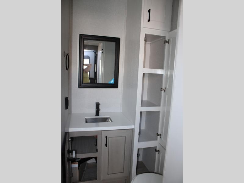 Triples slides, a desk/coffee bar, fireplace, and a huge master bath in front all indicate the kind of vacation you will experience in this Pinnacle Fifth Wheel! As you enter, a convenient half bath is located straight ahead. Slightly to your left, a nice seating area for gathering with family or friends to relax and watch TV, enjoy the fireplace while reading a book or watching a movie, and the dining table with chairs. The dinette slide also houses a 21 cu. ft. residential refrigerator and pantry. The rear kitchen features a u-shaped counter, all the appliances you need to cook like at home, even a pull-out butcher block space for chopping up your veggies. Back through and up the steps to your right in front, the master bedroom will make you feel like royalty with its king bed, plus luxurious full rear bath. A huge vanity with dual bath sinks will allow you both to get ready at the same time, plus there is a walk-in shower with a seat for added convenience. Speaking of walk-in, you will also love the spacious walk-in closet that includes washer/dryer prep.