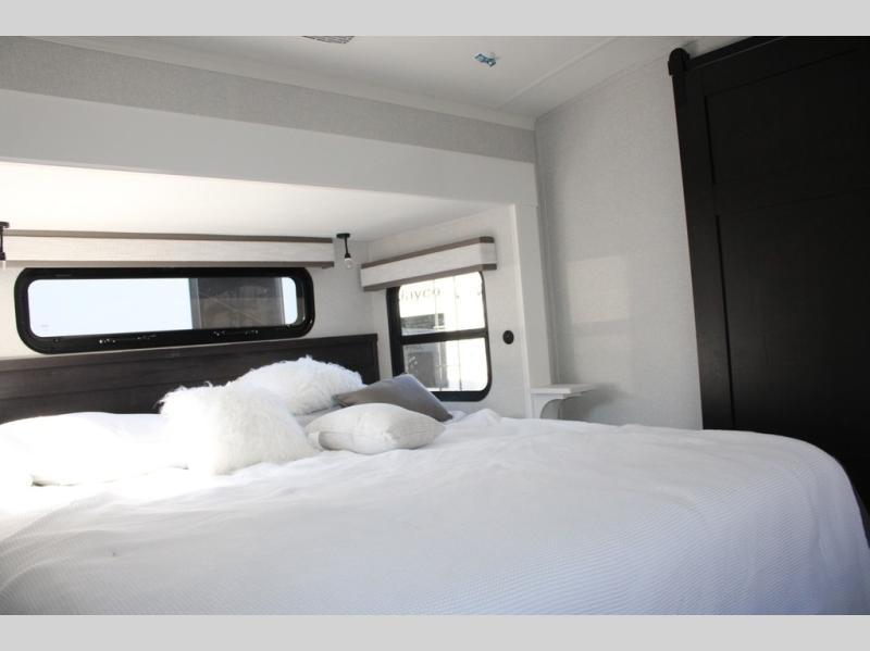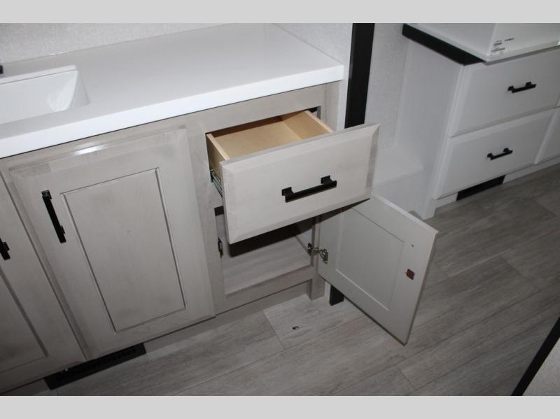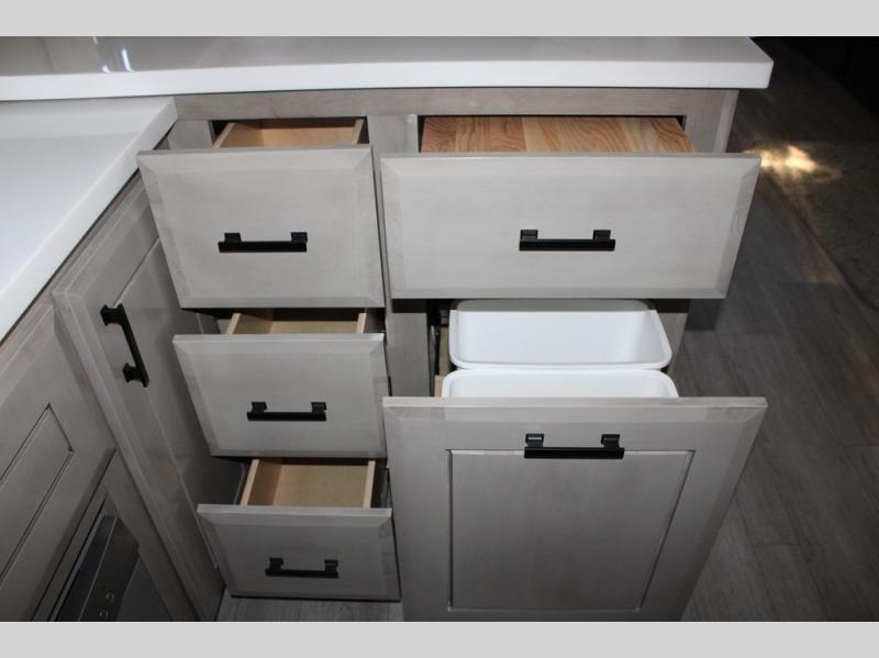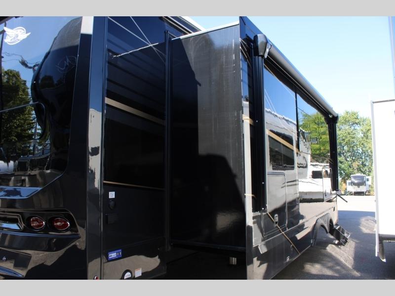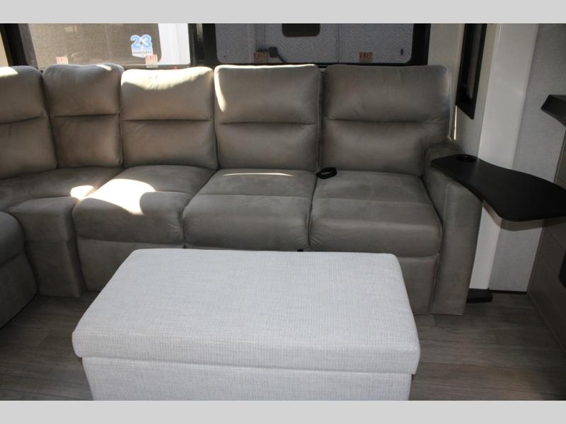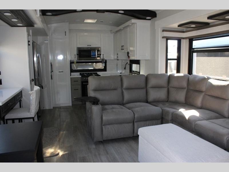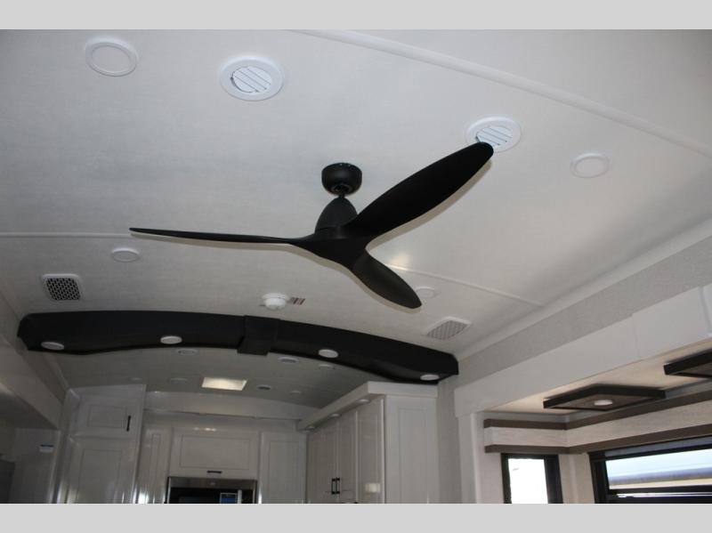 Each Pinnacle fifth wheel features Stronghold VBL lamination for the lightest, yet strongest construction in the RV industry. Add that to the Magnum Truss XL6 roof system and Climate Shield zero-degree tested weather protection and you'll be enjoying your fifth wheel even in harsh weather. Some of the exterior conveniences you will appreciate are the Keyed-Alike lock system, the fully enclosed, universal docking center, and the 6-point hydraulic auto-leveling system for quick and easy set up. The 5 Star Handling Package will make towing a fifth wheel a walk in the park, and the two Whisper Quiet A/C units will keep you comfortable during the hot summer months. Inside, you'll enjoy the residential "Do it all" sink, the solid hardwood cabinet doors, stiles, and fascia, the vinyl flooring throughout, plus many more comforts. There is even a central vacuum system, a wireless remote-control system, 12V charging station, plus many more conveniences to make each trip enjoyable.