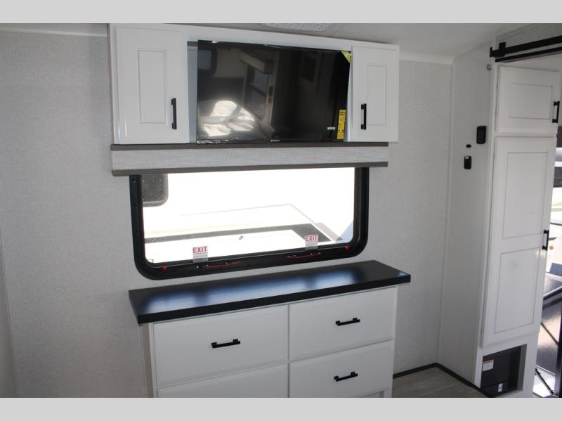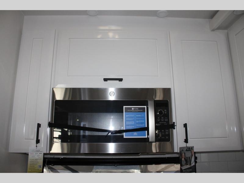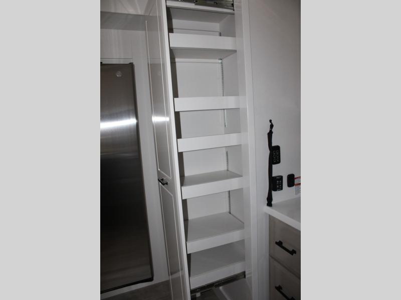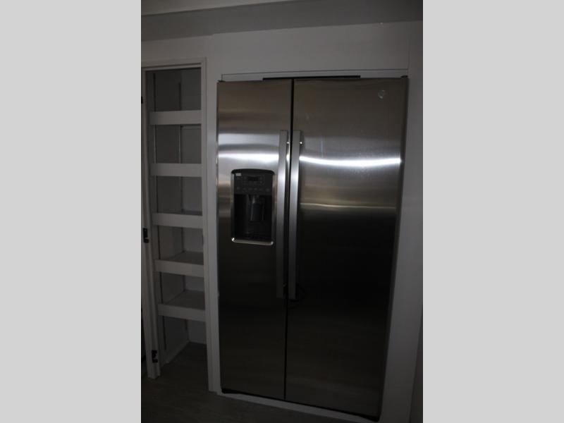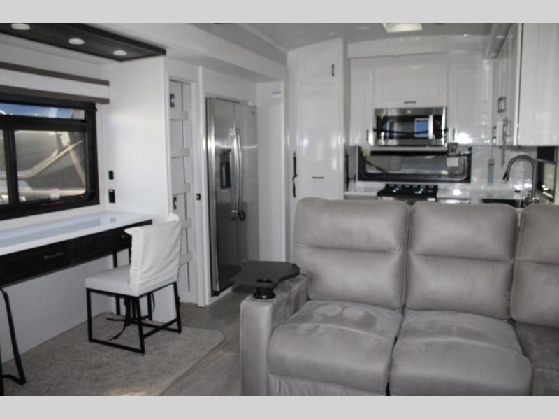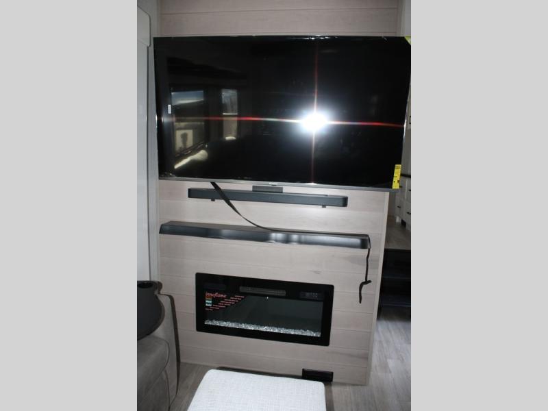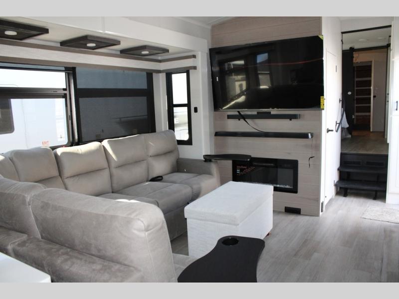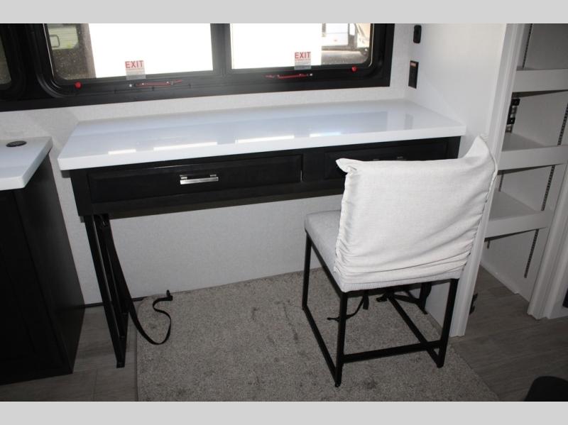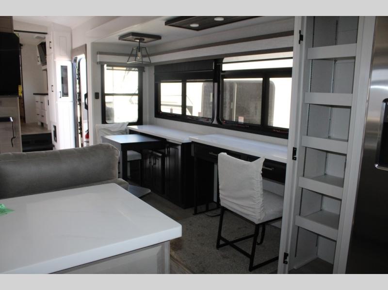 Triples slides, a desk/coffee bar, fireplace, and a huge master bath in front all indicate the kind of vacation you will experience in this Pinnacle Fifth Wheel! As you enter, a convenient half bath is located straight ahead. Slightly to your left, a nice seating area for gathering with family or friends to relax and watch TV, enjoy the fireplace while reading a book or watching a movie, and the dining table with chairs. The dinette slide also houses a 21 cu. ft. residential refrigerator and pantry. The rear kitchen features a u-shaped counter, all the appliances you need to cook like at home, even a pull-out butcher block space for chopping up your veggies. Back through and up the steps to your right in front, the master bedroom will make you feel like royalty with its king bed, plus luxurious full rear bath. A huge vanity with dual bath sinks will allow you both to get ready at the same time, plus there is a walk-in shower with a seat for added convenience. Speaking of walk-in, you will also love the spacious walk-in closet that includes washer/dryer prep.