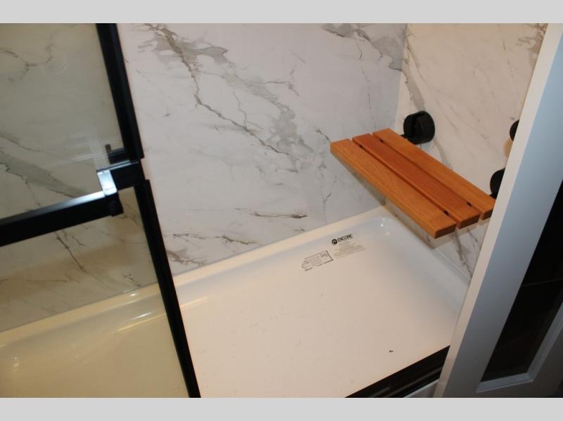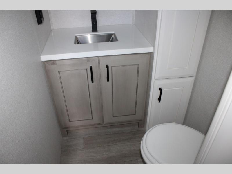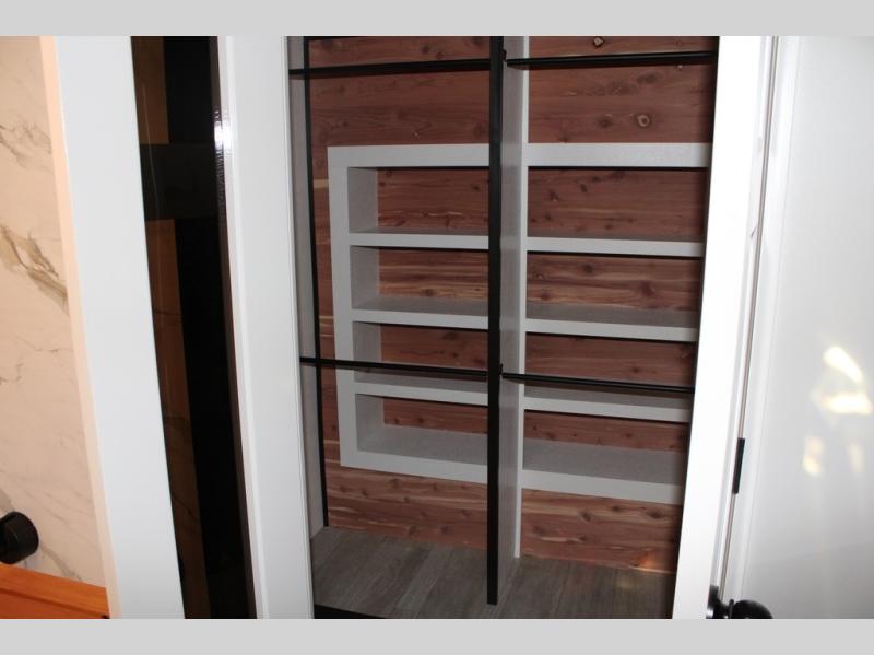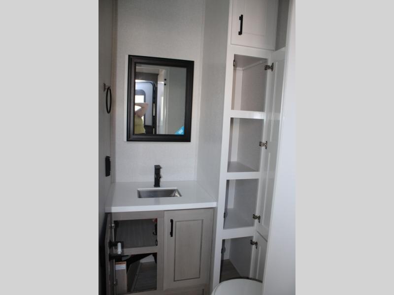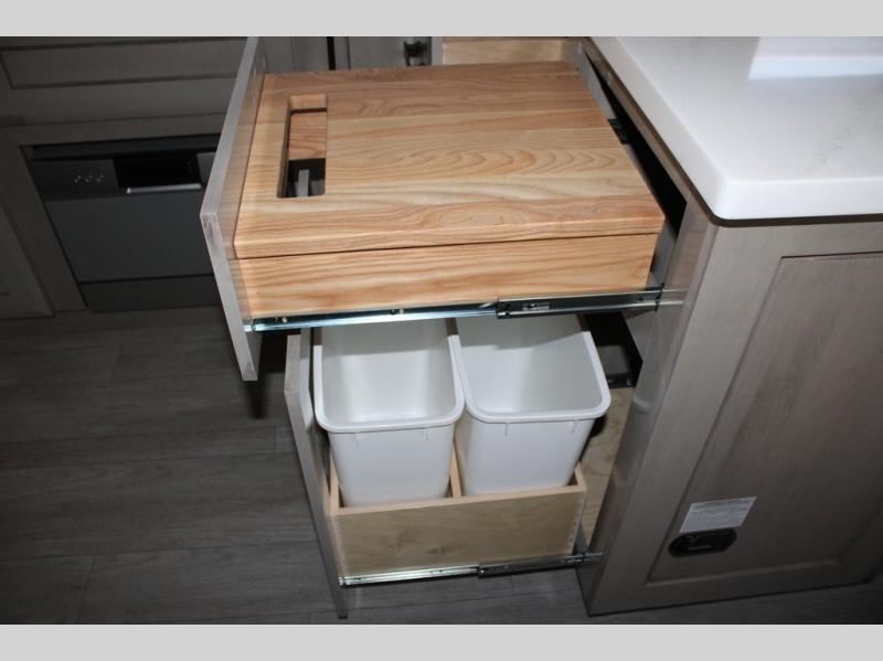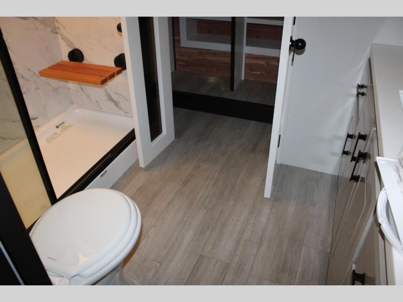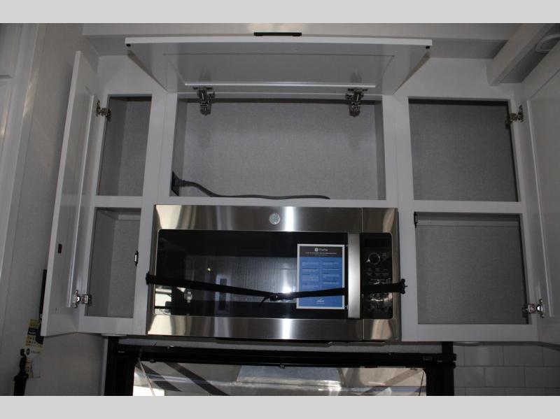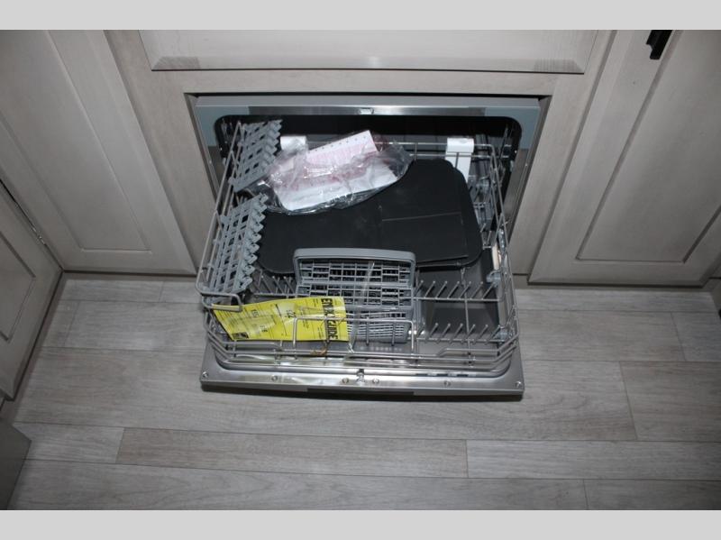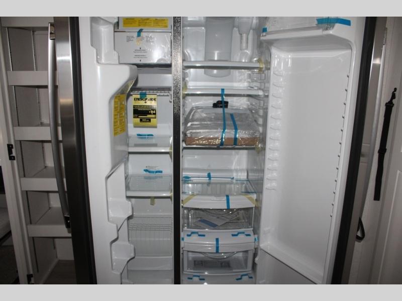 Triples slides, a desk/coffee bar, fireplace, and a huge master bath in front all indicate the kind of vacation you will experience in this Pinnacle Fifth Wheel! As you enter, a convenient half bath is located straight ahead. Slightly to your left, a nice seating area for gathering with family or friends to relax and watch TV, enjoy the fireplace while reading a book or watching a movie, and the dining table with chairs. The dinette slide also houses a 21 cu. ft. residential refrigerator and pantry. The rear kitchen features a u-shaped counter, all the appliances you need to cook like at home, even a pull-out butcher block space for chopping up your veggies. Back through and up the steps to your right in front, the master bedroom will make you feel like royalty with its king bed, plus luxurious full rear bath. A huge vanity with dual bath sinks will allow you both to get ready at the same time, plus there is a walk-in shower with a seat for added convenience. Speaking of walk-in, you will also love the spacious walk-in closet that includes washer/dryer prep.