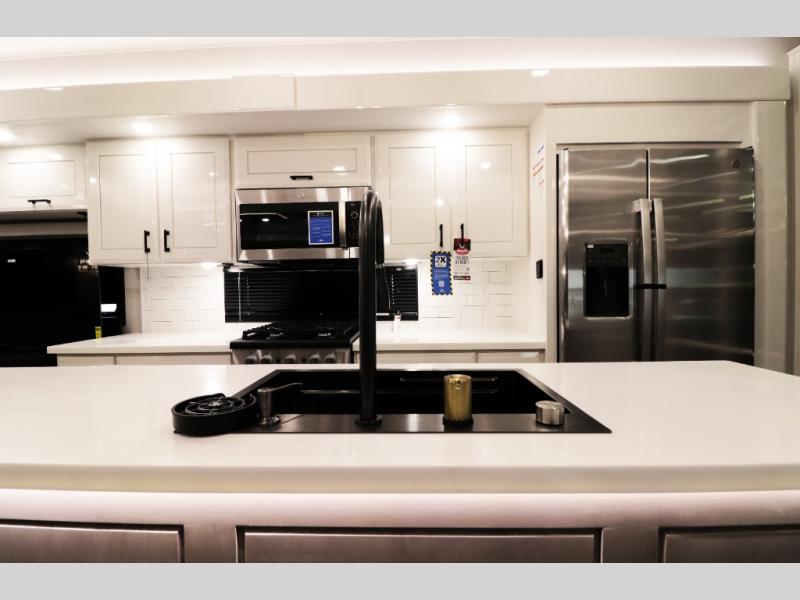 Oversized interior with residential-style solid maple hardwood cabinetry, solid-surface countertops, and premium finishes.