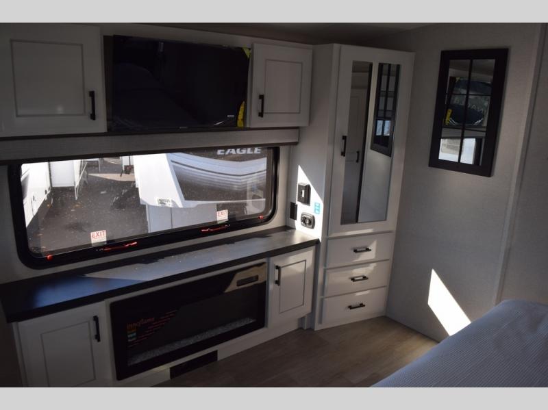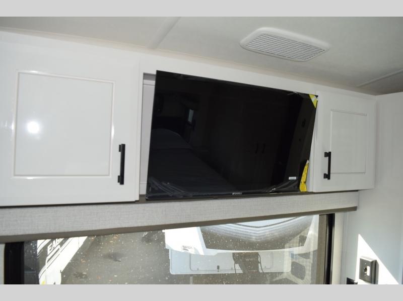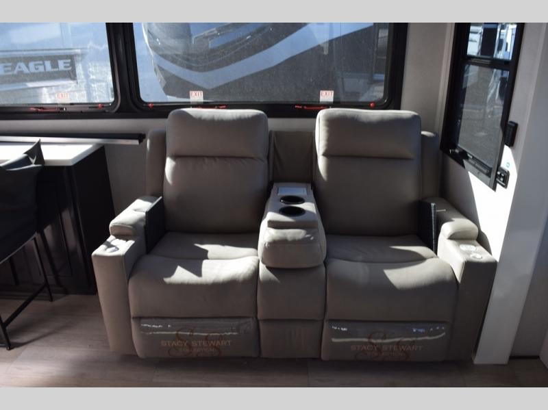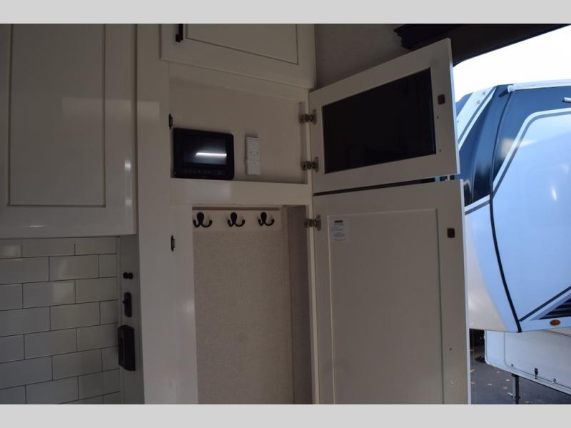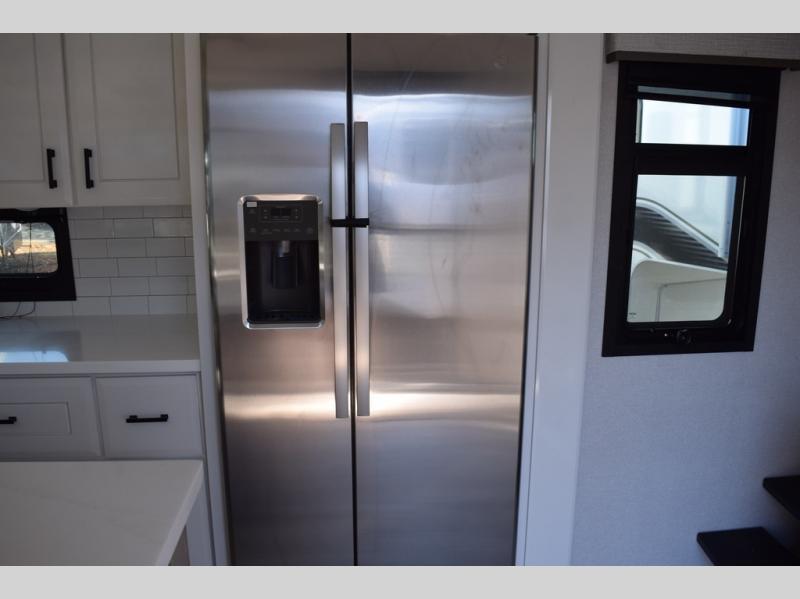 Take your camping trips up a notch in this luxurious fifth wheel! Your family will love to visit in the rear living area on the tri-fold sofa or theater seats, plus there is a credenza with roll-out table here to dine at together. The TV lift and fireplace will make it feel more like home, along with the kitchen island and residential refrigerator. Head up the steps to find cabinets for an optional washer and dryer, a full bath with a large bath vanity, plus a private bedroom up front that you are sure to love. When you aren't resting on the king bed slide out, read a book on the front window seat, or watch a movie with the bedroom TV provided. There is even a bedroom fireplace for added comfort. And check out the exterior with two power awnings with LED lights and a 32" TV!