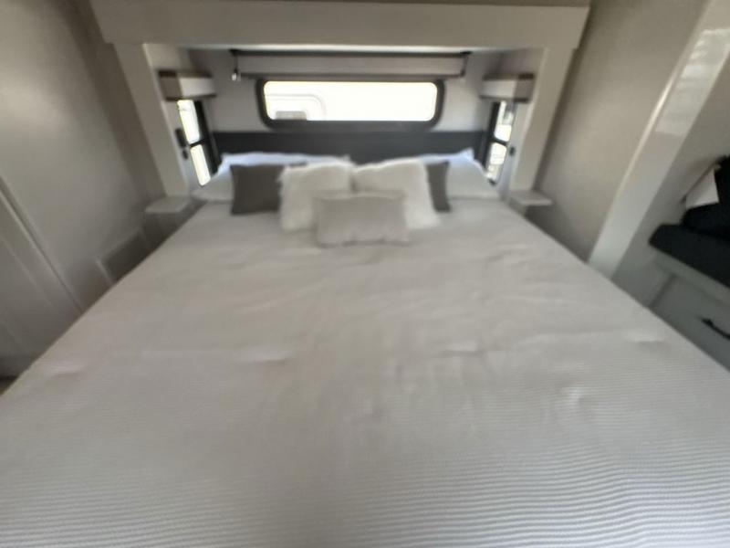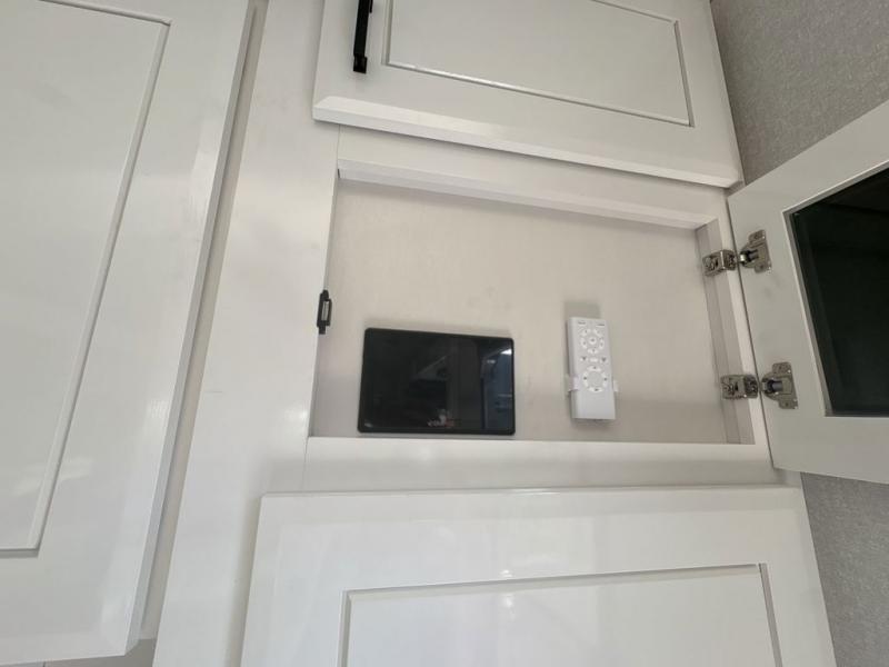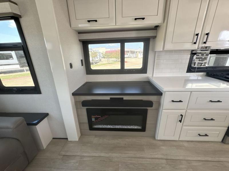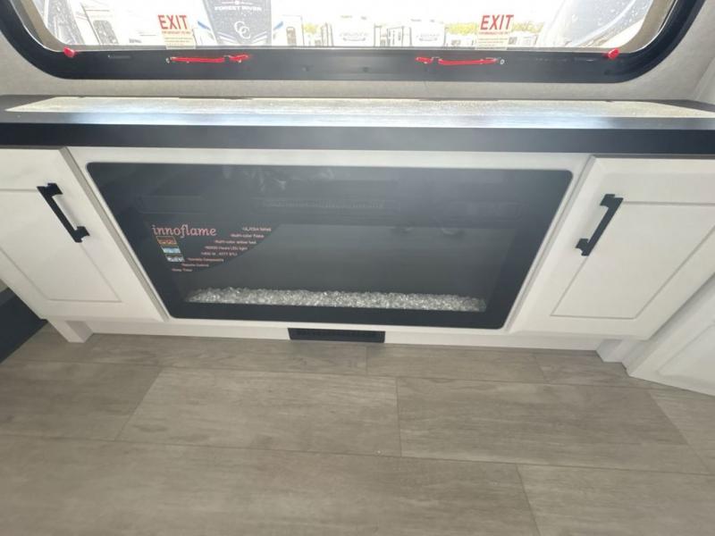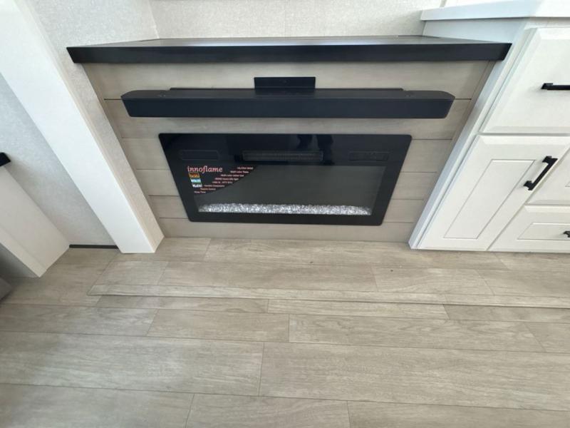 Take your camping trips up a notch in this luxurious fifth wheel! Your family will love to visit in the rear living area on the tri-fold sofa or theater seats, plus there is a credenza with roll-out table here to dine at together. The TV lift and fireplace will make it feel more like home, along with the kitchen island and residential refrigerator. Head up the steps to find cabinets for an optional washer and dryer, a full bath with a large bath vanity, plus a private bedroom up front that you are sure to love. When you aren't resting on the king bed slide out, read a book on the front window seat, or watch a movie with the bedroom TV provided. There is even a bedroom fireplace for added comfort. And check out the exterior with two power awnings with LED lights and a 32" TV!