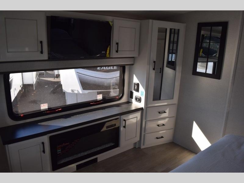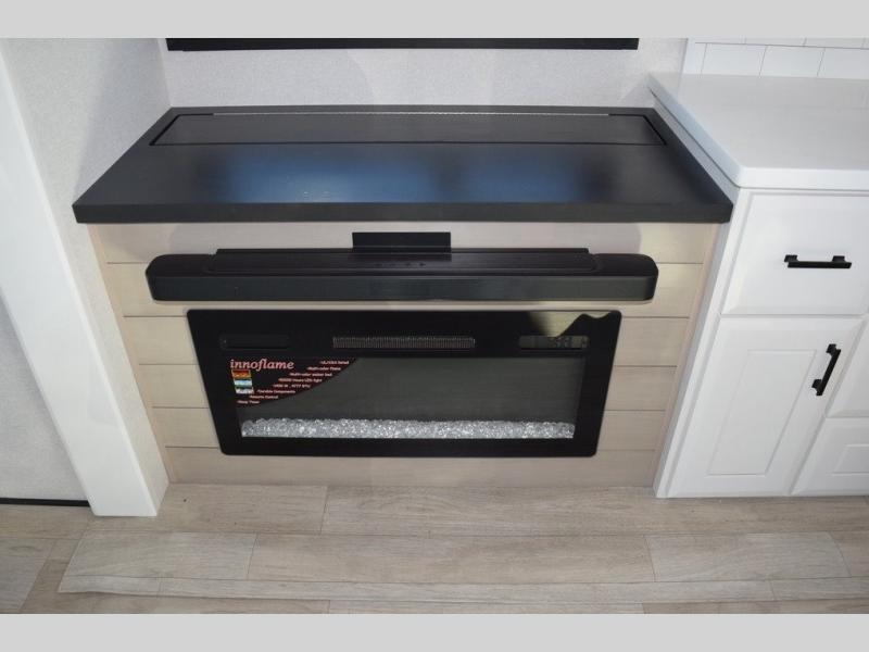 Take your camping trips up a notch in this luxurious fifth wheel! Your family will love to visit in the rear living area on the tri-fold sofa or theater seats, plus there is a credenza with roll-out table here to dine at together. The TV lift and fireplace will make it feel more like home, along with the kitchen island and residential refrigerator. Head up the steps to find cabinets for an optional washer and dryer, a full bath with a large bath vanity, plus a private bedroom up front that you are sure to love. When you aren't resting on the king bed slide out, read a book on the front window seat, or watch a movie with the bedroom TV provided. There is even a bedroom fireplace for added comfort. And check out the exterior with two power awnings with LED lights and a 32" TV!