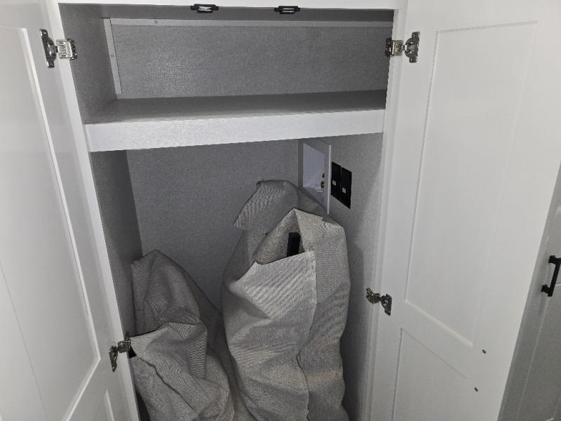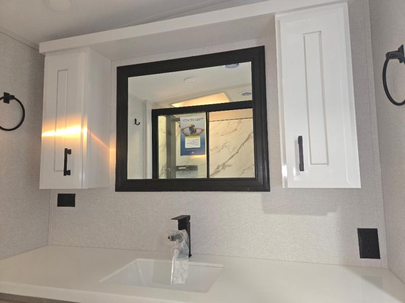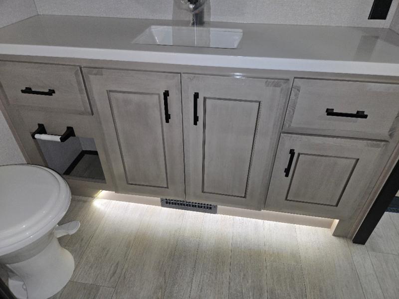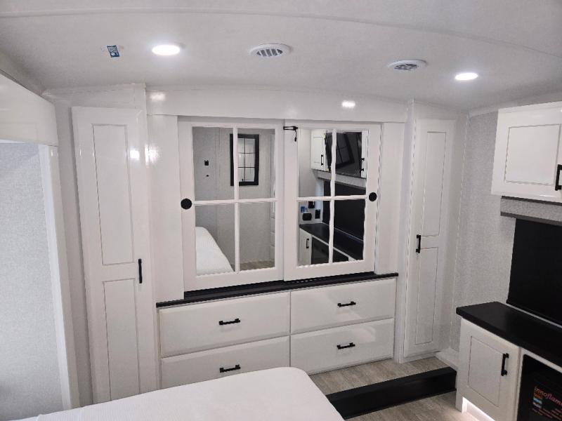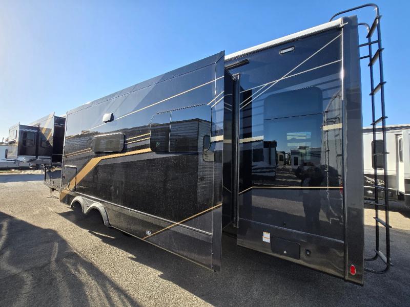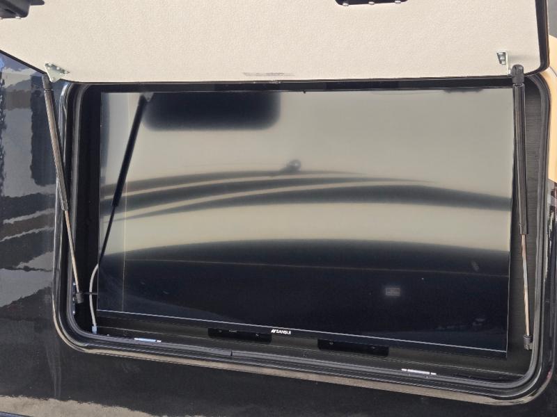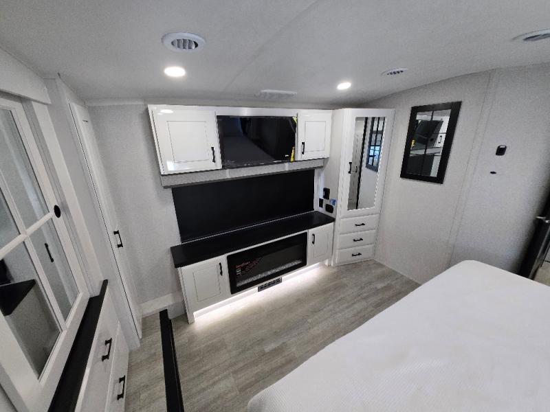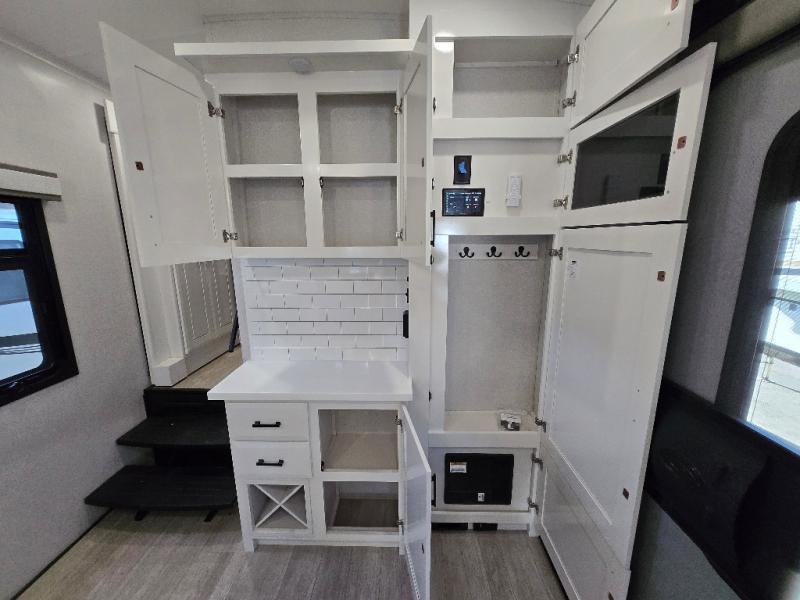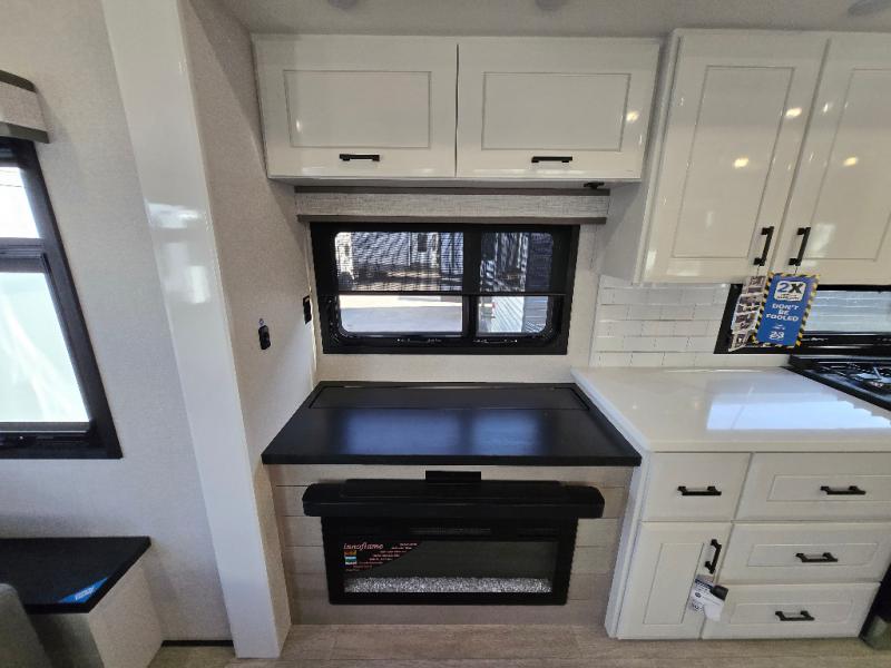 Take your camping trips up a notch in this luxurious fifth wheel! Your family will love to visit in the rear living area on the tri-fold sofa or theater seats, plus there is a credenza with roll-out table here to dine at together. The TV lift and fireplace will make it feel more like home, along with the kitchen island and residential refrigerator. Head up the steps to find cabinets for an optional washer and dryer, a full bath with a large bath vanity, plus a private bedroom up front that you are sure to love. When you aren't resting on the king bed slide out, read a book on the front window seat, or watch a movie with the bedroom TV provided. There is even a bedroom fireplace for added comfort. And check out the exterior with two power awnings with LED lights and a 40" TV!