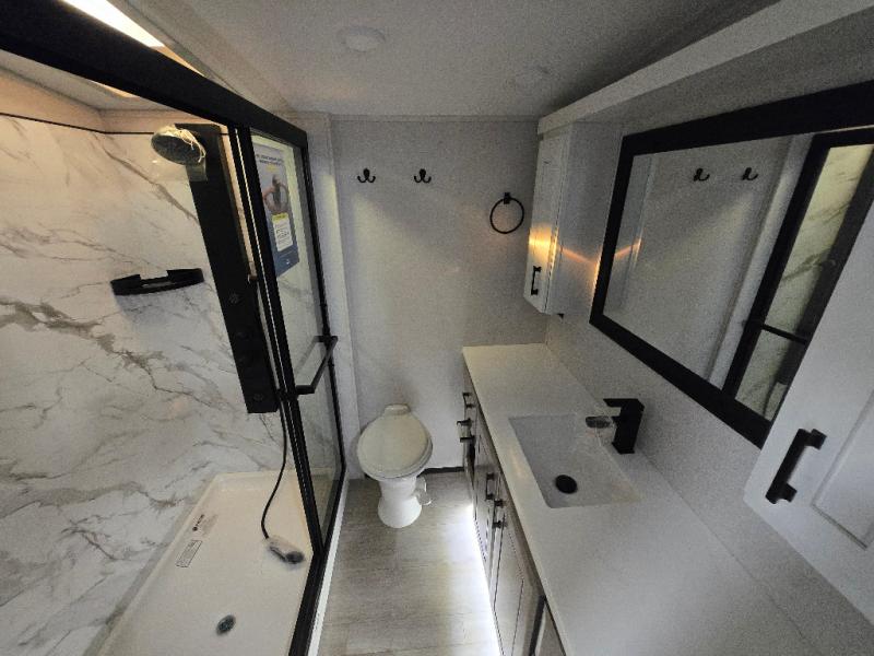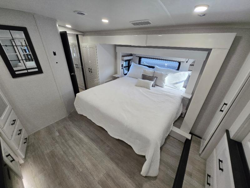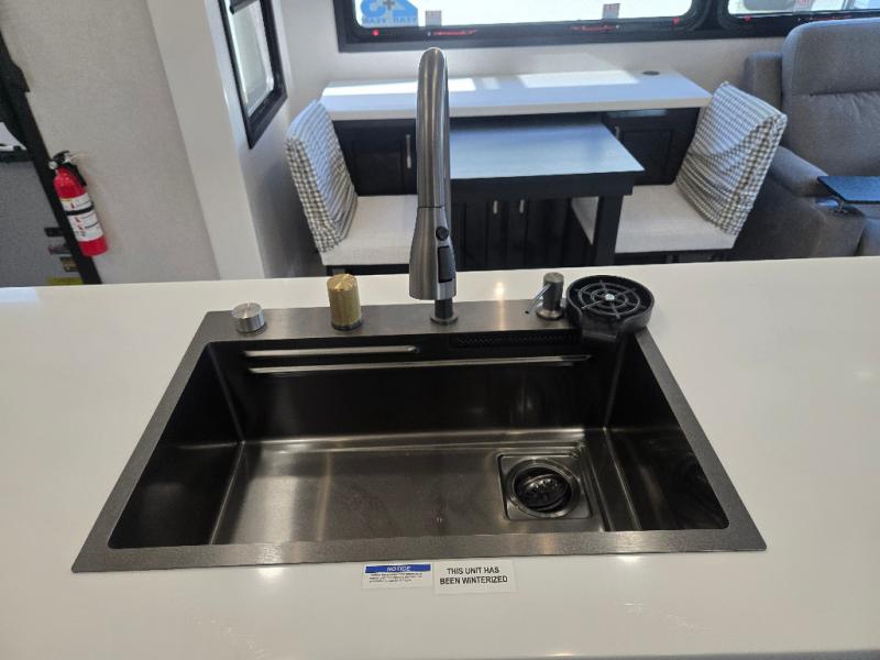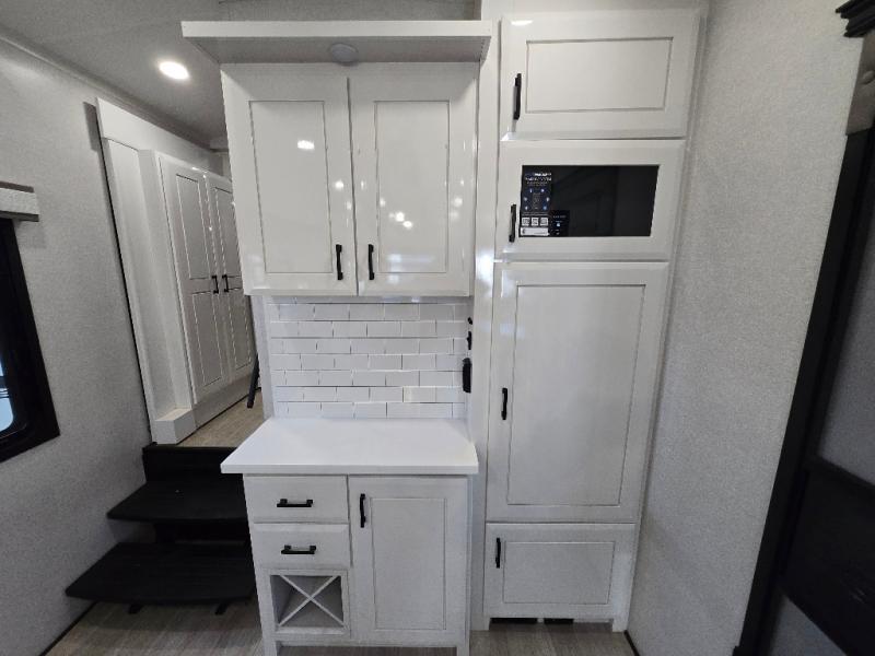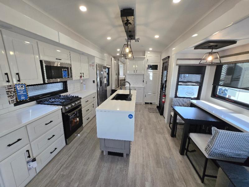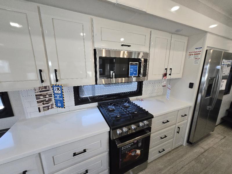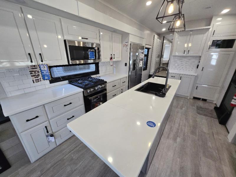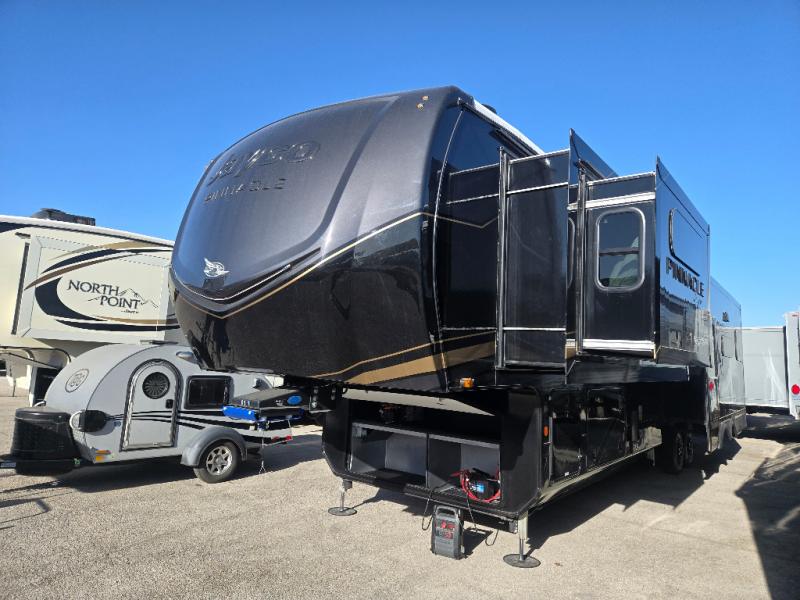 Each Pinnacle fifth wheel features Stronghold VBL lamination for the lightest, yet strongest construction in the RV industry. Add that to the Magnum Truss XL6 roof system and Climate Shield zero-degree tested weather protection and you'll be enjoying your fifth wheel even in harsh weather. Some of the exterior conveniences you will appreciate are the Keyed-Alike lock system, the fully enclosed, universal docking center, and the 6-point hydraulic auto-leveling system for quick and easy set up. The 5 Star Handling Package will make towing a fifth wheel a walk in the park, and the two Whisper Quiet A/C units will keep you comfortable during the hot summer months. Inside, you'll enjoy the residential "Do it all" sink, the solid hardwood cabinet doors, stiles, and fascia, the vinyl flooring throughout, plus many more comforts. There is even a central vacuum system, a wireless remote-control system, 12V charging station, plus many more conveniences to make each trip enjoyable.