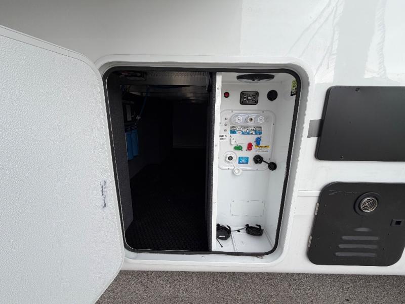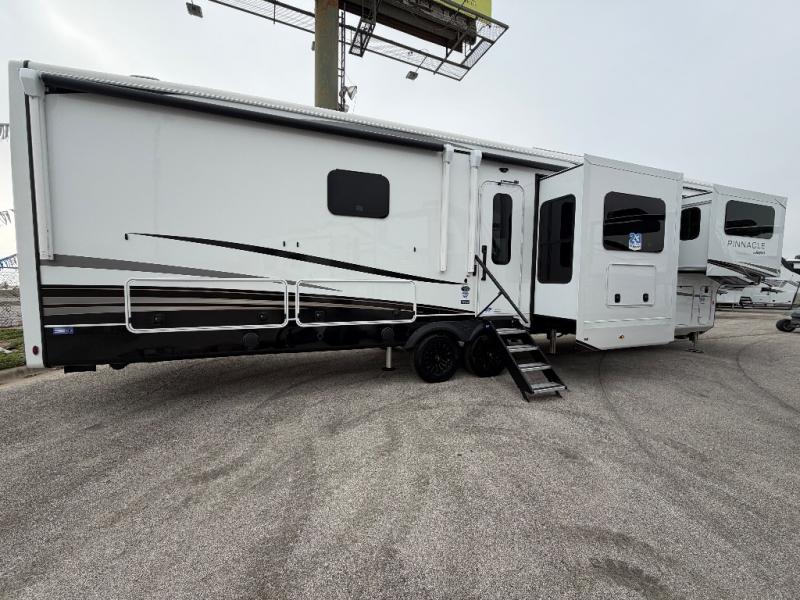 Each Pinnacle fifth wheel features Stronghold VBL lamination for the lightest, yet strongest construction in the RV industry. Add that to the Magnum Truss XL6 roof system and Climate Shield zero-degree tested weather protection and you'll be enjoying your fifth wheel even in harsh weather. Some of the exterior conveniences you will appreciate are the Keyed-Alike lock system, the fully enclosed, universal docking center, and the 6-point hydraulic auto-leveling system for quick and easy set up. The 5 Star Handling Package will make towing a fifth wheel a walk in the park, and the two Whisper Quiet A/C units will keep you comfortable during the hot summer months. Inside, you'll enjoy the residential "Do it all" sink, the solid hardwood cabinet doors, stiles, and fascia, the vinyl flooring throughout, plus many more comforts. There is even a central vacuum system, a wireless remote-control system, 12V charging station, plus many more conveniences to make each trip enjoyable.