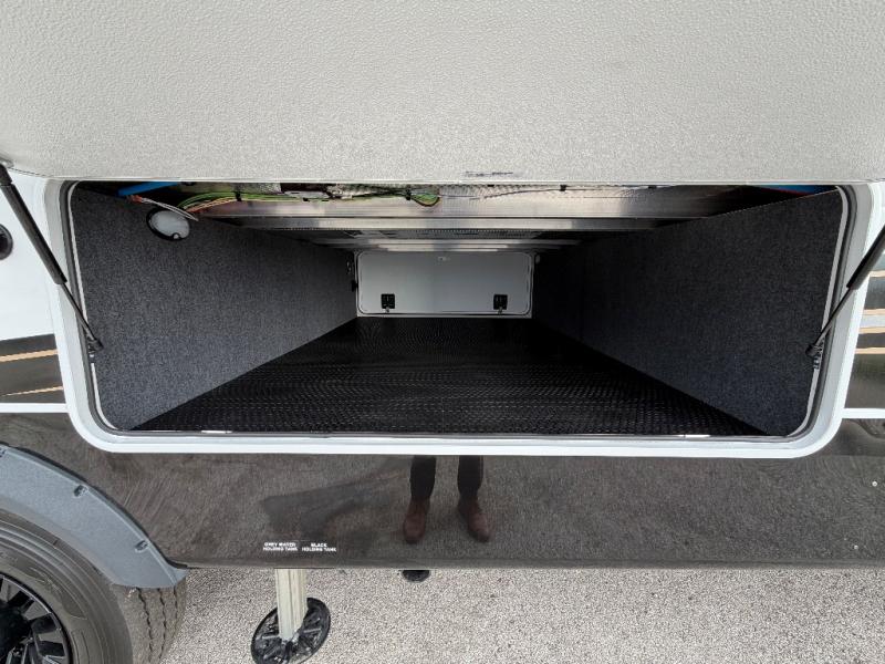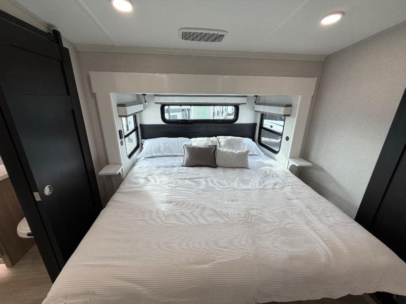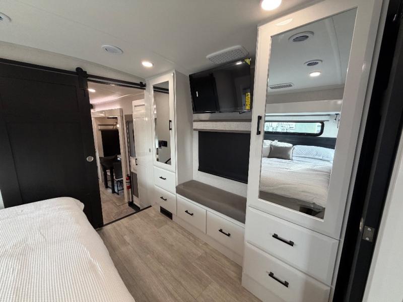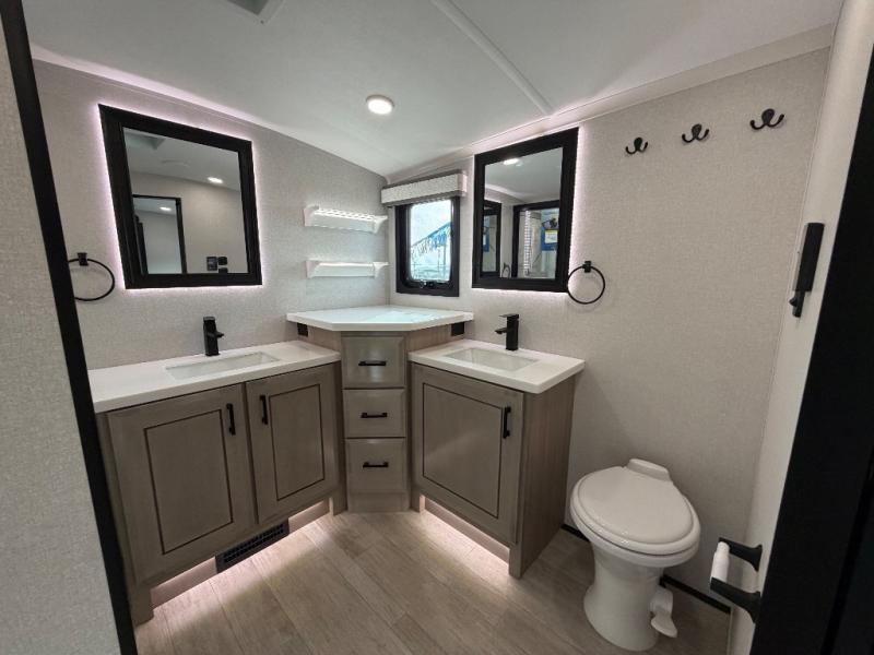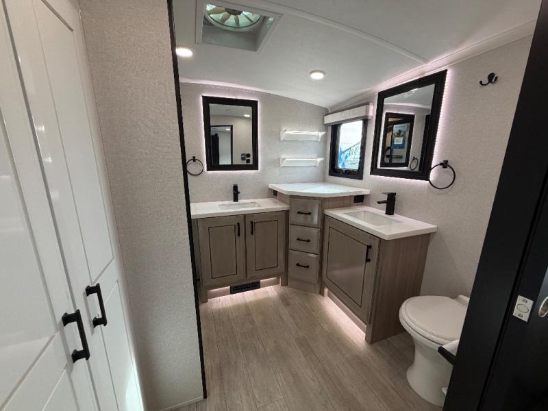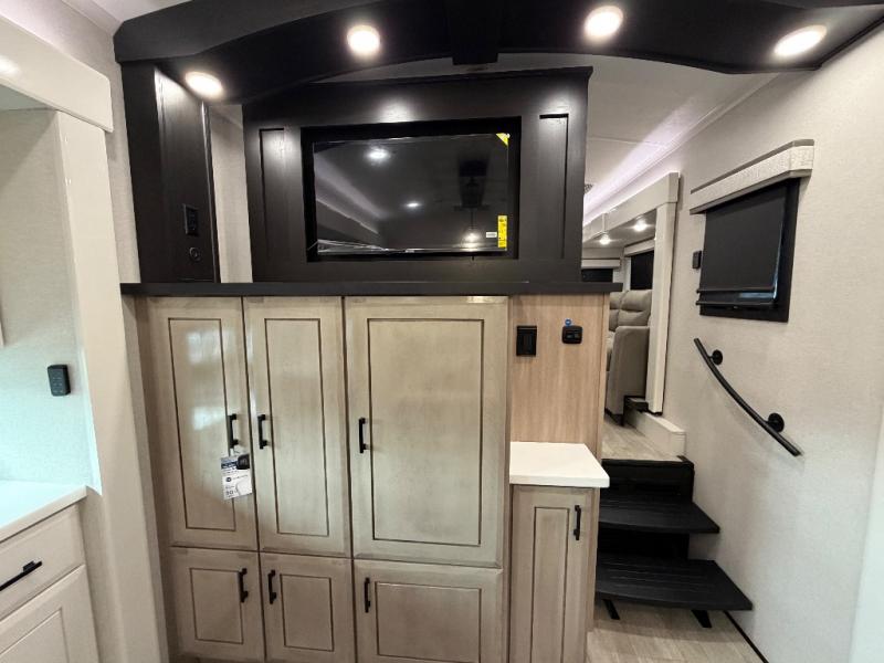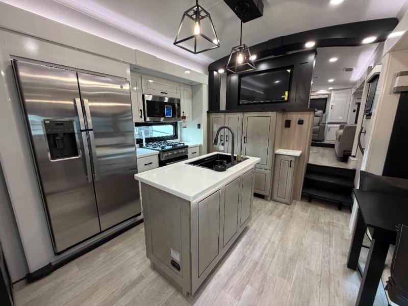 At the front of this fifth wheel, a spacious living area welcomes you with a theater seat and dual opposing slides that hold two tri-fold sofas, perfect for gathering the whole crew after a day of adventure and easily converted into extra sleeping space when needed. A 65" TV enhances cozy movie nights. Moving into the center, the kitchen opens up with its own slide-out, offering a 21-cu. ft. residential refrigerator, 30" convection microwave, 24" range, and plenty of overhead cabinets, along with a functional island equipped with a sink, pull-out cutting board, and generous prep space. A pantry sits conveniently nearby for dry goods, while a half bath across the way adds everyday convenience. Opposite the island, a roll-top dinette in another slide provides even more room to move around and the perfect spot for meals or board games. Toward the rear, the spacious bedroom features a 72" x 80" king bed in a slide for added walking space, along with a bench, a 32" TV, and dual wardrobes for clothing and essentials. At the very back, a luxurious full bathroom awaits, complete with double sinks for smooth morning routines and a 36" x 48" shower with a built-in seat for comfort and accessibility.