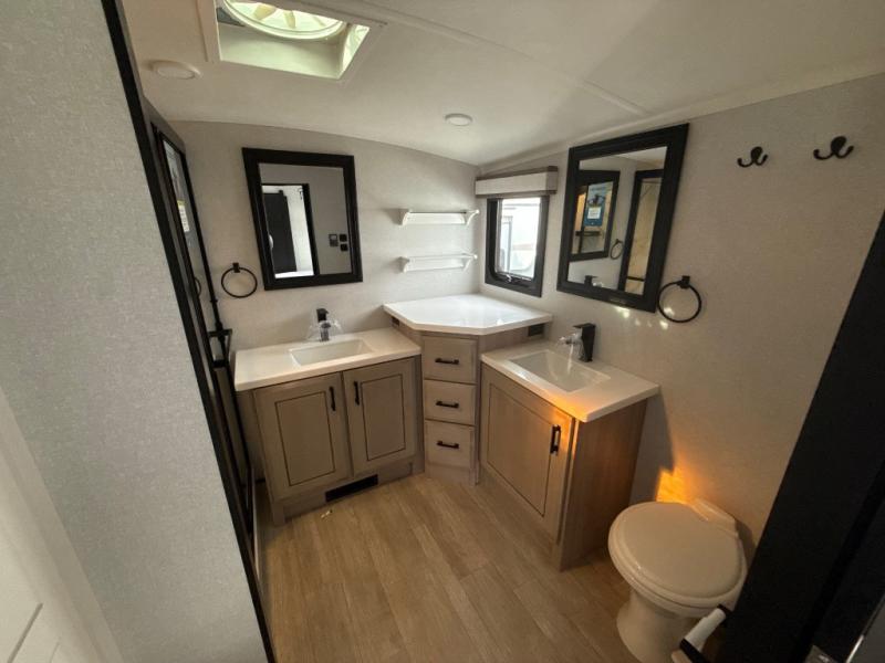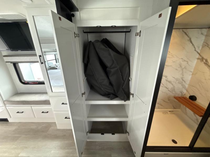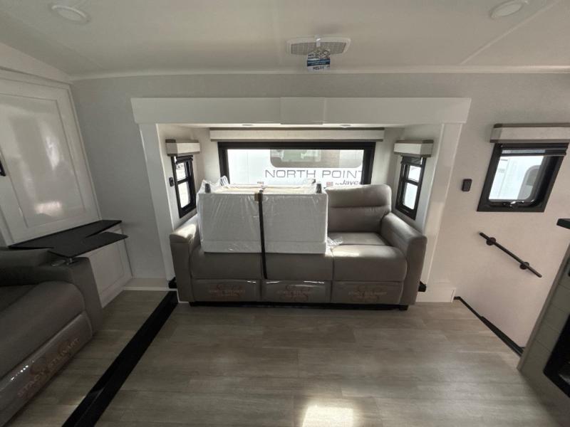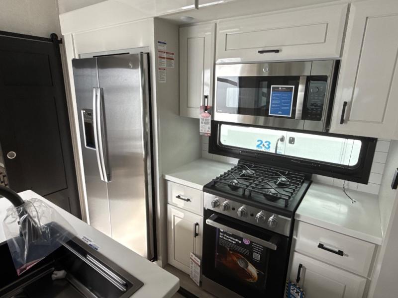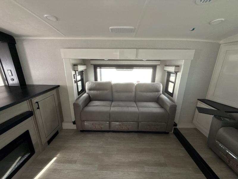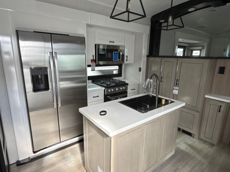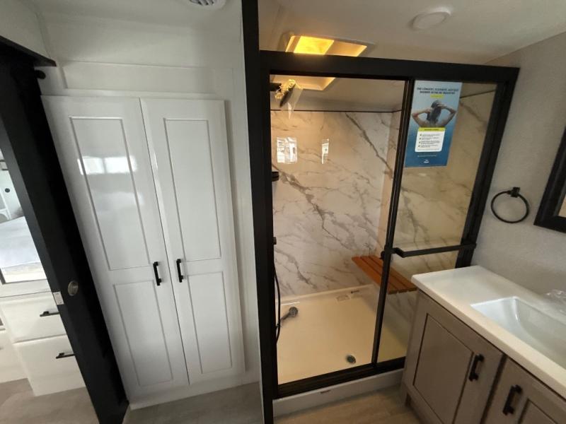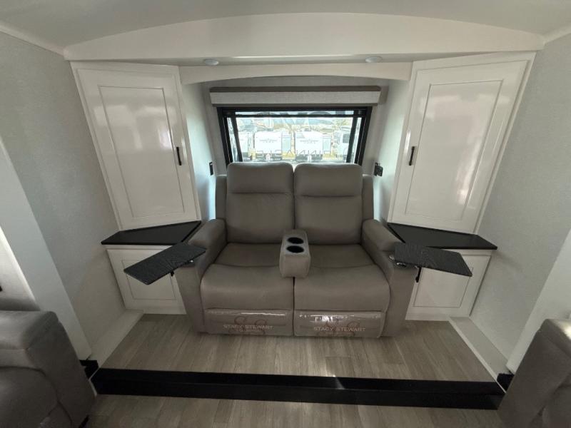 At the front of this fifth wheel, a spacious living area welcomes you with a theater seat and dual opposing slides that hold two tri-fold sofas, perfect for gathering the whole crew after a day of adventure and easily converted into extra sleeping space when needed. A 65" TV enhances cozy movie nights. Moving into the center, the kitchen opens up with its own slide-out, offering a 21-cu. ft. residential refrigerator, 30" convection microwave, 24" range, and plenty of overhead cabinets, along with a functional island equipped with a sink, pull-out cutting board, and generous prep space. A pantry sits conveniently nearby for dry goods, while a half bath across the way adds everyday convenience. Opposite the island, a roll-top dinette in another slide provides even more room to move around and the perfect spot for meals or board games. Toward the rear, the spacious bedroom features a 72" x 80" king bed in a slide for added walking space, along with a bench, a 32" TV, and dual wardrobes for clothing and essentials. At the very back, a luxurious full bathroom awaits, complete with double sinks for smooth morning routines and a 36" x 48" shower with a built-in seat for comfort and accessibility.