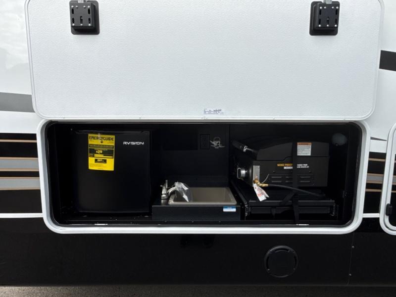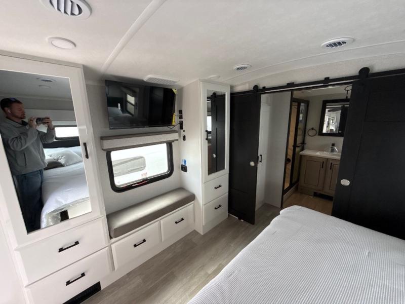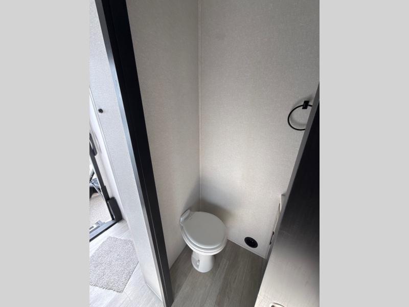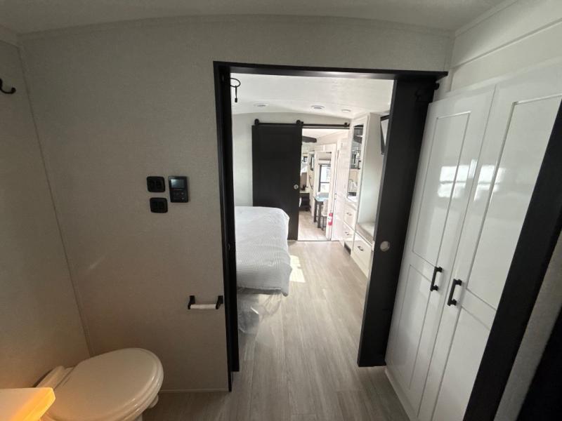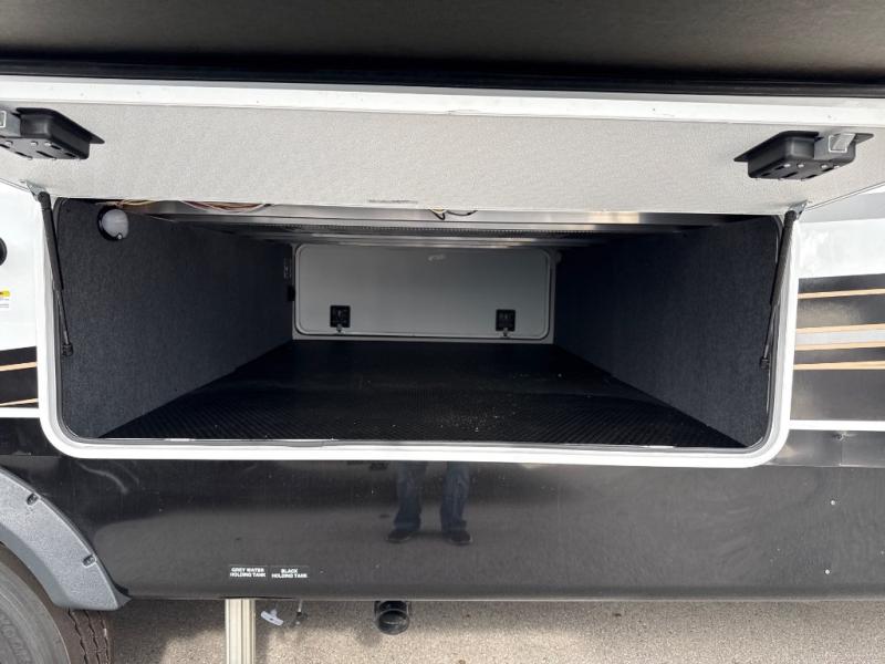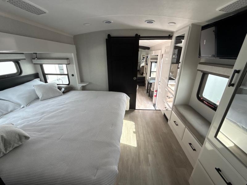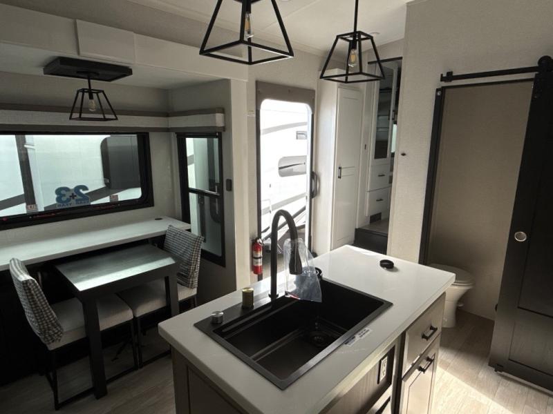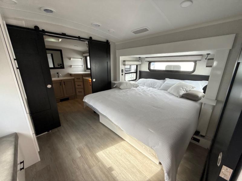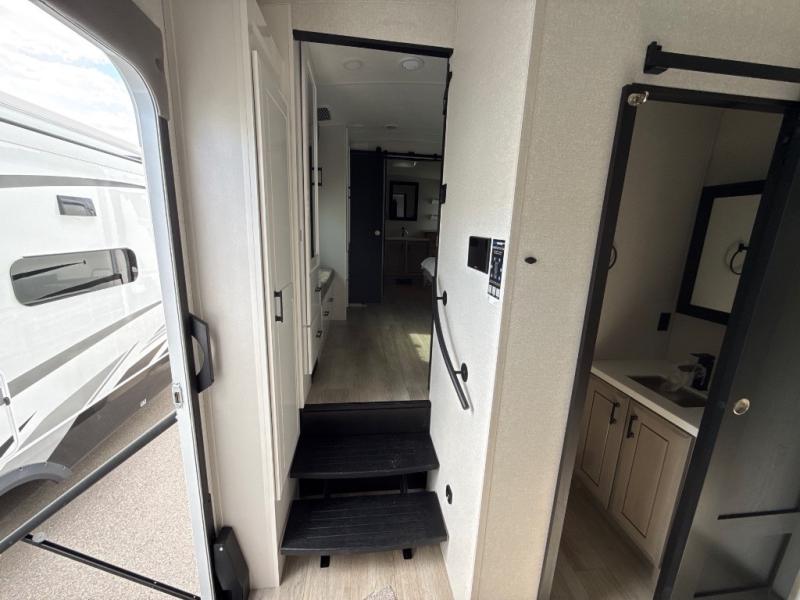 At the front of this fifth wheel, a spacious living area welcomes you with a theater seat and dual opposing slides that hold two tri-fold sofas, perfect for gathering the whole crew after a day of adventure and easily converted into extra sleeping space when needed. A 65" TV enhances cozy movie nights. Moving into the center, the kitchen opens up with its own slide-out, offering a 21-cu. ft. residential refrigerator, 30" convection microwave, 24" range, and plenty of overhead cabinets, along with a functional island equipped with a sink, pull-out cutting board, and generous prep space. A pantry sits conveniently nearby for dry goods, while a half bath across the way adds everyday convenience. Opposite the island, a roll-top dinette in another slide provides even more room to move around and the perfect spot for meals or board games. Toward the rear, the spacious bedroom features a 72" x 80" king bed in a slide for added walking space, along with a bench, a 32" TV, and dual wardrobes for clothing and essentials. At the very back, a luxurious full bathroom awaits, complete with double sinks for smooth morning routines and a 36" x 48" shower with a built-in seat for comfort and accessibility.