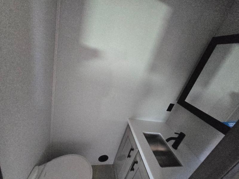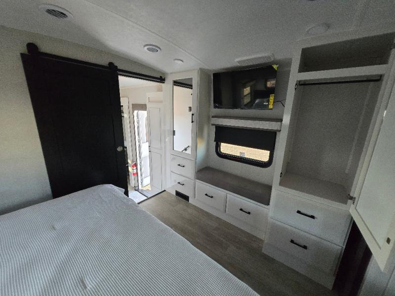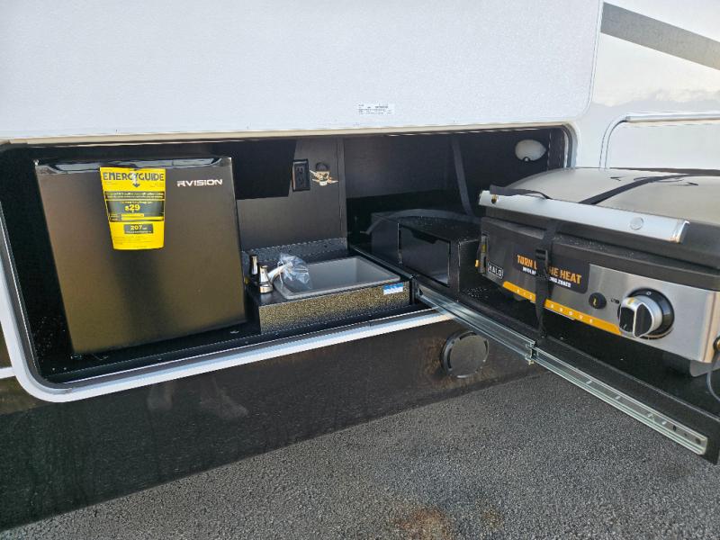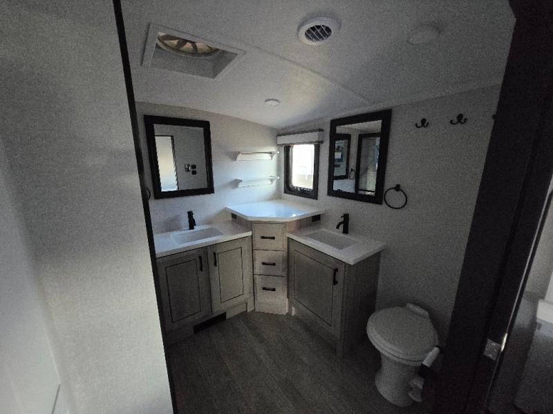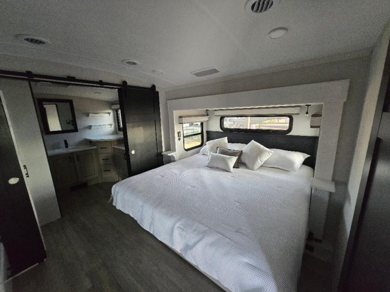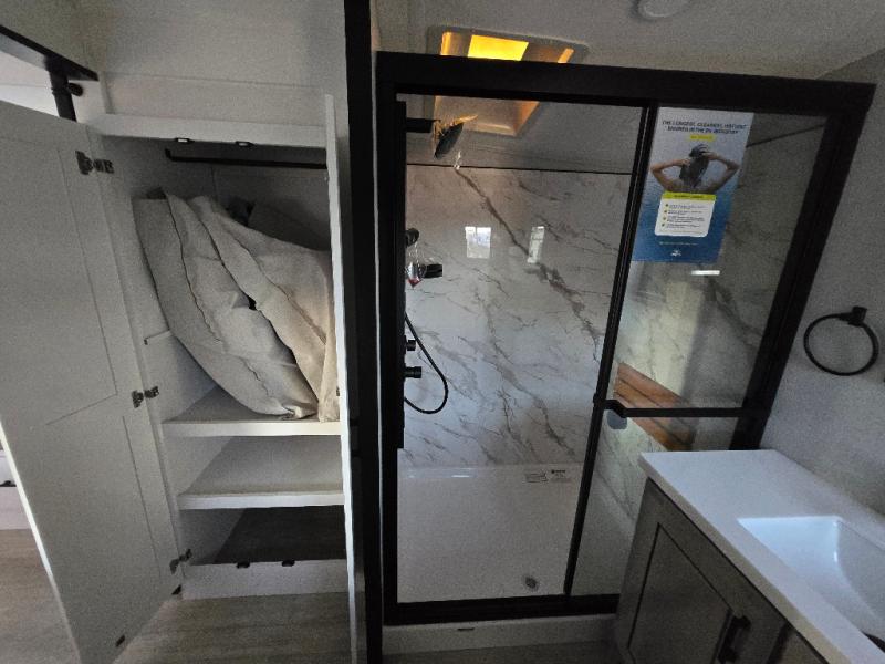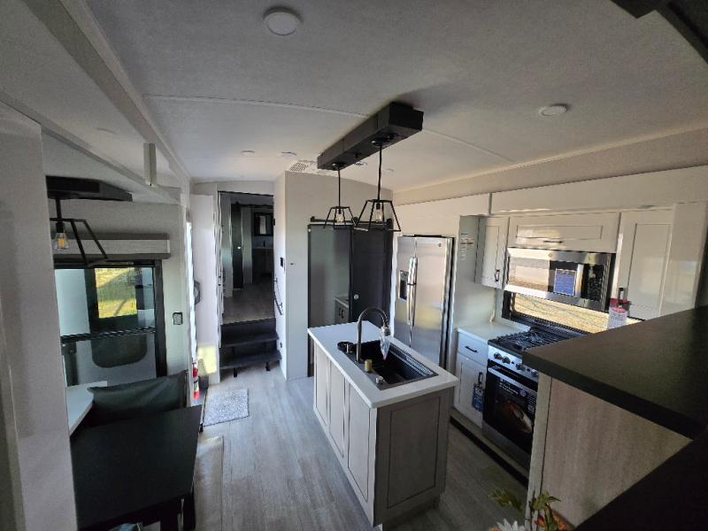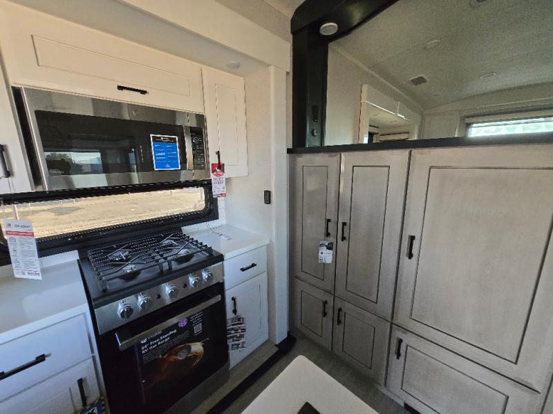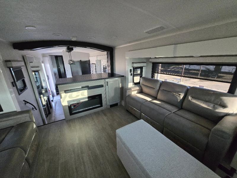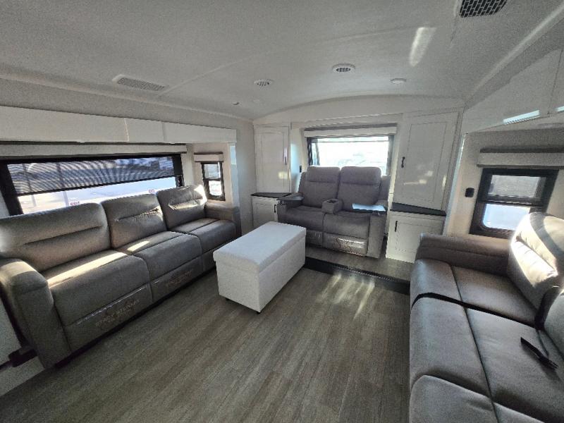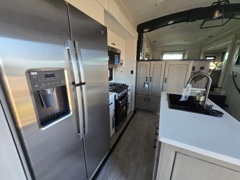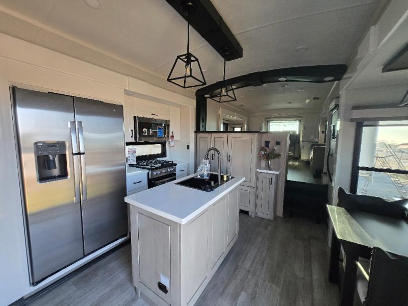 At the front of this fifth wheel, a spacious living area welcomes you with a theater seat and dual opposing slides that hold two tri-fold sofas, perfect for gathering the whole crew after a day of adventure and easily converted into extra sleeping space when needed. A 65" TV enhances cozy movie nights. Moving into the center, the kitchen opens up with its own slide-out, offering a 21-cu. ft. residential refrigerator, 30" convection microwave, 24" range, and plenty of overhead cabinets, along with a functional island equipped with a sink, pull-out cutting board, and generous prep space. A pantry sits conveniently nearby for dry goods, while a half bath across the way adds everyday convenience. Opposite the island, a roll-top dinette in another slide provides even more room to move around and the perfect spot for meals or board games. Toward the rear, the spacious bedroom features a 72" x 80" king bed in a slide for added walking space, along with a bench, a 32" TV, and dual wardrobes for clothing and essentials. At the very back, a luxurious full bathroom awaits, complete with double sinks for smooth morning routines and a 36" x 48" shower with a built-in seat for comfort and accessibility.