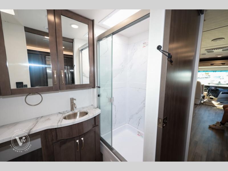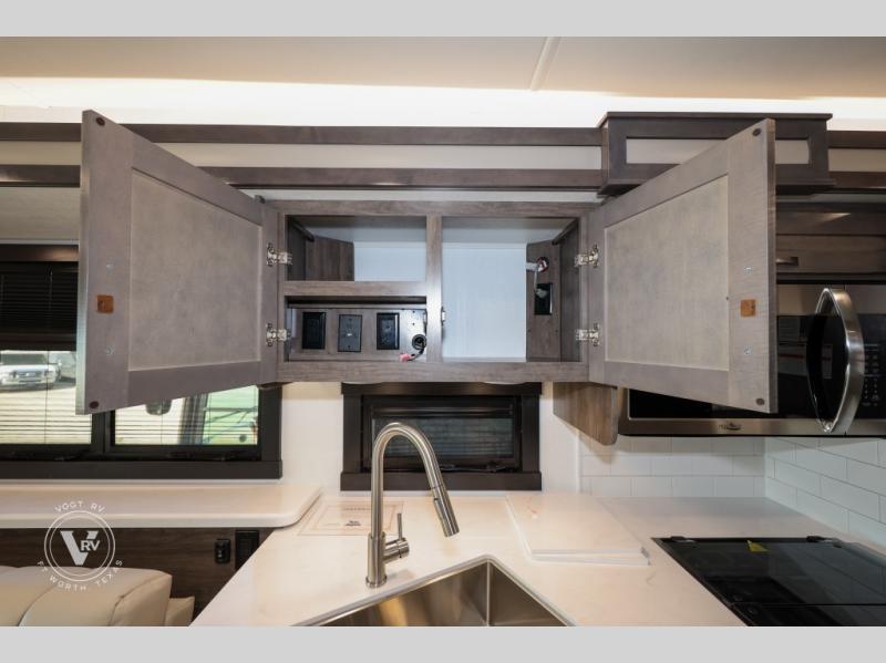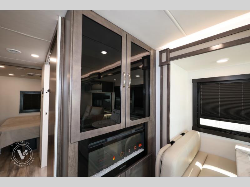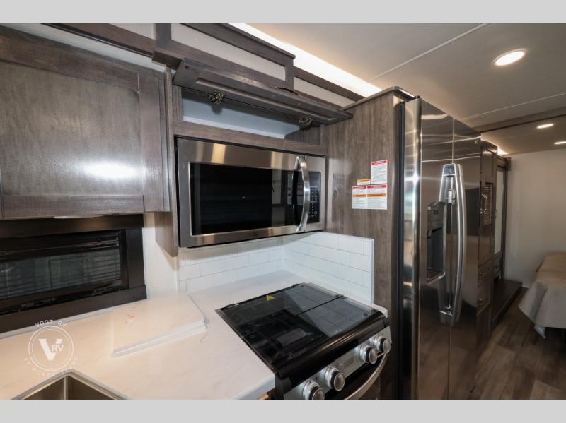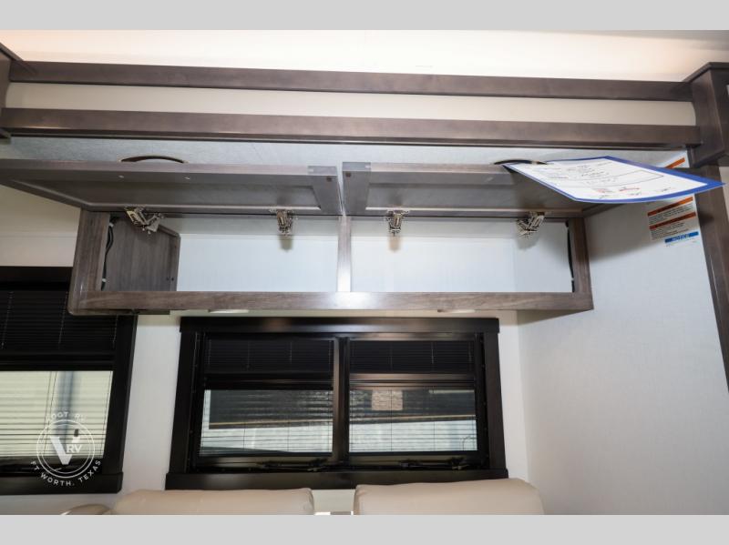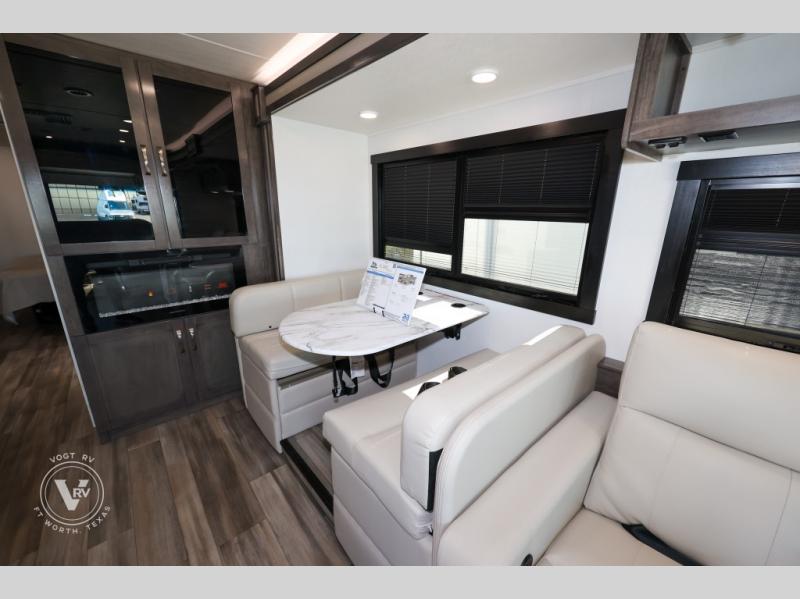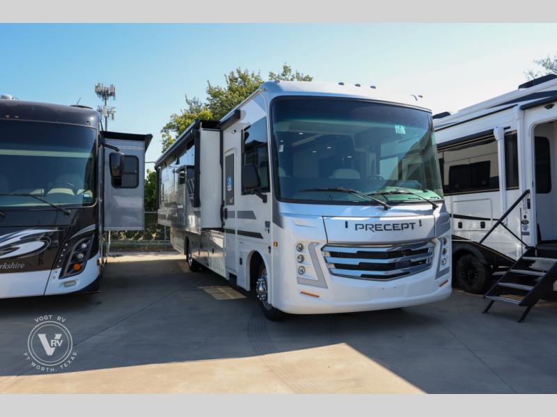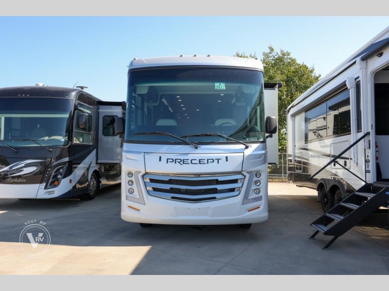 With its full-wall slide and additional slide in the living area, this Precept Class A gas motorhome is full of space! You'll have room to do the things you love, like cooking breakfast on the Furrion all-in-one cooktop and oven, relaxing on the theater sofa, cleaning up in the full bathroom, and playing card games at the booth dinette. You also won't be at a loss for entertainment because this coach offers you three TVs, and you'll even have an extra spot to relax once you turn the swivel cab seats around. In between the cab seats is a removable cockpit table that will allow you to set your glass of wine or cup of coffee down to talk, and you can add some more sleeping space to this coach by choosing the optional drop-down overhead bunk above the cab.