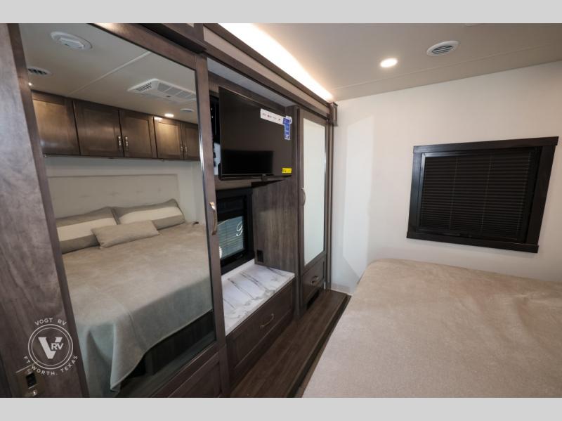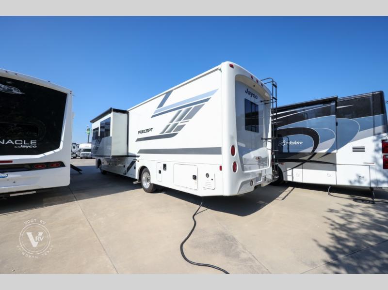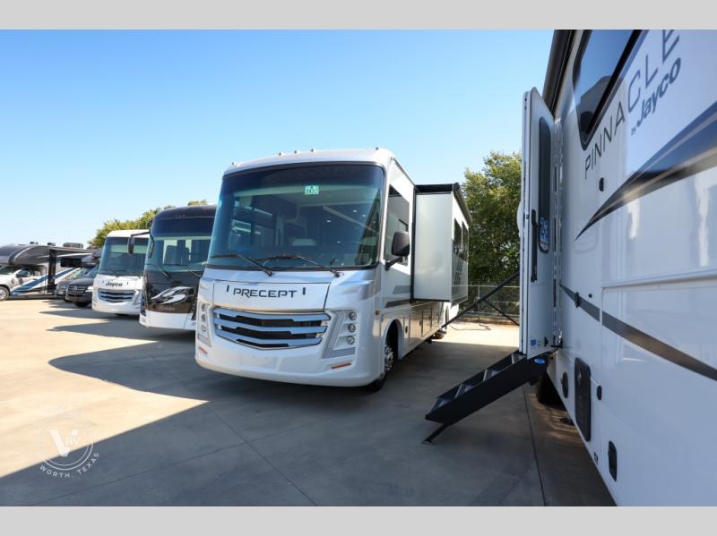 The Jayco Precept Class A gas motorhome comes with some features that you'll only find on a Jayco product, like the JRide Plus which offers you a powerful blend of precise handling and renowned stability on the road and the Firefly total coach control system which allows you to control your coach's operations from just about anywhere with your phone. You'll find two-point lap seatbelts in all designated seating locations, and the one-piece, seamless fiberglass front and rear caps resist wear and tear over the years. The Precept also offers you the lightest yet strongest construction in the industry with the Stronghold VBL lamination on the roof, floor, and sidewalls. You'll also be very pleased to find a 120" panoramic windshield, automatic hydraulic leveling jacks, and a 5,500W generator with auto-gen start.