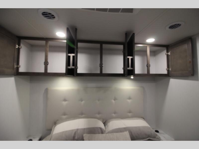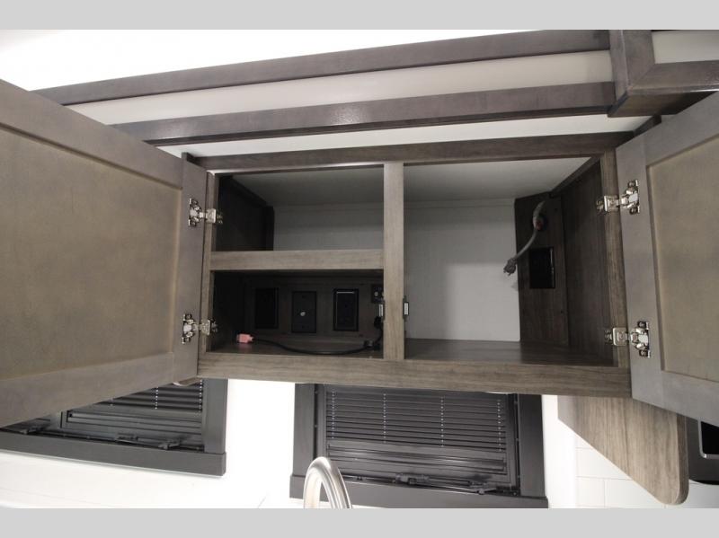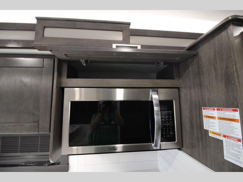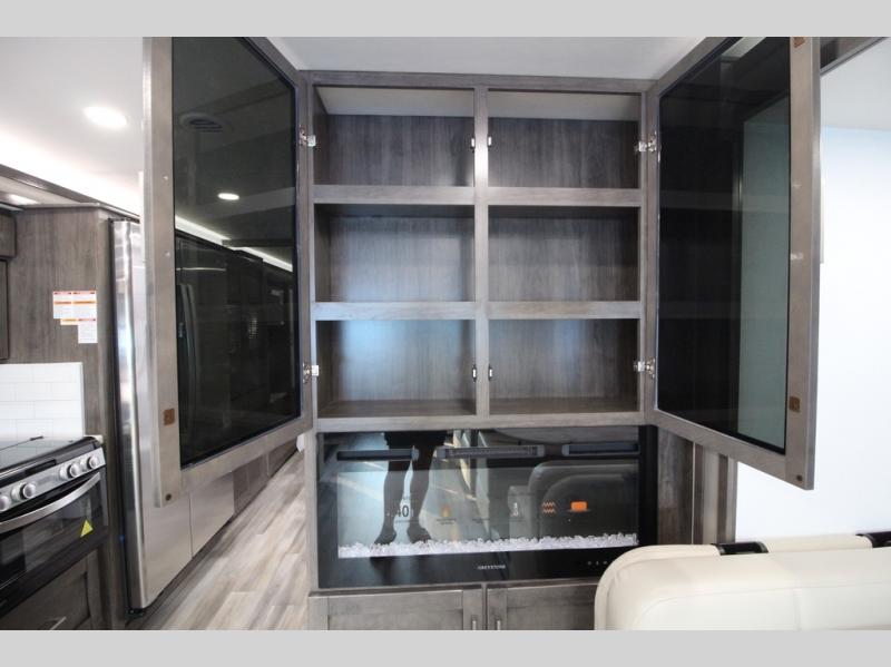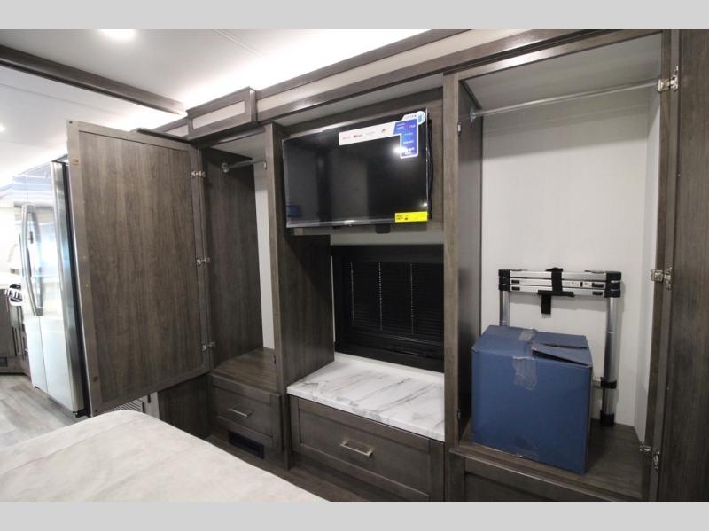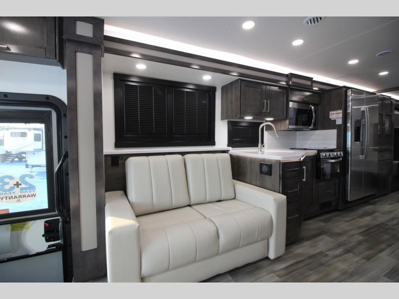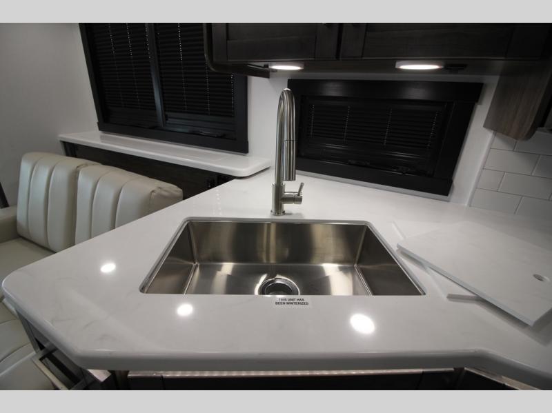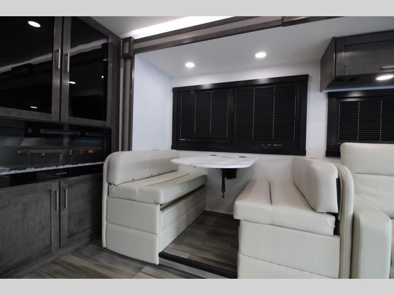 With its full-wall slide and additional slide in the living area, this Precept Class A gas motorhome is full of space! You'll have room to do the things you love, like cooking breakfast on the Furrion all-in-one cooktop and oven, relaxing on the theater sofa, cleaning up in the full bathroom, and playing card games at the booth dinette. You also won't be at a loss for entertainment because this coach offers you three TVs, and you'll even have an extra spot to relax once you turn the swivel cab seats around. In between the cab seats is a removable cockpit table that will allow you to set your glass of wine or cup of coffee down to talk, and you can add some more sleeping space to this coach by choosing the optional drop-down overhead bunk above the cab.