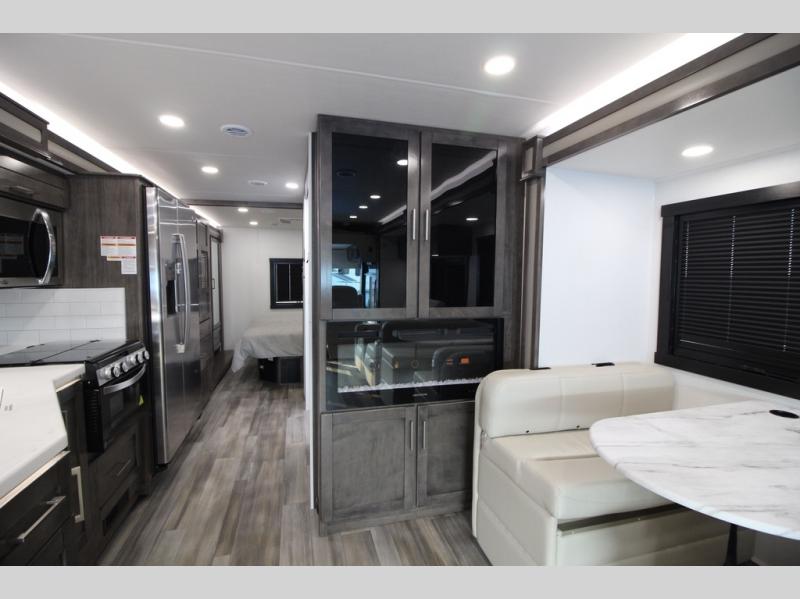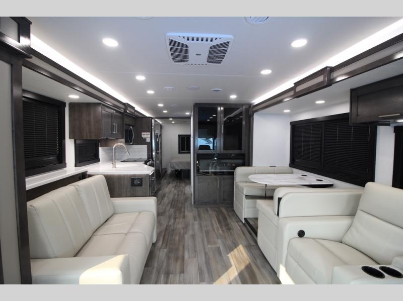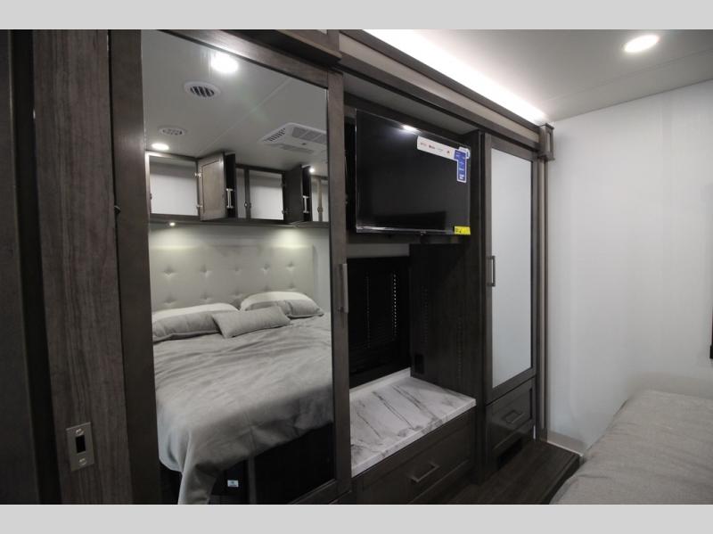 The Jayco Precept Class A gas motorhome comes with some features that you'll only find on a Jayco product, like the JRide Plus which offers you a powerful blend of precise handling and renowned stability on the road and the Firefly total coach control system which allows you to control your coach's operations from just about anywhere with your phone. You'll find two-point lap seatbelts in all designated seating locations, and the one-piece, seamless fiberglass front and rear caps resist wear and tear over the years. The Precept also offers you the lightest yet strongest construction in the industry with the Stronghold VBL lamination on the roof, floor, and sidewalls. You'll also be very pleased to find a 120" panoramic windshield, automatic hydraulic leveling jacks, and a 5,500W generator with auto-gen start.