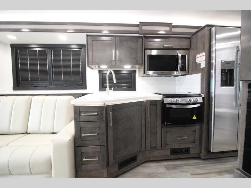 The Jayco Precept Class A gas motorhome comes with some features that you'll only find on a Jayco product, like the JRide Plus which offers you a powerful blend of precise handling and renowned stability on the road and the Firefly total coach control system which allows you to control your coach's operations from just about anywhere with your phone. You'll find two-point lap seatbelts in all designated seating locations, and the one-piece, seamless fiberglass front and rear caps resist wear and tear over the years. The Precept also offers you the lightest yet strongest construction in the industry with the Stronghold VBL lamination on the roof, floor, and sidewalls. You'll also be very pleased to find a 120" panoramic windshield, automatic hydraulic leveling jacks, and a 5,500W generator with auto-gen start.