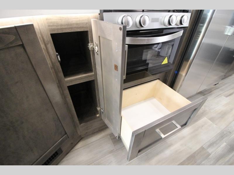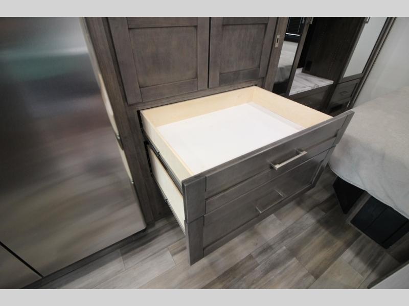 With its full-wall slide and additional slide in the living area, this Precept Class A gas motorhome is full of space! You'll have room to do the things you love, like cooking breakfast on the Furrion all-in-one cooktop and oven, relaxing on the theater sofa, cleaning up in the full bathroom, and playing card games at the booth dinette. You also won't be at a loss for entertainment because this coach offers you three TVs, and you'll even have an extra spot to relax once you turn the swivel cab seats around. In between the cab seats is a removable cockpit table that will allow you to set your glass of wine or cup of coffee down to talk, and you can add some more sleeping space to this coach by choosing the optional drop-down overhead bunk above the cab.