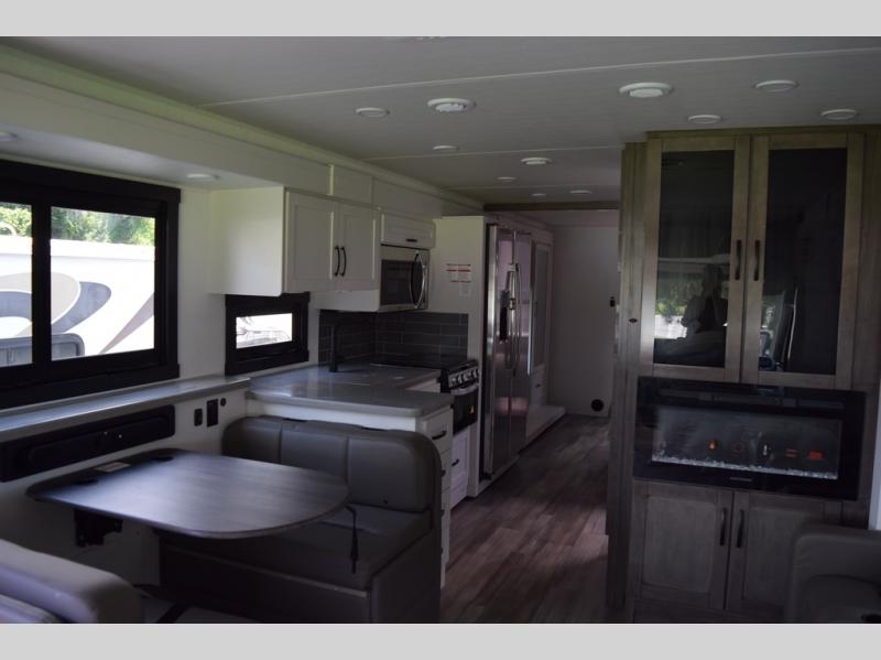 Grab your luggage, your beach towel, your hiking boots, and your favorite people and head out to a new scenic destination in this Precept Class A gas motorhome! The first thing you'll notice about this coach is how spacious it is. With a full-wall slide, a bedroom slide, and a living room slide, you'll be able to live freely. The other thing that will catch your eye is the full bathroom in the back and the half bathroom in the middle. You'll easily be able to rest on the hide-a-bed sofa, theater sofa, and booth dinette after a tiresome day, and if you want to just go straight to bed, you can lie down on the king-size bed. You can also provide your group with some extra sleeping space by adding the optional drop-down overhead bunk above the cab.