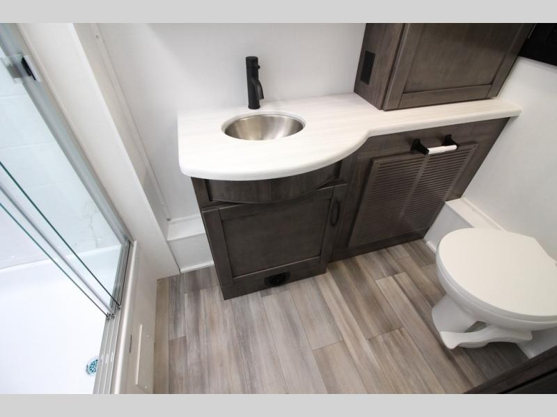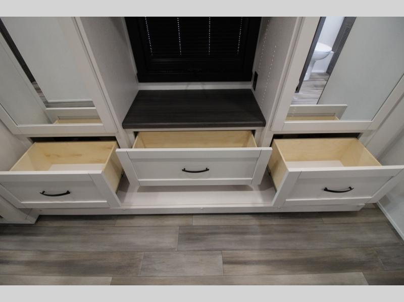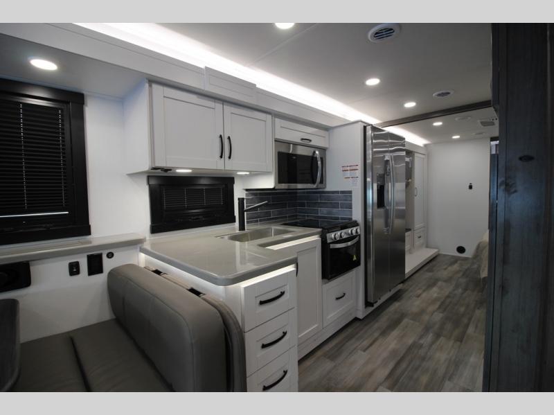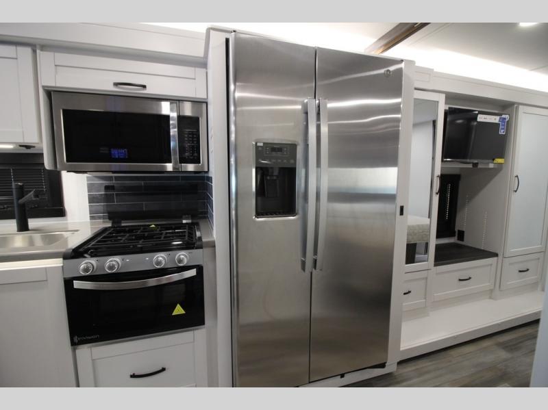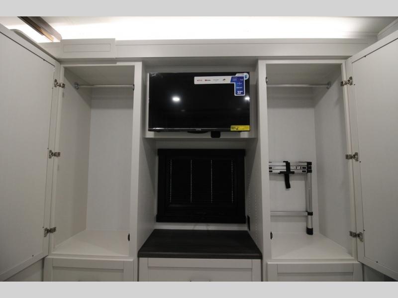 Grab your luggage, your beach towel, your hiking boots, and your favorite people and head out to a new scenic destination in this Precept Class A gas motorhome! The first thing you'll notice about this coach is how spacious it is. With a full-wall slide, a bedroom slide, and a living room slide, you'll be able to live freely. The other thing that will catch your eye is the full bathroom in the back and the half bathroom in the middle. You'll easily be able to rest on the hide-a-bed sofa, theater sofa, and booth dinette after a tiresome day, and if you want to just go straight to bed, you can lie down on the king-size bed. You can also provide your group with some extra sleeping space by adding the optional drop-down overhead bunk above the cab.
