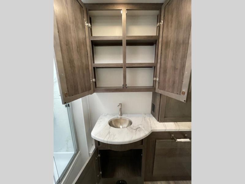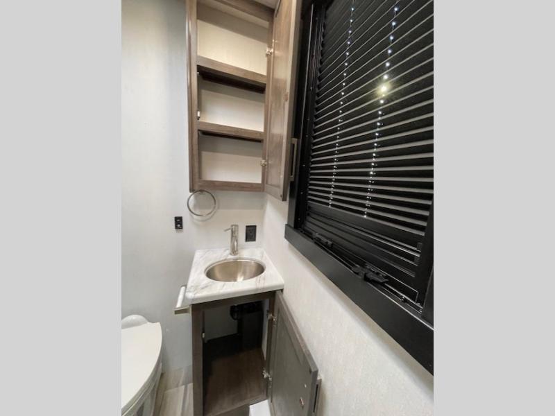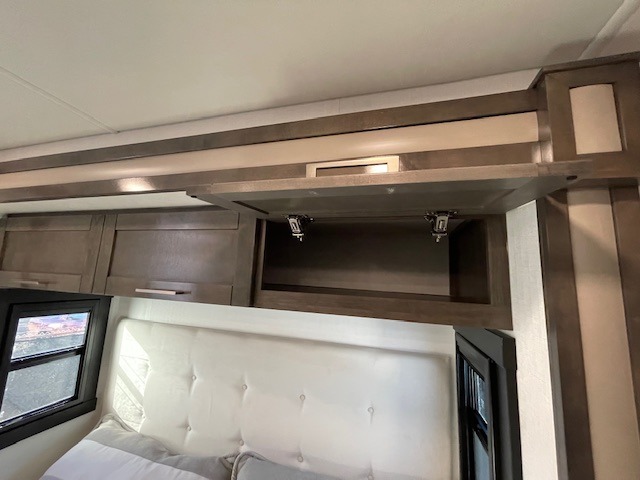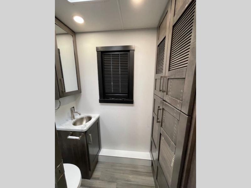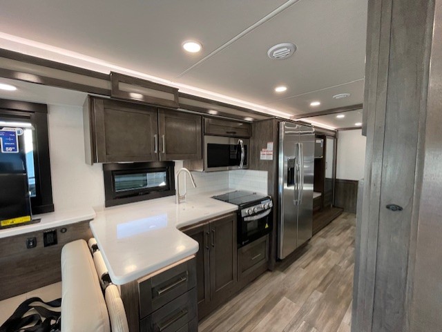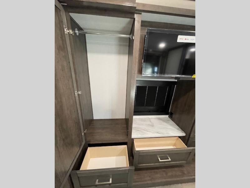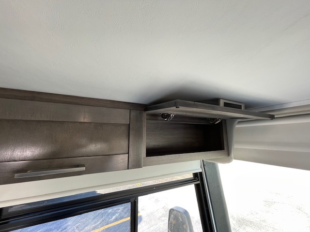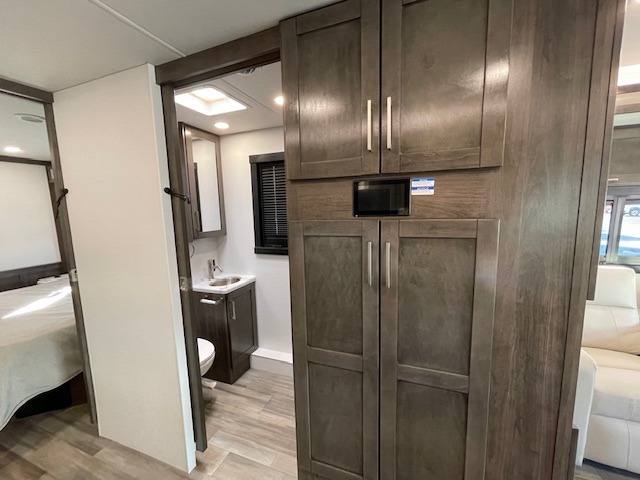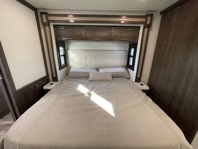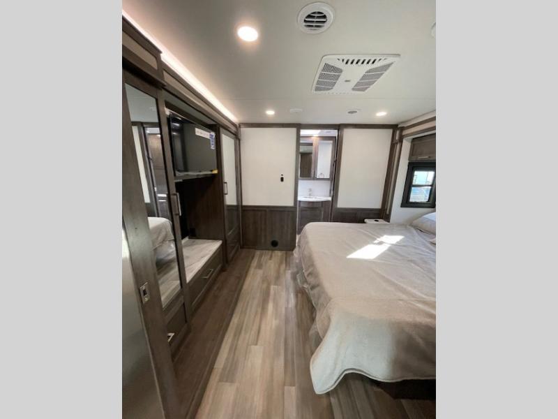 Grab your luggage, your beach towel, your hiking boots, and your favorite people and head out to a new scenic destination in this Precept Class A gas motorhome! The first thing you'll notice about this coach is how spacious it is. With a full-wall slide, a bedroom slide, and a living room slide, you'll be able to live freely. The other thing that will catch your eye is the full bathroom in the back and the half bathroom in the middle. You'll easily be able to rest on the hide-a-bed sofa, theater sofa, and booth dinette after a tiresome day, and if you want to just go straight to bed, you can lie down on the king-size bed. You can also provide your group with some extra sleeping space by adding the optional drop-down overhead bunk above the cab.