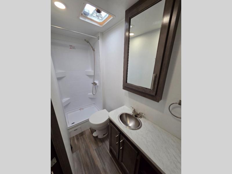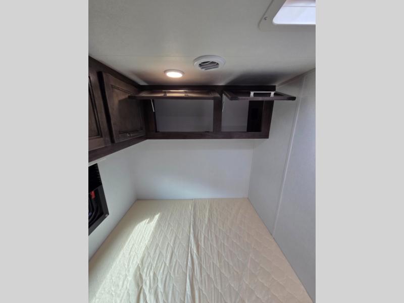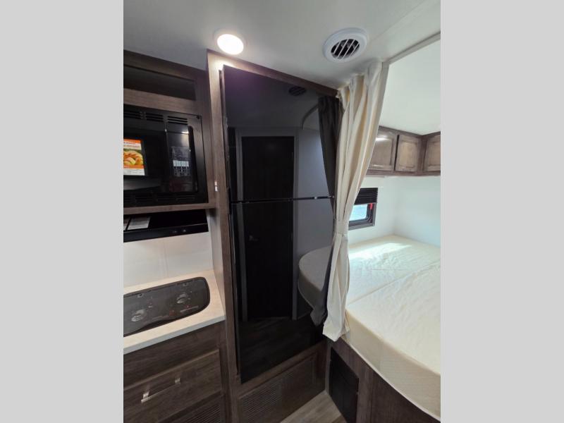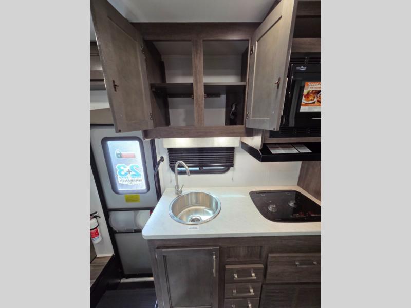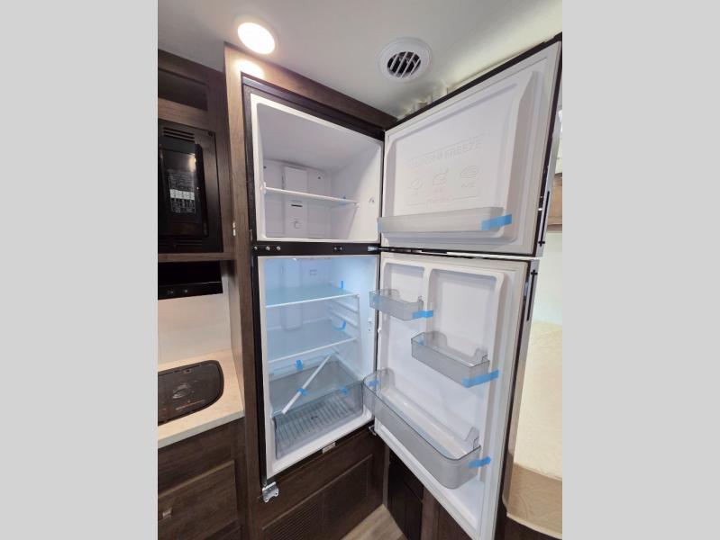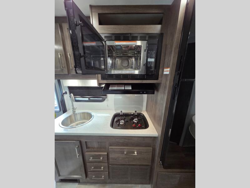 This coach will feel just like home with its fixed RV queen bed, full bath, and additional sleeping space on the dinette and cab-over bunk! The two burner cooktop with a flush cover and the convection microwave will let you create your best meals, and you can take your plate outdoors to sit under the 16' power awning if the weather is nice! There are also multiple overhead cabinets to keep your things organized, along with a wardrobe!