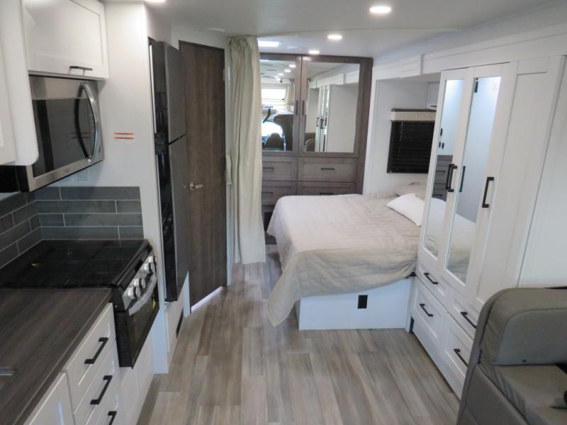 Easily load up and head out for an adventure in this Redhawk with sleeping space for five, a full bathroom, and kitchen amenities to stay fed the whole trip. Once at your campsite, easily let out the slide and the 16' electric awning and plan your next activity. You an use the full bath, make a meal in the kitchen with the Furrion all-in-one cooktop and oven, plus the residential-size microwave, and grab your beverage from the 10 cu. ft. refrigerator. The driver and passenger seats swivel for more interior seating, and if you like, choose the theater seating option in place of the U-shaped dinette.