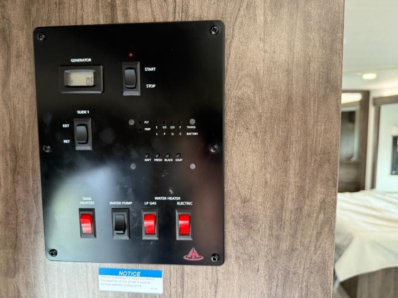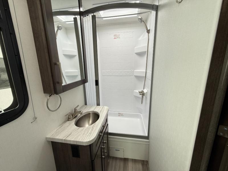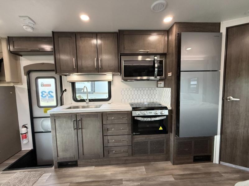 Easily load up and head out for an adventure in this Redhawk with sleeping space for five, a full bathroom, and kitchen amenities to stay fed the whole trip. Once at your campsite, easily let out the slide and the 16' electric awning and plan your next activity. You an use the full bath, make a meal in the kitchen with the Furrion all-in-one cooktop and oven, plus the residential-size microwave, and grab your beverage from the 10 cu. ft. refrigerator. The driver and passenger seats swivel for more interior seating, and if you like, choose the theater seating option in place of the U-shaped dinette.