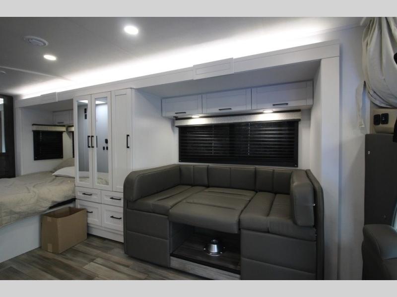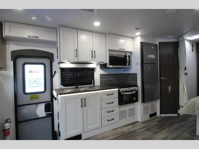 Easily load up and head out for an adventure in this Redhawk with sleeping space for five, a full bathroom, and kitchen amenities to stay fed the whole trip. Once at your campsite, easily let out the slide and the 16' electric awning and plan your next activity. You an use the full bath, make a meal in the kitchen with the Furrion all-in-one cooktop and oven, plus the residential-size microwave, and grab your beverage from the 10 cu. ft. refrigerator. The driver and passenger seats swivel for more interior seating, and if you like, choose the theater seating option in place of the U-shaped dinette.