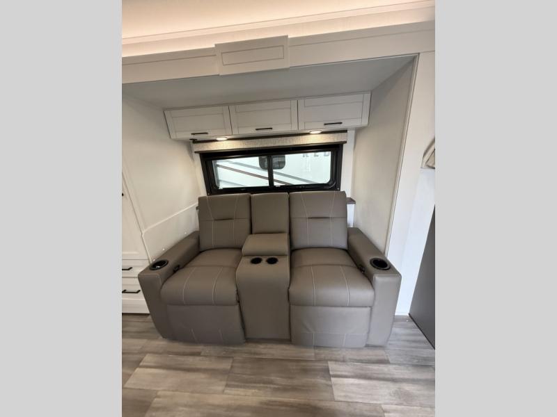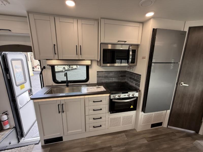 Inside, the Redhawk offers touches that feel right at home, starting with hardwood cabinet doors and drawers, reduced visible stiles for a clean finish and a full-size residential microwave. The dining area features Jayco’s exclusive legless dinette table, which is sturdy, easy to operate, and quickly converts from mealtime to bedtime mode. There are seatbelts in every seating location, and child safety tethers in the dinette, ensuring your family's safety during travel. Up front, the 9-inch Sony® infotainment system includes Apple® CarPlay™, Android Auto™ and a tilt feature, offering a bright, easy-to-read display that helps you stay connected and focused on the road. From its smart safety features to elevated design inside and out, the Redhawk Class C delivers a first-class RV experience that’s ready for the road ahead!