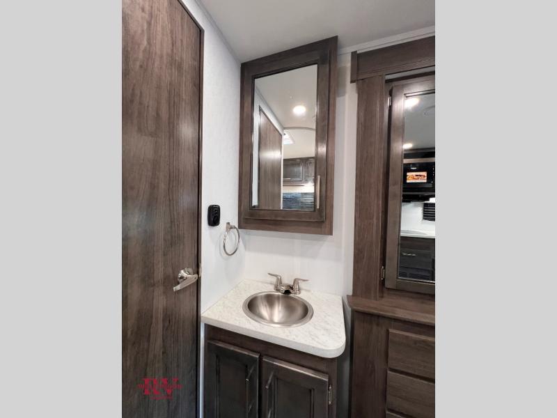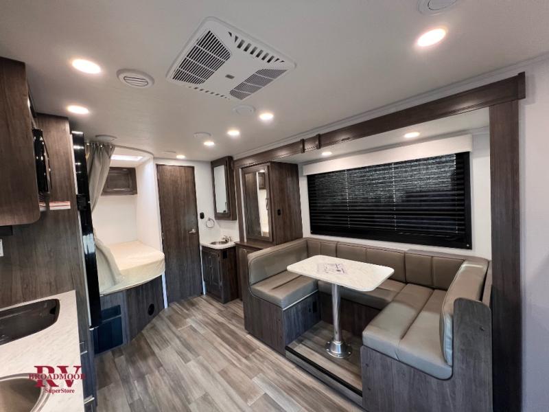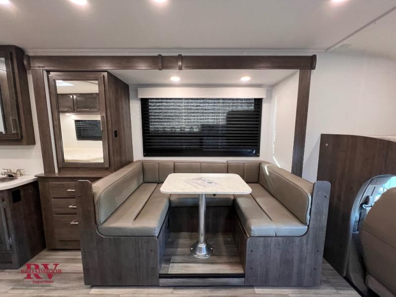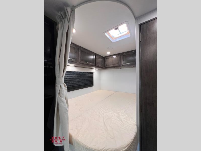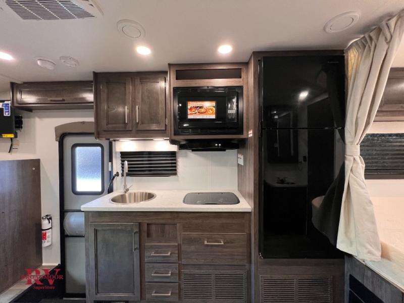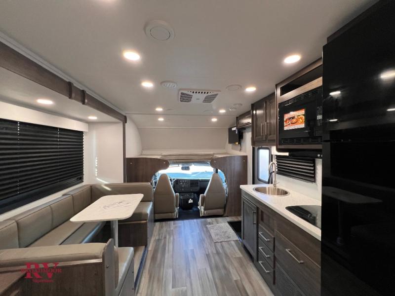 Your small crew will love traveling in this motorhome! Everyone will enjoy a good night's rest between the RV queen bed, the bunk over cab, and even the 42" x 76" U-shaped dinette once converted. The rear corner bathroom has a 24" x 32" shower and toilet together with a vanity sink just outside. You can prepare your best meals with the two burner cooktop, store any leftovers in the 10 cu. ft. 12V refrigerator, and clean up in a snap with the stainless steel sink, plus there is a convection microwave oven for those nights when you don't feel like cooking!
