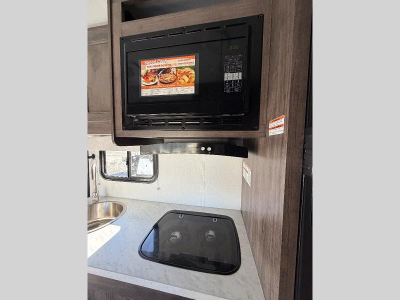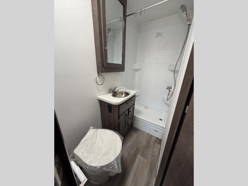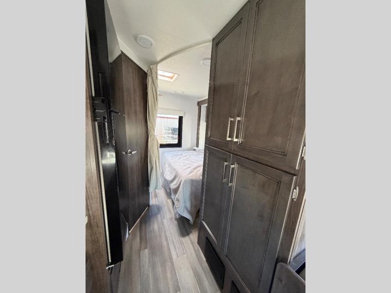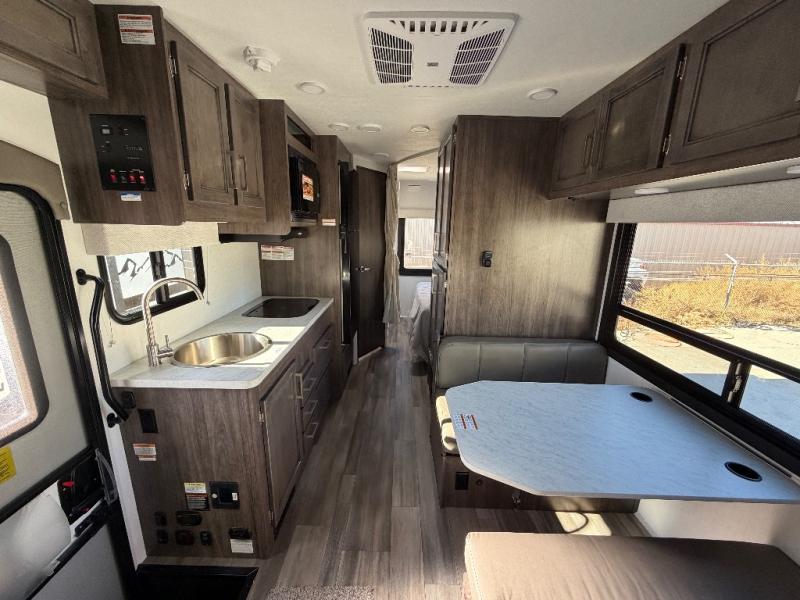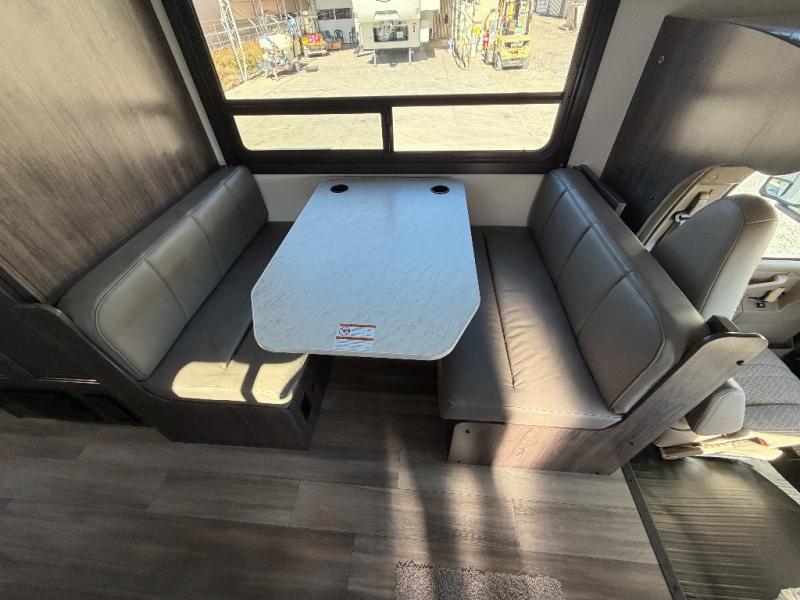 There's a comfortable place to sleep for everyone in this motorhome! From the corner 60" x 70" queen bed that slides out to the bunk over cab, and even the 42" x 70" booth dinette once converted. You can store your favorite snacks and hang up your clothes in the wardrobe/pantry. The chef can prepare delicious meals with the two burner cooktop and if there happens to be any leftovers then they can be stored in the 10 cu. ft. 12V refrigerator. The rear corner bathroom has a 24" x 36" shower that you are sure to enjoy after a long day of traveling!