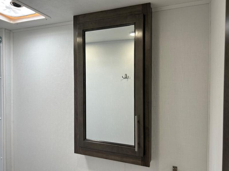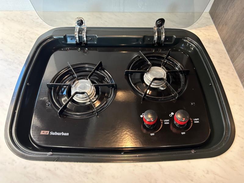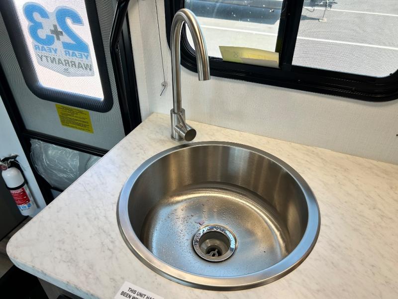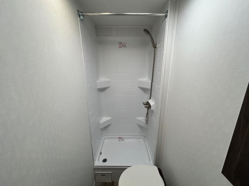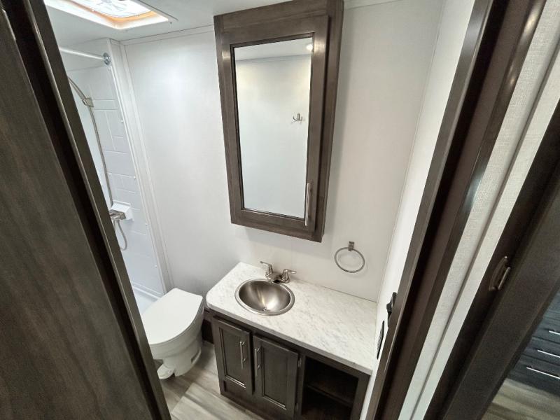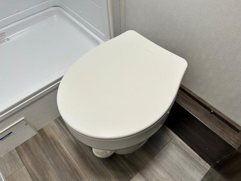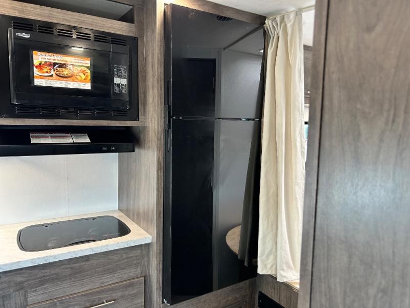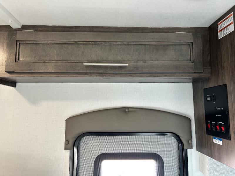 This coach will feel just like home with its fixed RV queen bed, full bath, and additional sleeping space on the dinette and cab-over bunk! The two burner cooktop with a flush cover and the convection microwave will let you create your best meals, and you can take your plate outdoors to sit under the 16' power awning if the weather is nice! There are also multiple overhead cabinets to keep your things organized, along with a wardrobe!