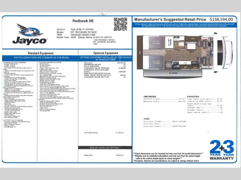 Jayco Redhawk SE Class C gas motorhome 22T highlights: