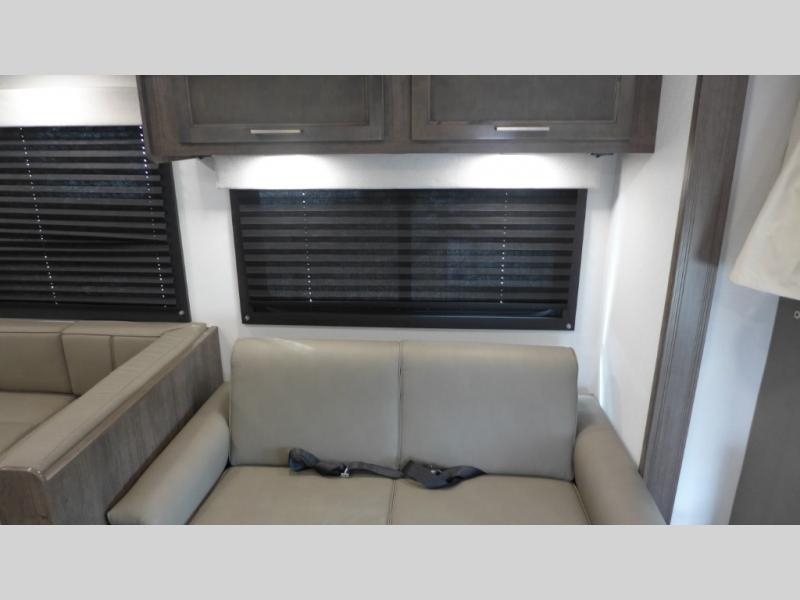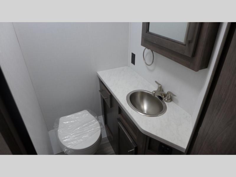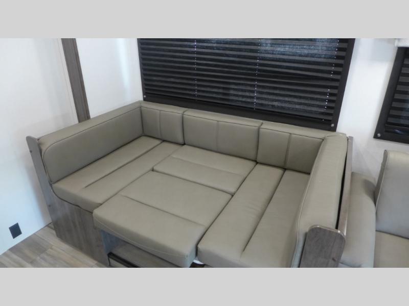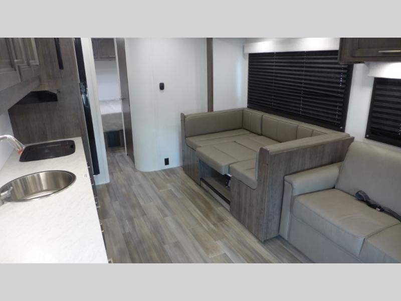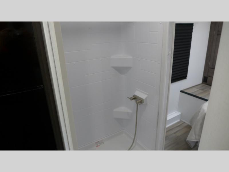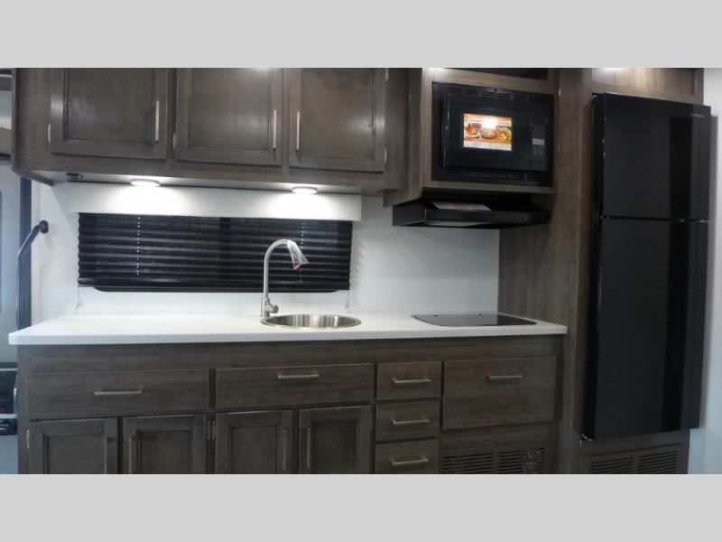 As you step inside, you’re greeted by a cozy cab-over bunk, perfect for accommodating an extra guest in comfort. The slide-out provides ample living space and houses a 42" x 74" U-dinette, ideal for enjoying meals, playing board games, or simply gathering with friends and family. Also, in the slide-out is a 60" jack-knife sofa, offering a comfortable place to relax, and both the dinette and sofa can easily convert into additional sleeping space if needed. Across from the living area, the well-equipped kitchen includes a stainless-steel sink, a convection microwave oven, a two-burner cooktop with flush cover, and a 10-cu. ft. refrigerator, giving you everything you need to cook with ease while on the road. The bathroom provides a 24" x 36" shower and a foot-flush toilet for added convenience. At the rear, the private bedroom offers a 60" x 74" queen bed for restful sleep, along with a wardrobe and overhead cabinets to keep your clothing and essentials neatly organized.