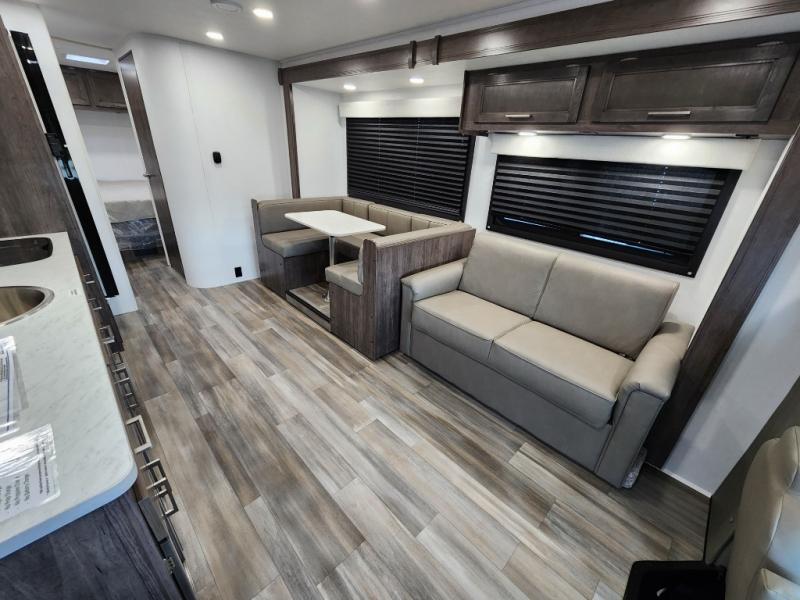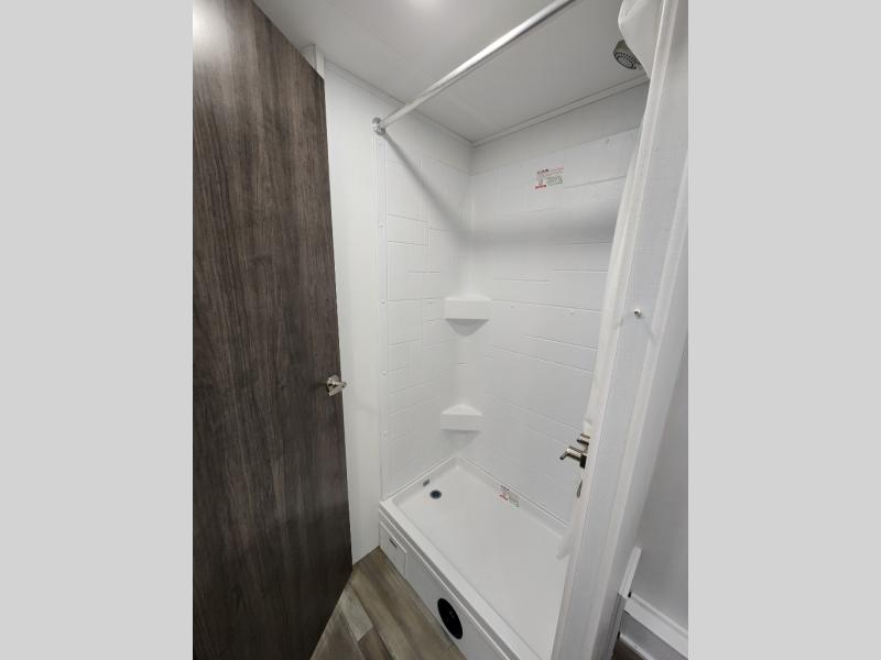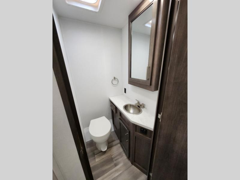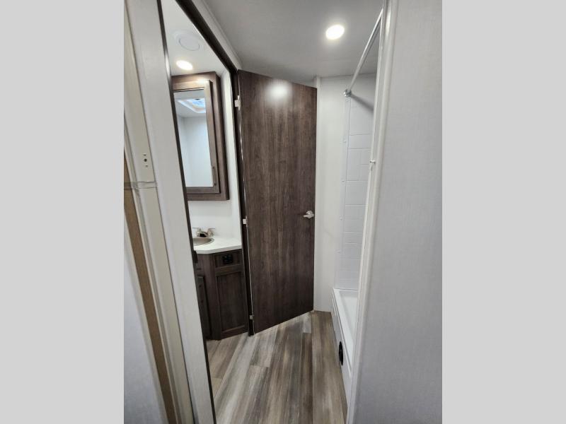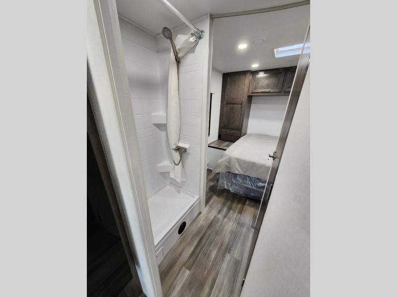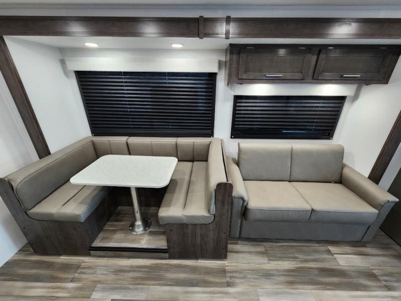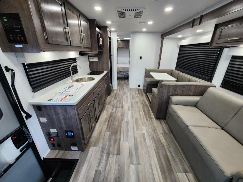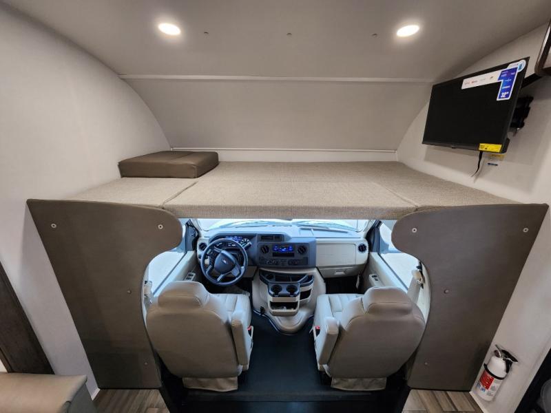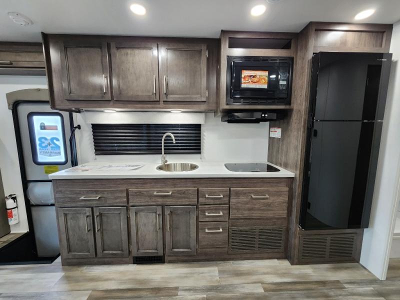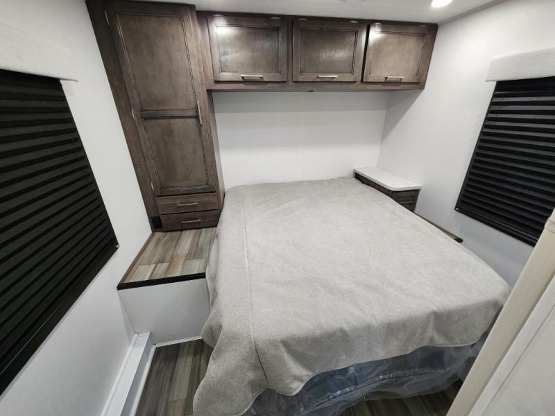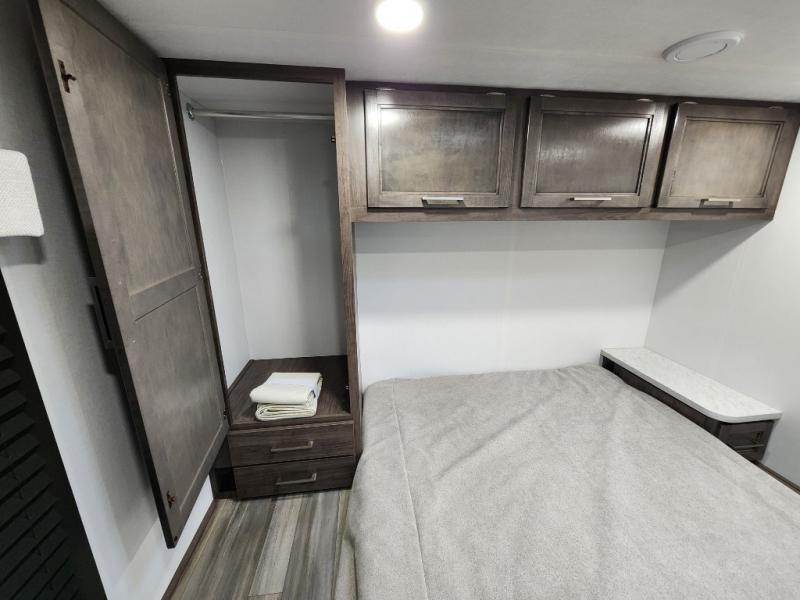As you step inside, you’re greeted by a cozy cab-over bunk, perfect for accommodating an extra guest in comfort. The slide-out provides ample living space and houses a 42" x 74" U-dinette, ideal for enjoying meals, playing board games, or simply gathering with friends and family. Also, in the slide-out is a 60" jack-knife sofa, offering a comfortable place to relax, and both the dinette and sofa can easily convert into additional sleeping space if needed. Across from the living area, the well-equipped kitchen includes a stainless-steel sink, a convection microwave oven, a two-burner cooktop with flush cover, and a 10-cu. ft. refrigerator, giving you everything you need to cook with ease while on the road. The bathroom provides a 24" x 36" shower and a foot-flush toilet for added convenience. At the rear, the private bedroom offers a 60" x 74" queen bed for restful sleep, along with a wardrobe and overhead cabinets to keep your clothing and essentials neatly organized.