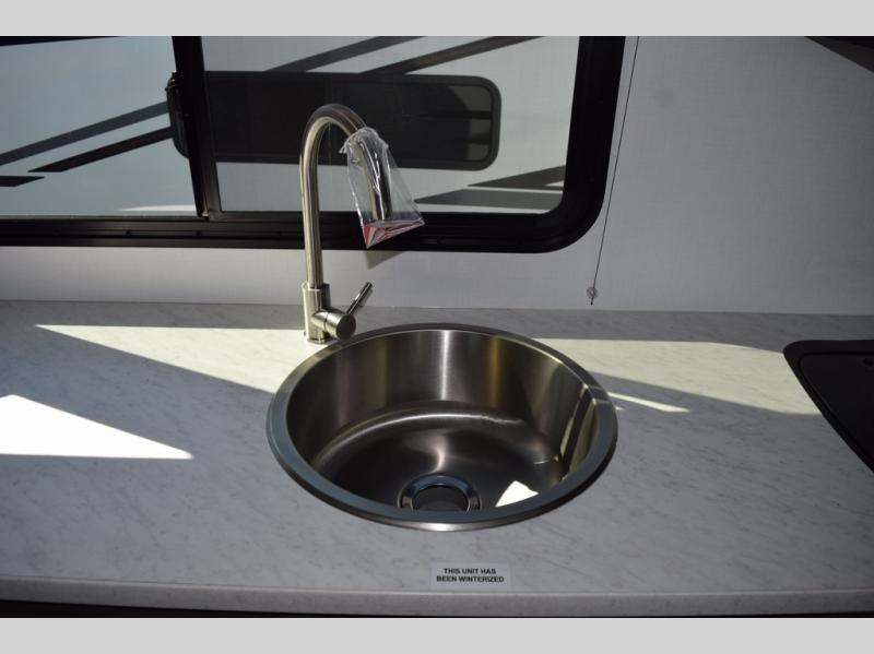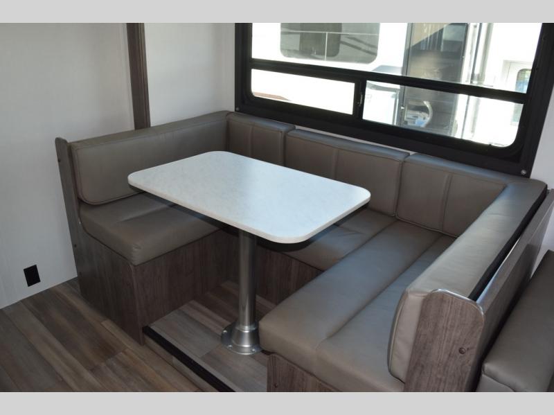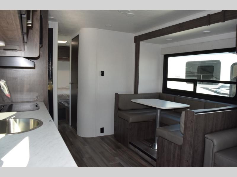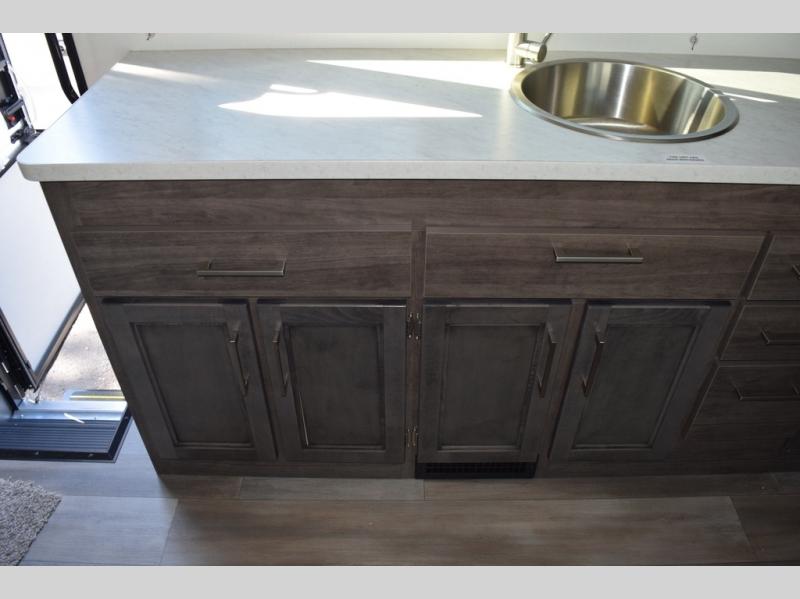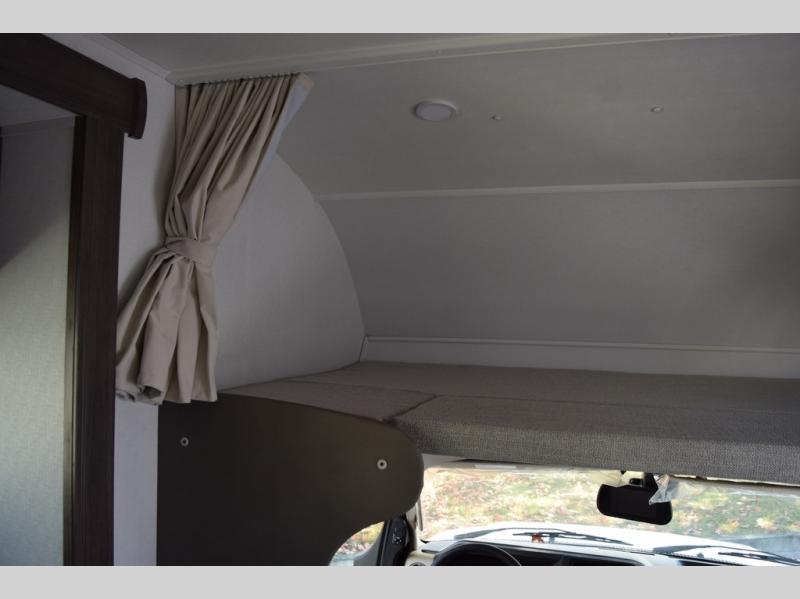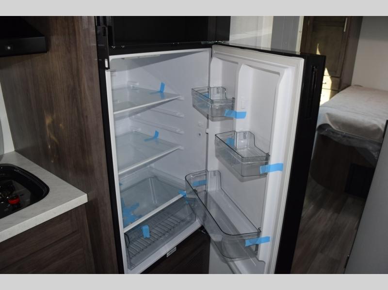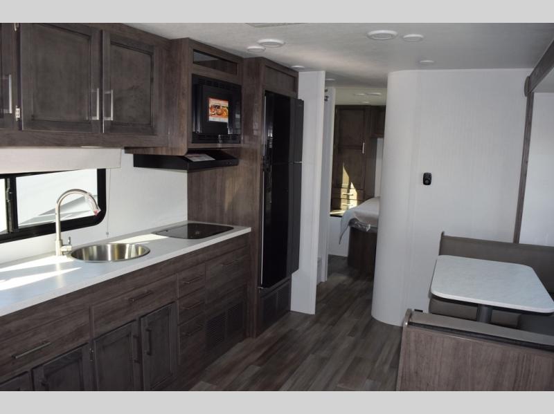 As you step inside, you’re greeted by a cozy cab-over bunk, perfect for accommodating an extra guest in comfort. The slide-out provides ample living space and houses a 42" x 74" U-dinette, ideal for enjoying meals, playing board games, or simply gathering with friends and family. Also, in the slide-out is a 60" jack-knife sofa, offering a comfortable place to relax, and both the dinette and sofa can easily convert into additional sleeping space if needed. Across from the living area, the well-equipped kitchen includes a stainless-steel sink, a convection microwave oven, a two-burner cooktop with flush cover, and a 10-cu. ft. refrigerator, giving you everything you need to cook with ease while on the road. The bathroom provides a 24" x 36" shower and a foot-flush toilet for added convenience. At the rear, the private bedroom offers a 60" x 74" queen bed for restful sleep, along with a wardrobe and overhead cabinets to keep your clothing and essentials neatly organized.